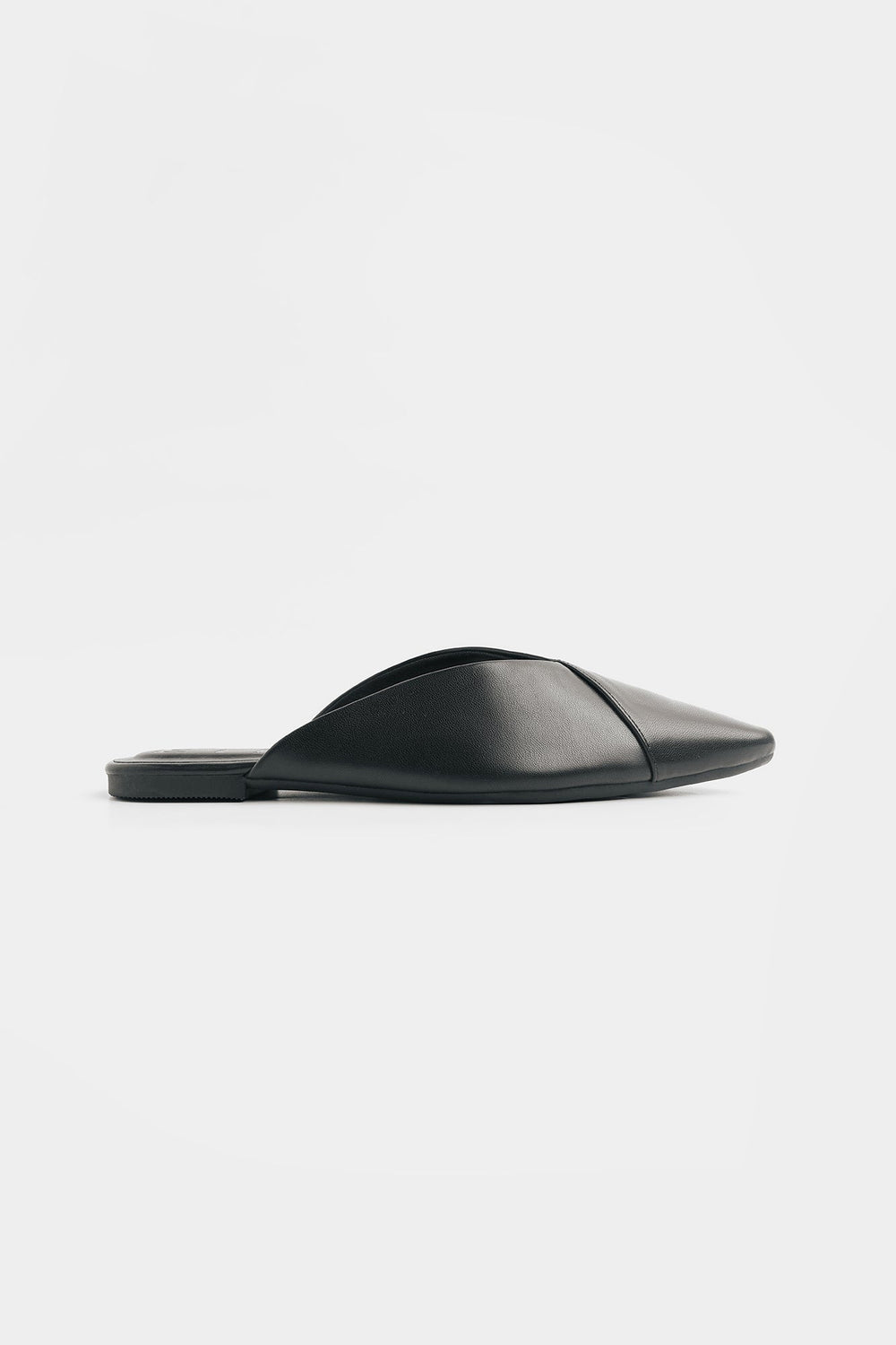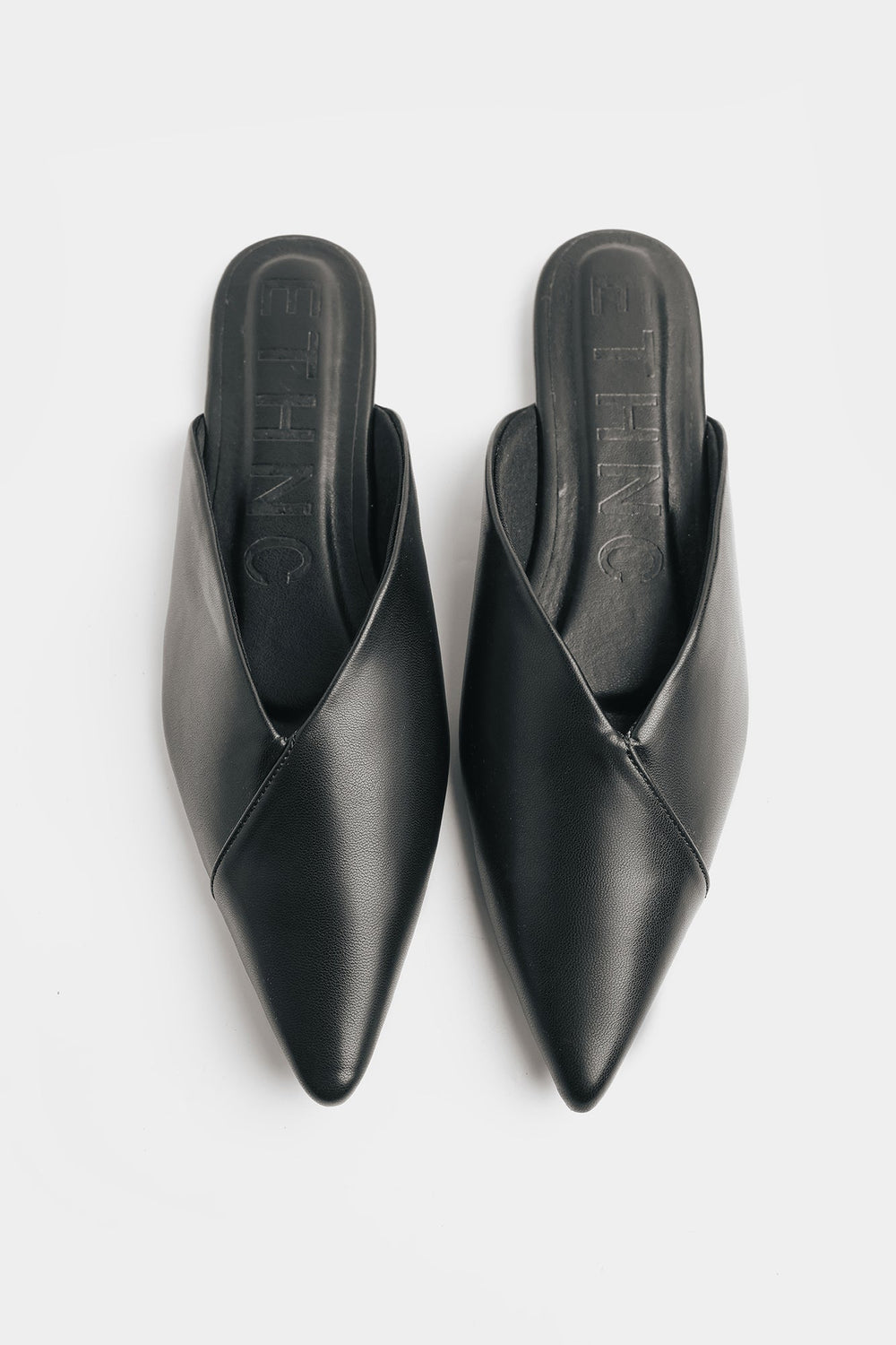 These are sleek, black pointed-toe mules featuring a minimalistic and contemporary design. they have a sharp V-cut vamp that adds a modern edge. Their backless, slip-on style makes them both fashionable and easy to wear—perfect for everyday styling or a smart-casual look.