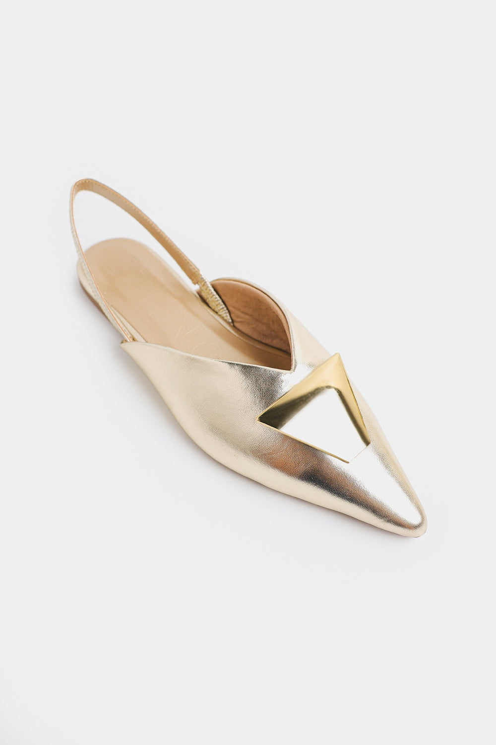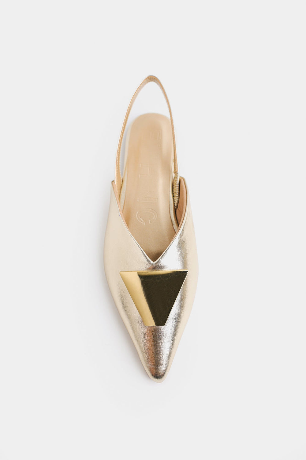 Make a glamorous, architectural statement with these striking gold slingback pumps. These pointed-toe slingbacks are crafted from a brilliant metallic finish that catches the light beautifully. The design is instantly modernized by a bold, inverted gold triangle detail placed prominently at the tip of the toe. This piece of footwear perfectly combines classic elegance with a contemporary, geometric edge, making it an ideal choice for enhancing formal or festive attire.