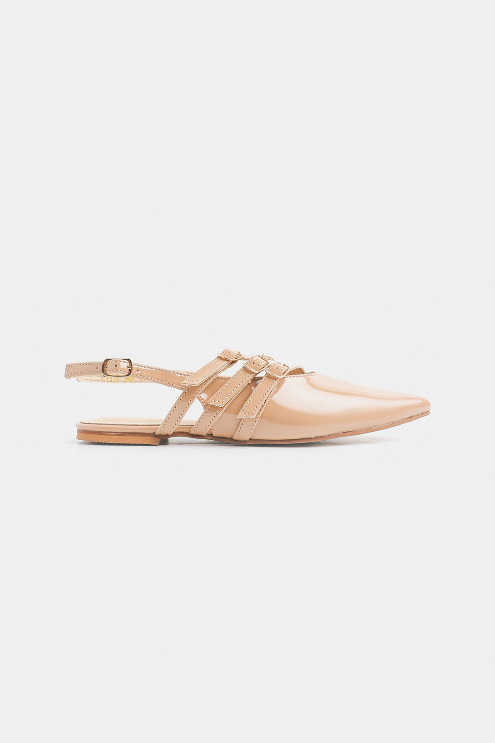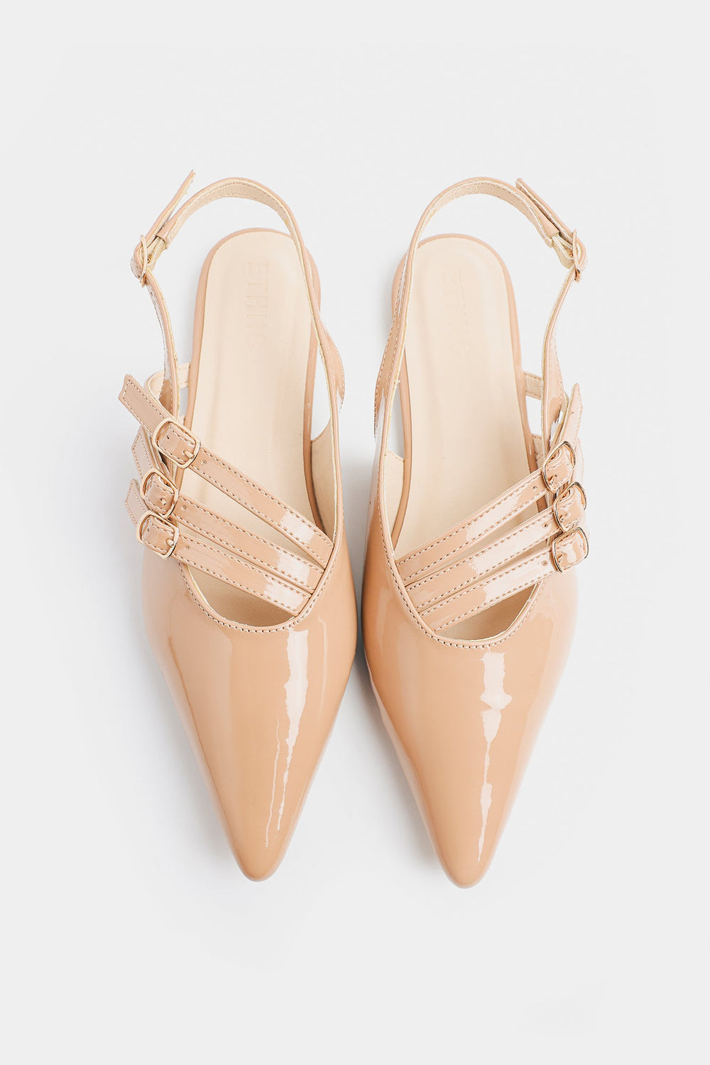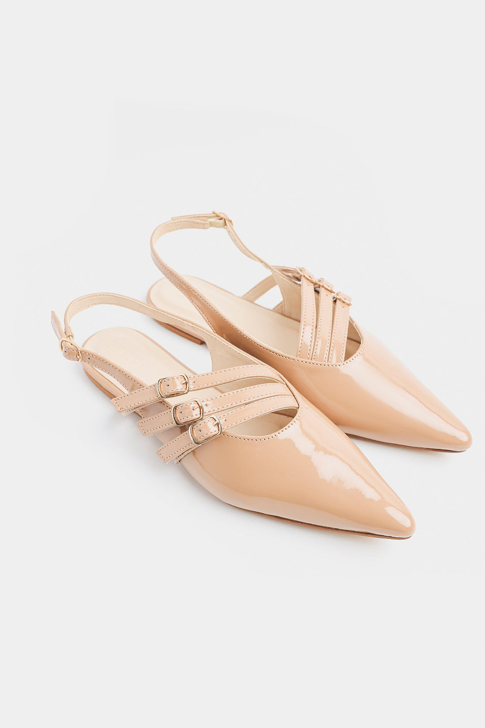 Make a glamorous statement with these beige patent slingback pumps. The peanut beige color and high-shine patent finish give this shoe an undeniable aura of boldness and sophistication. The design features a sharp pointed toe and an eye-catching front detail: three parallel straps with matching silver-toned buckles cross elegantly over the vamp. Complemented by an adjustable slingback for a secure fit, these heels are the perfect blend of edgy hardware and polished glamour, ideal for elevating any evening look.