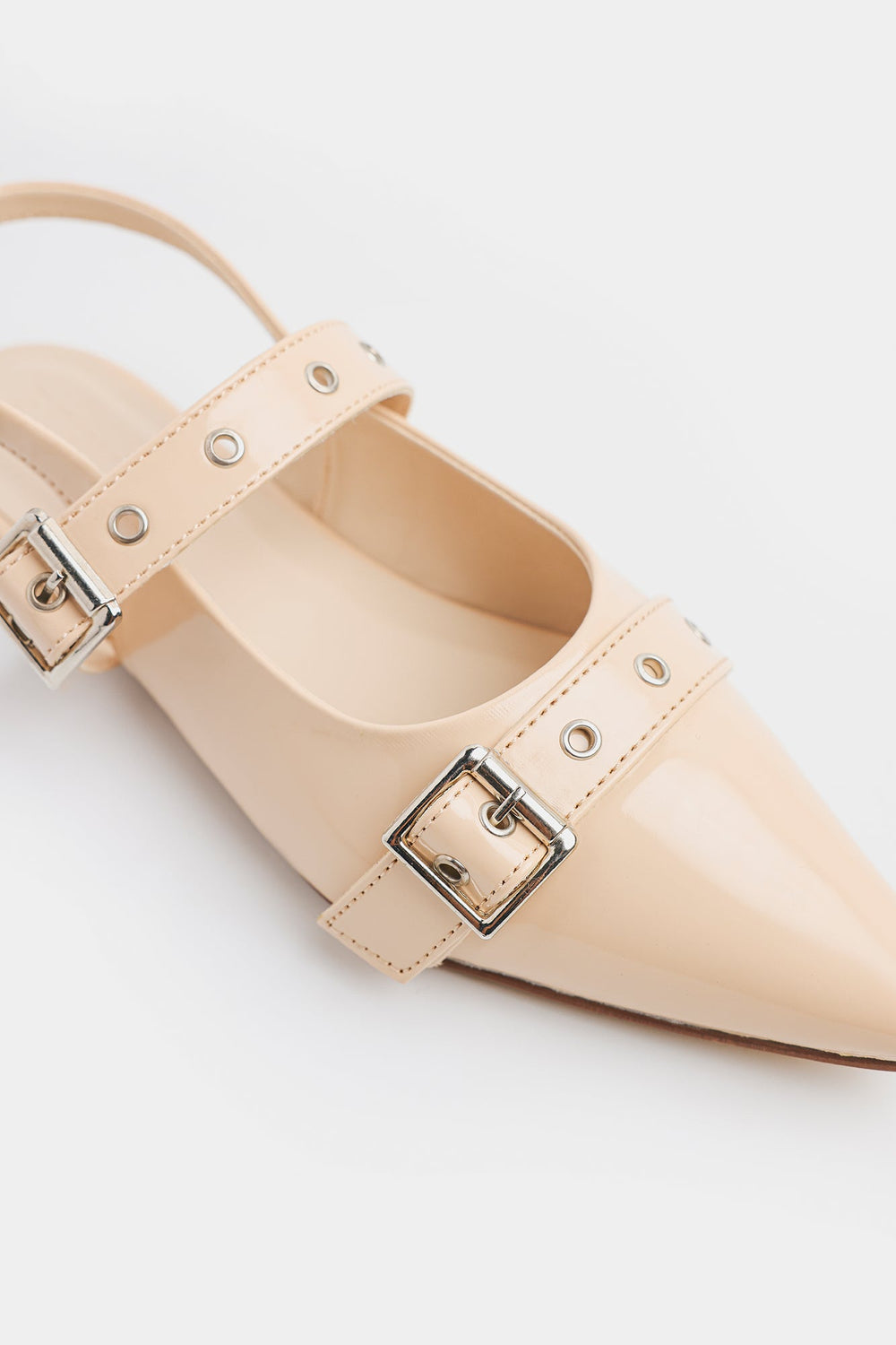 Unite playful edge and polished style with these captivating buckle slingback flats. Crafted in a soft pale beige patent finish, the glossy surface perfectly highlights the modern design details. The refined pointed toe is complemented by two distinct straps across the foot: one across the vamp and one higher up the arch. Both straps are adorned with bold silver-toned buckles and metallic eyelets, creating a striking, punk-inspired contrast against the delicate color. Finished with an adjustable slingback strap, these flats offer secure comfort and undeniable fashion-forward appeal.
