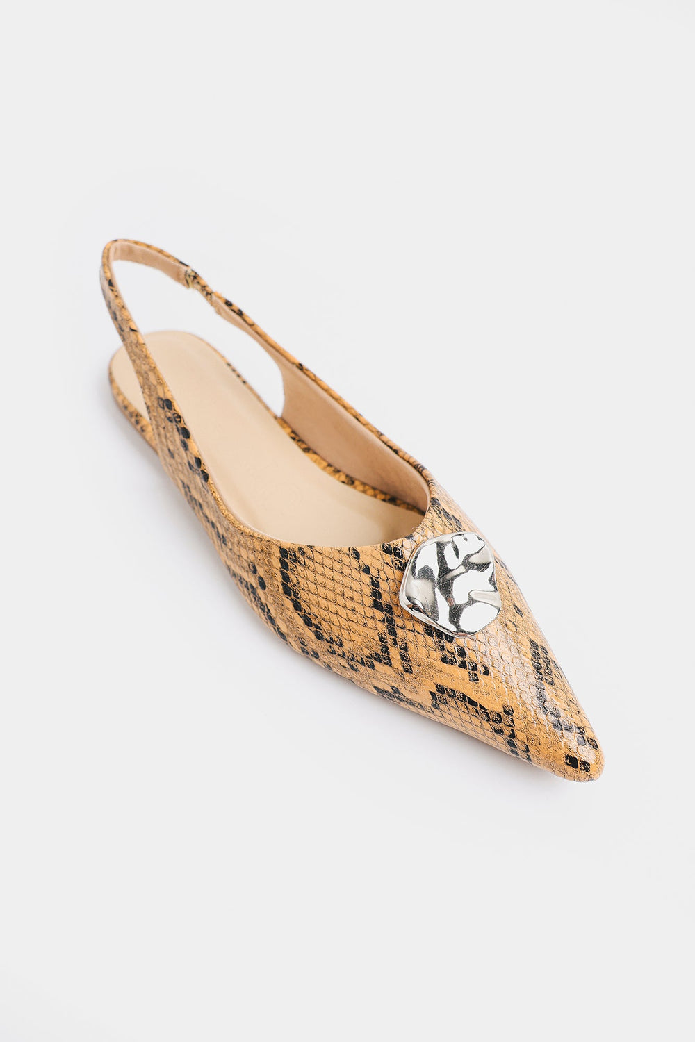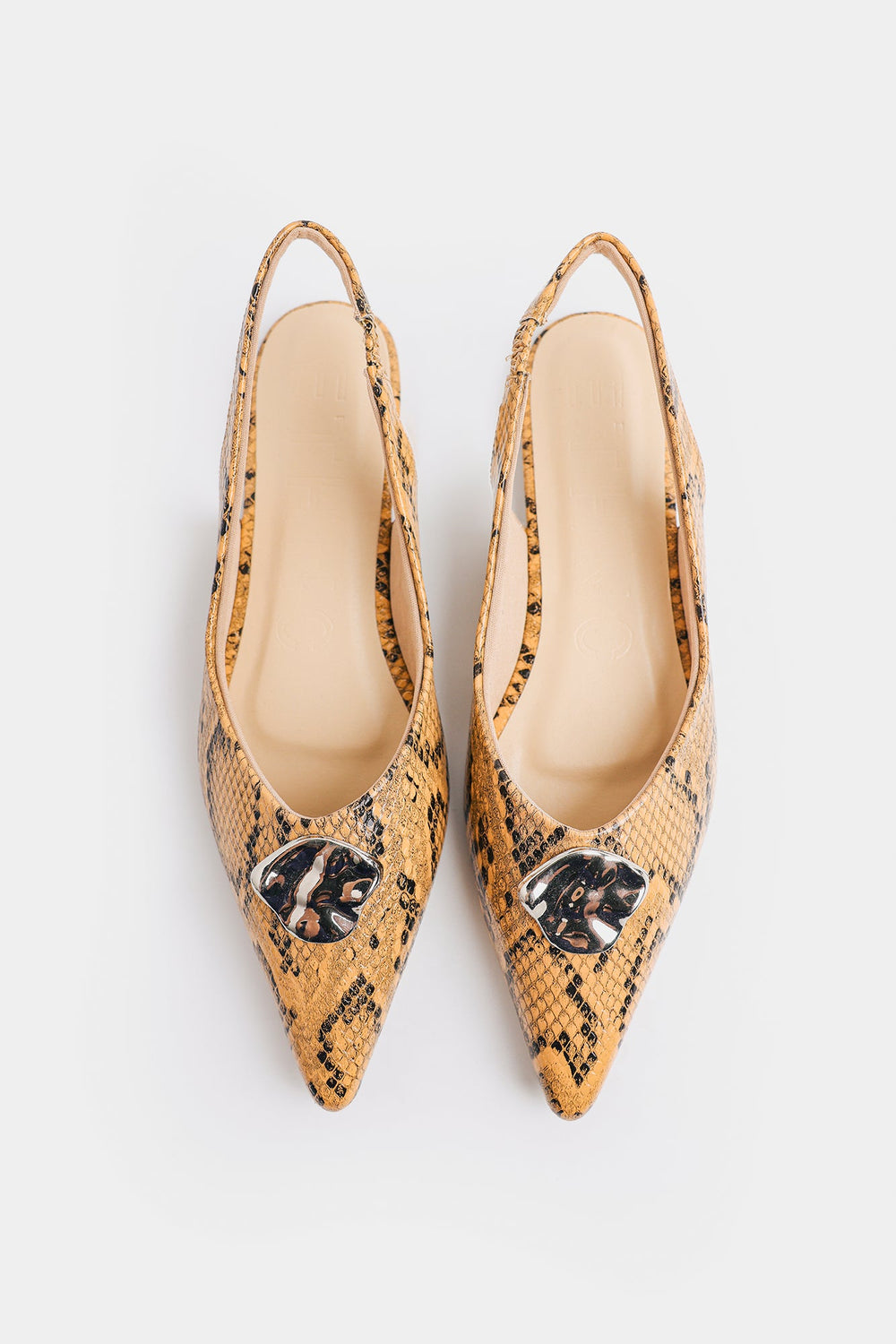 Step out in style with these eye-catching pumps! These pumps feature a beautiful snake pattern and scalloped edges, giving them a unique and elegant texture. A slingback strap ensures a secure and comfortable fit, while the pointed toe adds a touch of classic sophistication. Perfect for elevating any outfit, whether for a party or a special event.