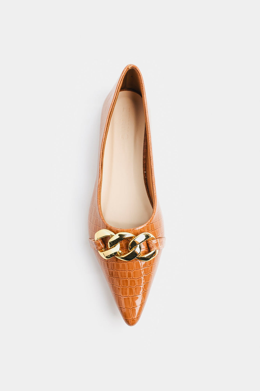 Channel luxury and modern flair with these chic pointed flats. Crafted in a rich, warm brown with a subtle texture and glossy finish, they exude high-end appeal. The elegant pointed toe is instantly elevated by a bold, oversized gold curb chain detail across the vamp, giving the shoes a striking, contemporary focus. These flats are a perfect statement piece, effortlessly blending sophistication with a touch of glamorous edge for both office and evening wear.