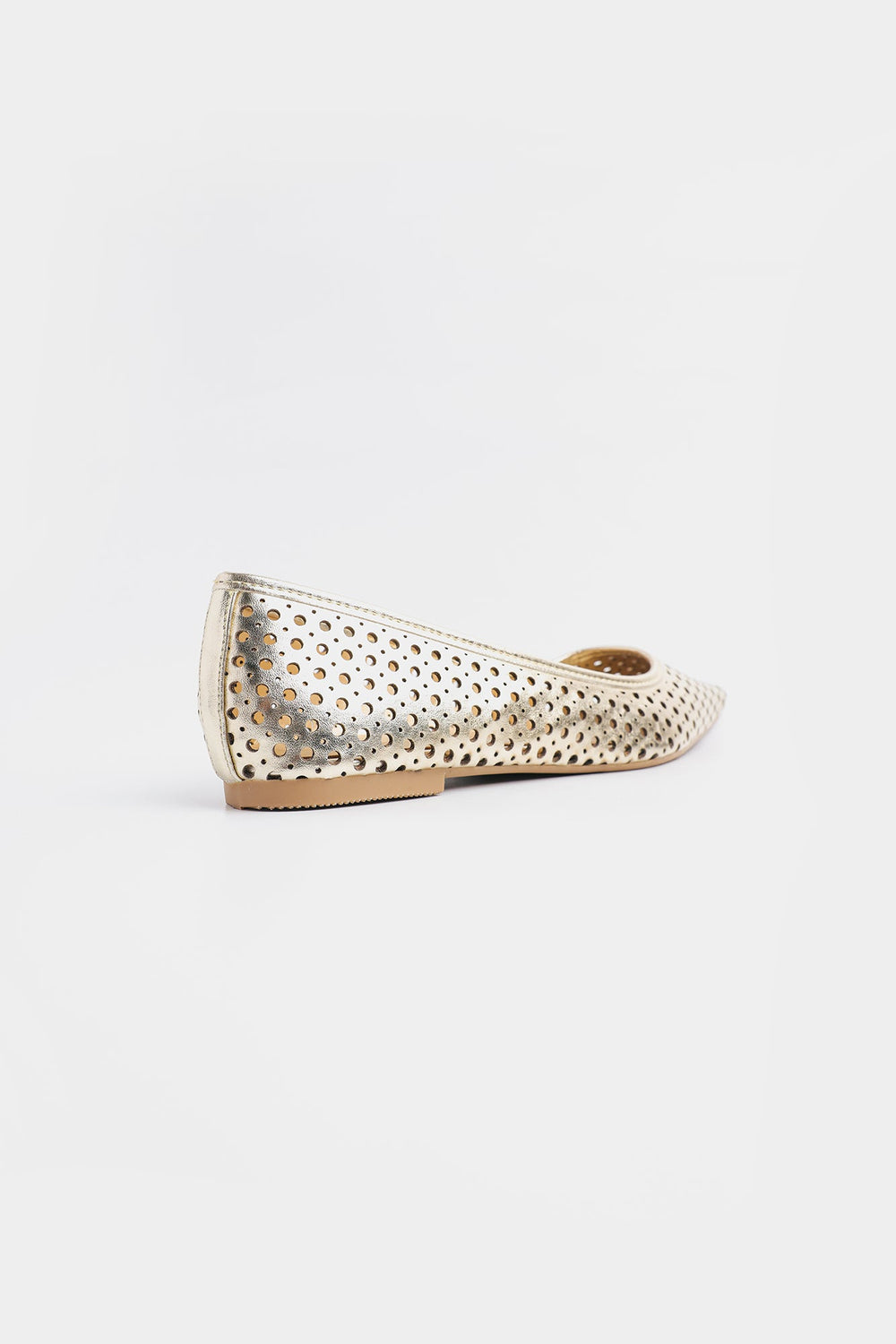 This is a stylish pointed-toe flat pump in a metallic gold finish, featuring a perforated design throughout for a chic and breathable look. The laser-cut circular holes add a contemporary, airy touch, making it ideal for both casual and semi-formal occasions. Perfect for adding a touch of glam to everyday.