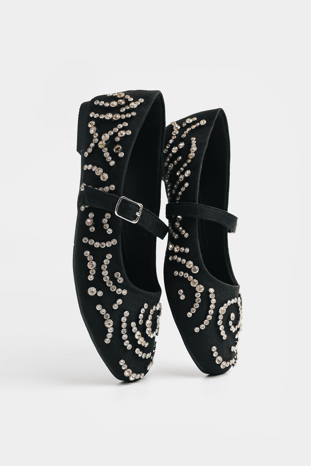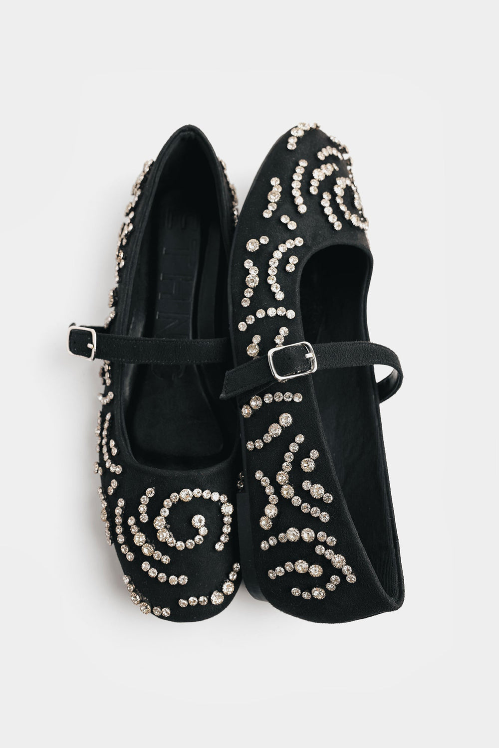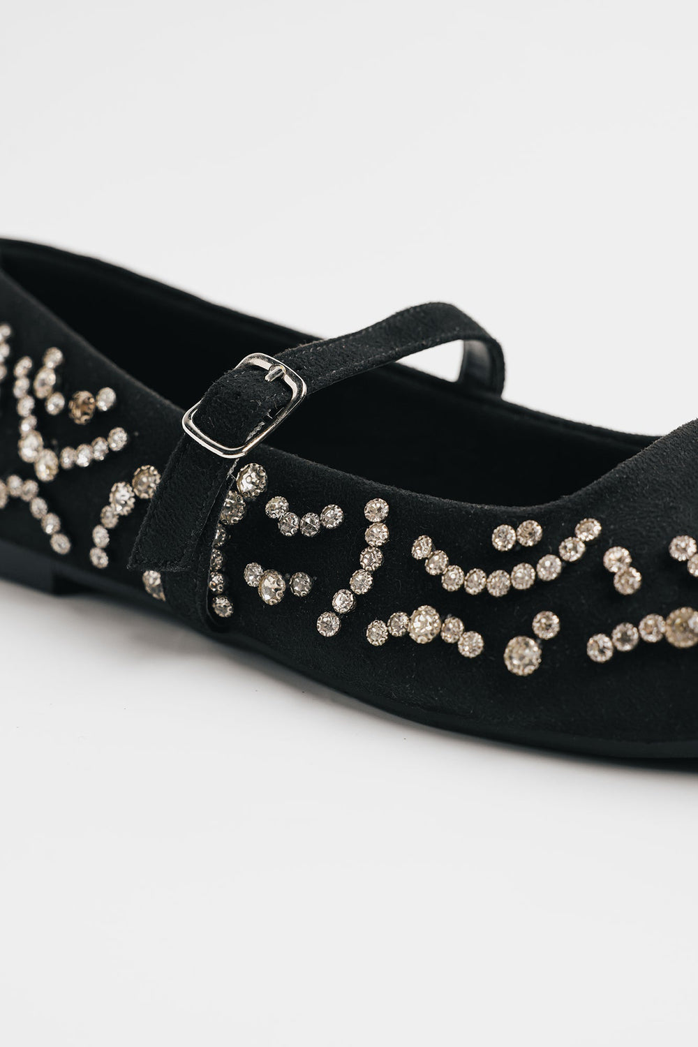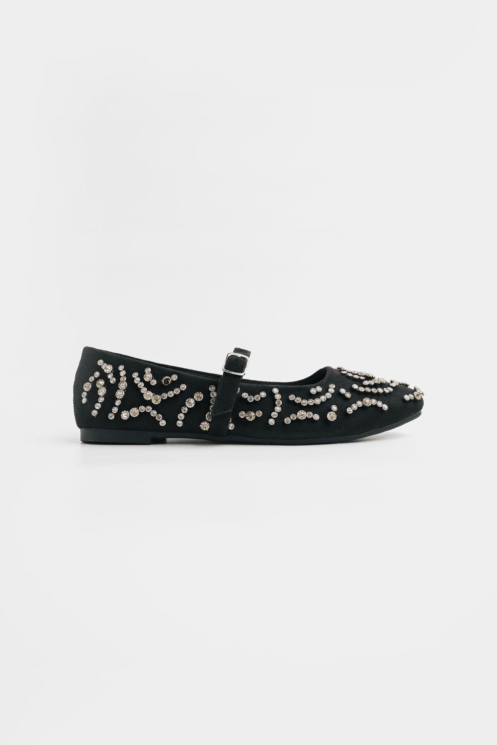 Elevate your evening wear with these stunning black embelished pumps. These shoes feature a classic silhouette with a squared toe and a slim adjustable buckle strap across the instep. The black fabric is entirely embellished with shimmering silver crystals. The crystals are arranged in an elaborate swirling, floral pattern across the entire upper of the shoe, creating a spectacular, festive look. These flats are the perfect accessory for adding glamour and sparkle to any formal outfit.