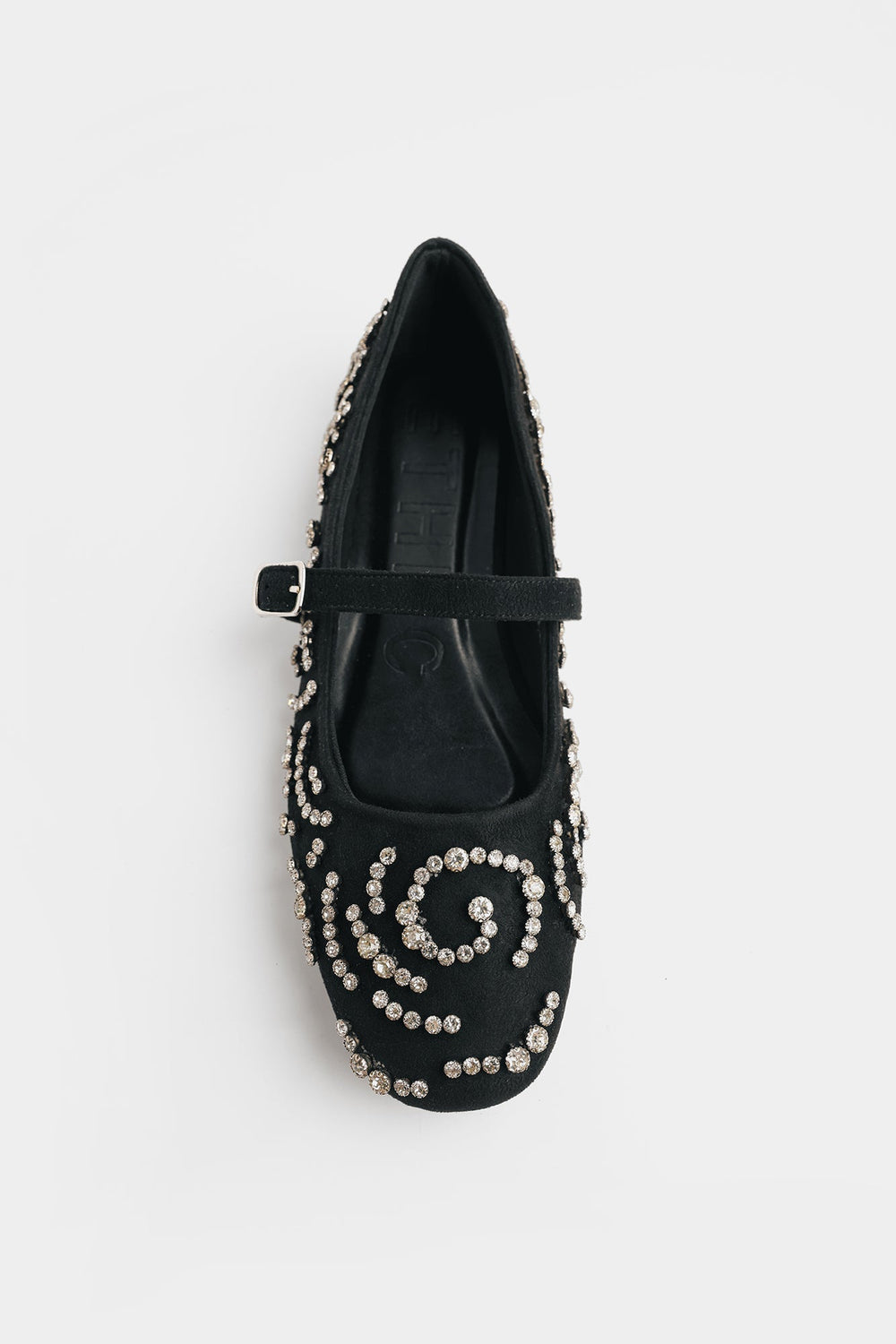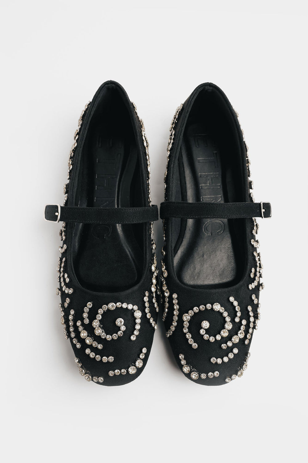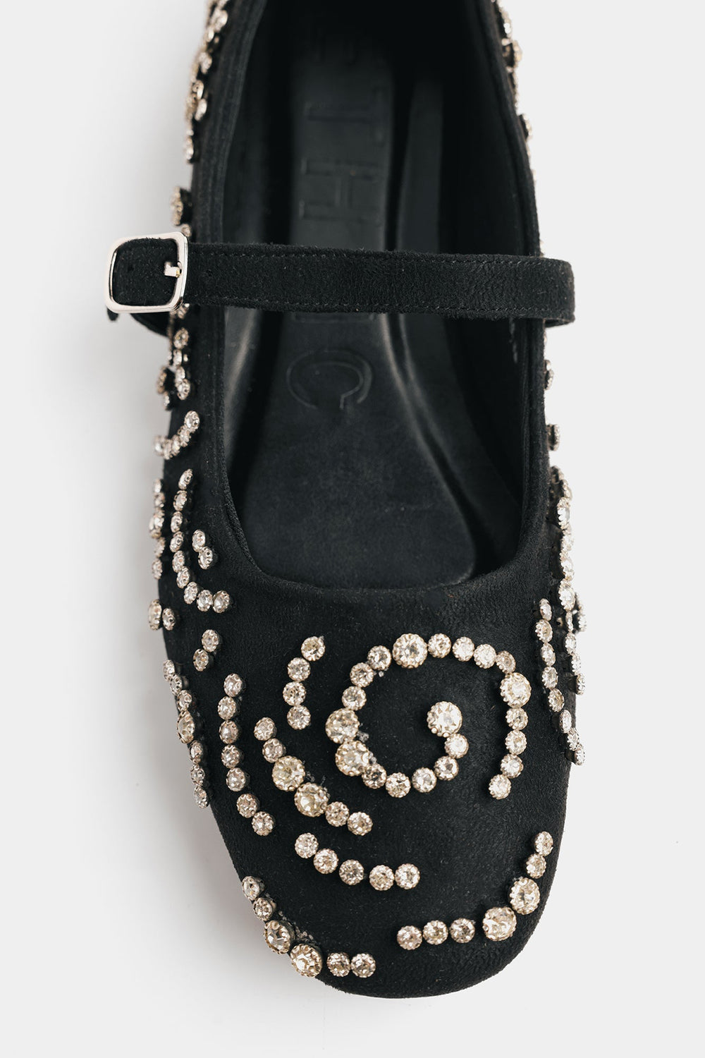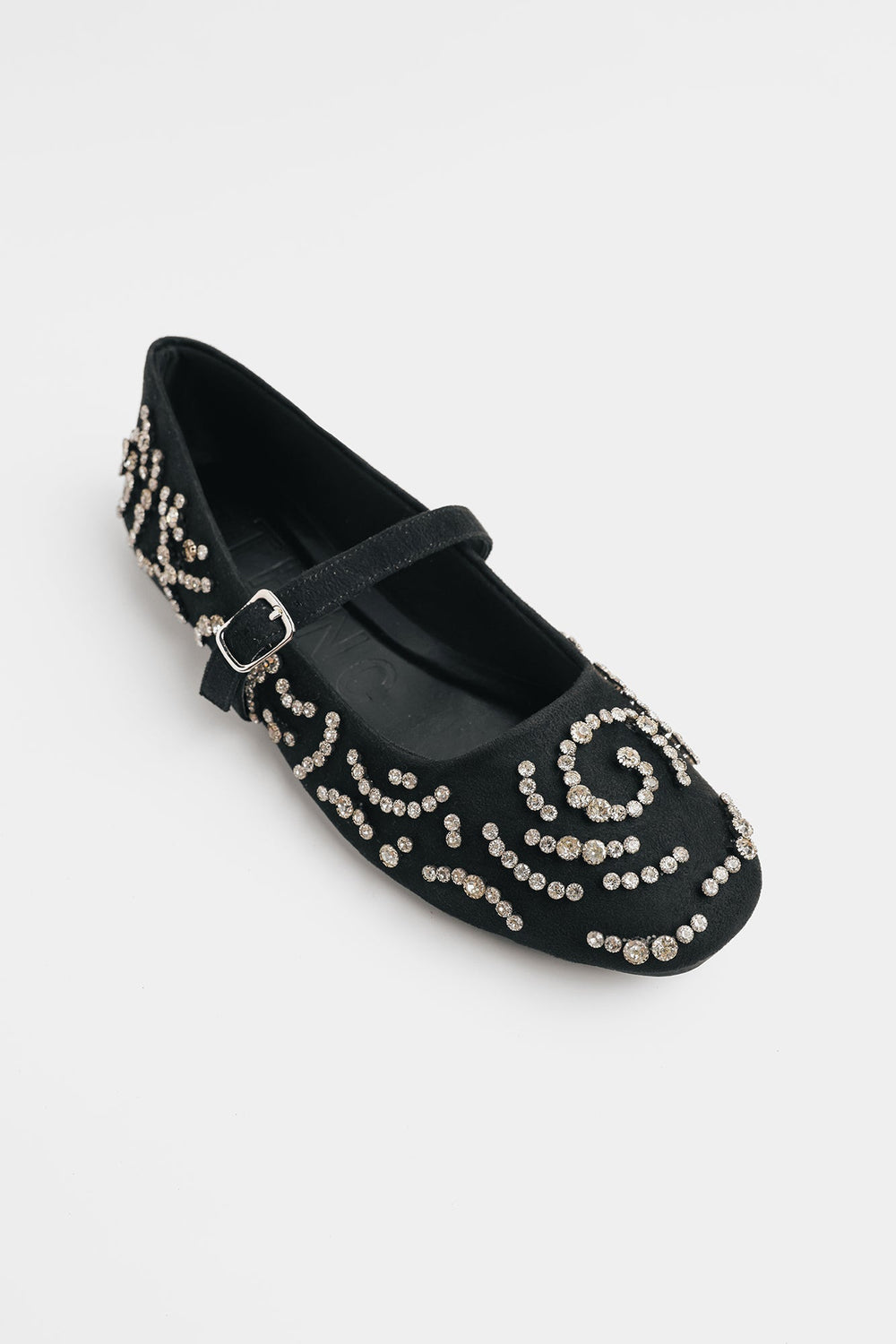 Elevate your evening wear with these stunning black embelished pumps. These shoes feature a classic silhouette with a squared toe and a slim adjustable buckle strap across the instep. The black fabric is entirely embellished with shimmering silver crystals. The crystals are arranged in an elaborate swirling, floral pattern across the entire upper of the shoe, creating a spectacular, festive look. These flats are the perfect accessory for adding glamour and sparkle to any formal outfit.