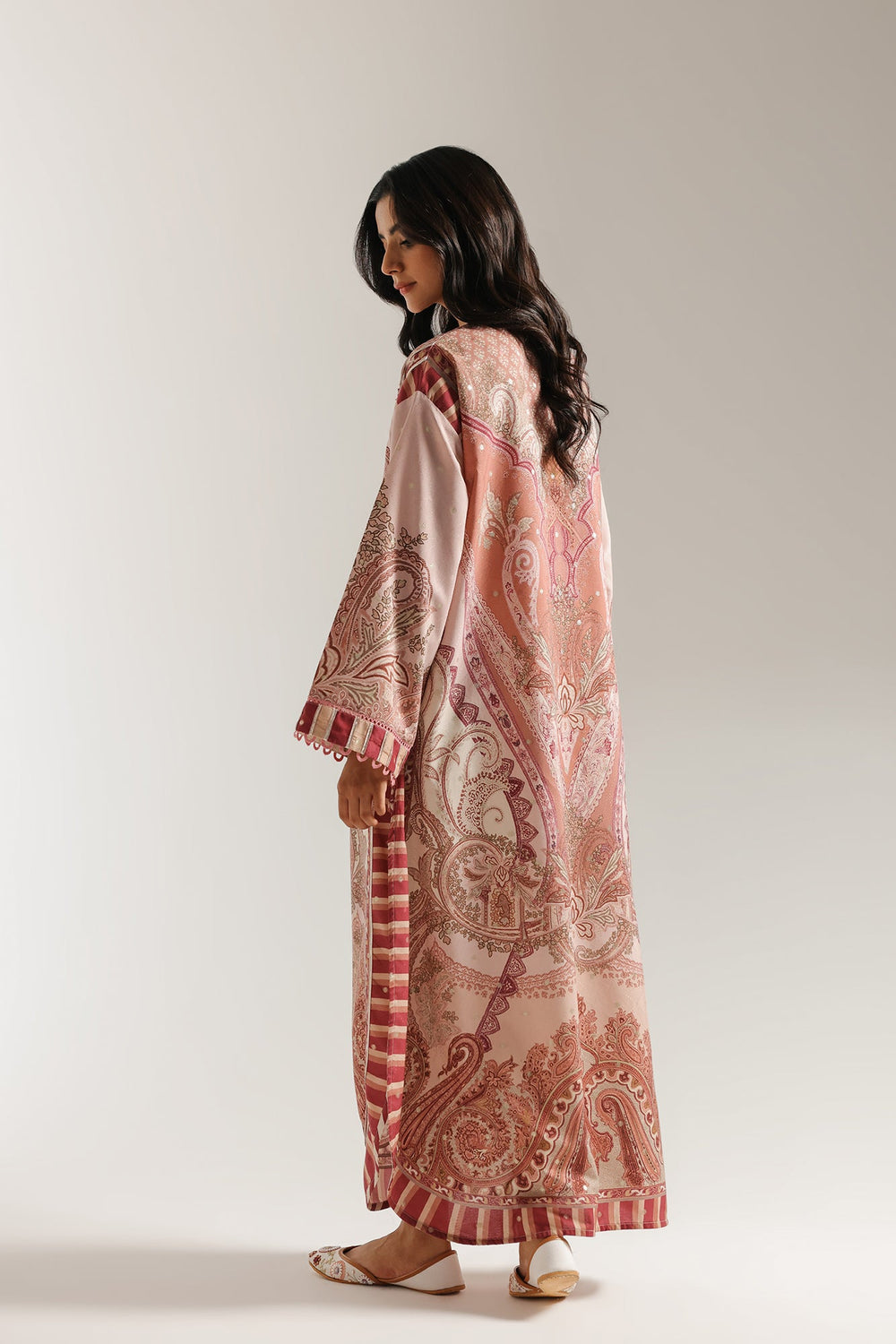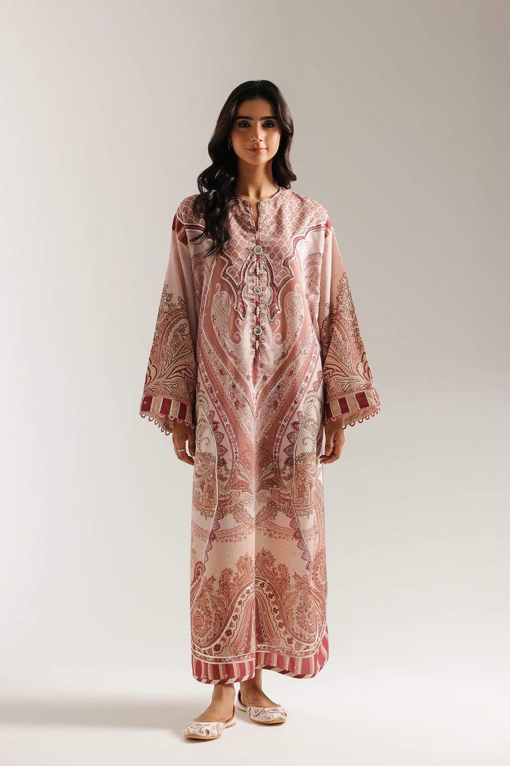 Step out in style with this stunning jacquard dress. This long, flowing dress is a masterpiece of intricate design. The soft pink base is a graceful canvas for the elaborate paisley and floral patterns, with subtle zari work, adding a touch of sparkle and opulence. The dress has a classic A-line silhouette, perfect for making a sophisticated statement at any event.