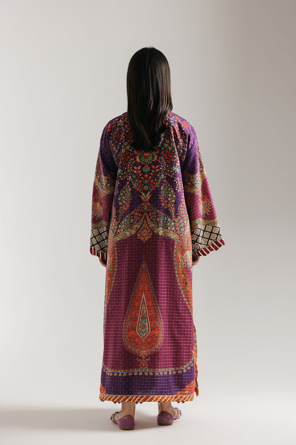 Make a regal and expressive statement with this grape-colored kaftan, featuring a rich tapestry of multi-colored ethnic prints and traditional motifs. The design is centered around a split V-neckline with a small buttoned placket, leading into a fluid, floor-length silhouette adorned with vibrant paisley patterns and intricate botanical borders in shades of orange, teal, and gold. Elaborate geometric panels frame the wide long sleeves and the hemline, which is finished with a striking orange and white striped trim and a delicate scalloped edge. With its combination of deep purple tones and detailed artistry, this kaftan offers a perfect blend of bohemian luxury and graceful movement.