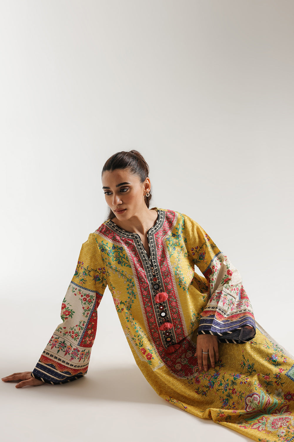 Radiate effortless luxury in this vibrant sunshine-yellow printed kaftan, where a floor-length, flowing silhouette meets a bold tapestry of artisanal patterns. The design features a sophisticated V-neckline with a decorative button-and-tassel, adorned with a kaleidoscope of floral bouquets and heritage-inspired geometric borders in shades of fuchsia, emerald, and cerulean. With its sweeping wide sleeves and intricate multi-tonal patchwork aesthetic, this kaftan is a masterclass in modern bohemian grace.