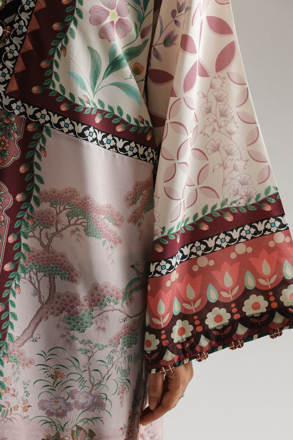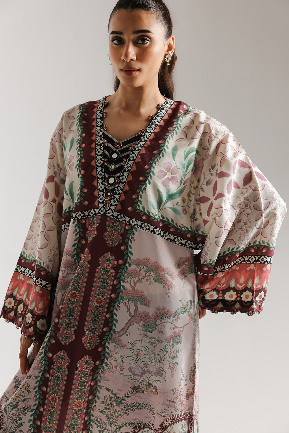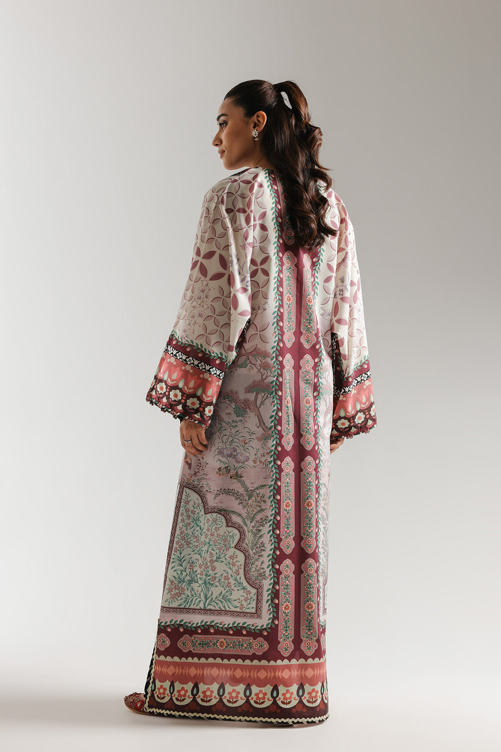 This sophisticated floor-length kaftan is rendered in a soft cream and dusty rose palette, offering a regal and flowing silhouette. The garment is adorned with an intricate all-over botanical and architectural print, featuring symmetrical floral motifs and garden-inspired scenery. A decorative V-neckline with a black and white geometric border adds a structured touch, while the voluminous, wide sleeves are finished with a bold, multi-colored floral hem. Crafted from a lightweight, breathable fabric, this kaftan is designed with high side slits for ease of movement and a contemporary flair.