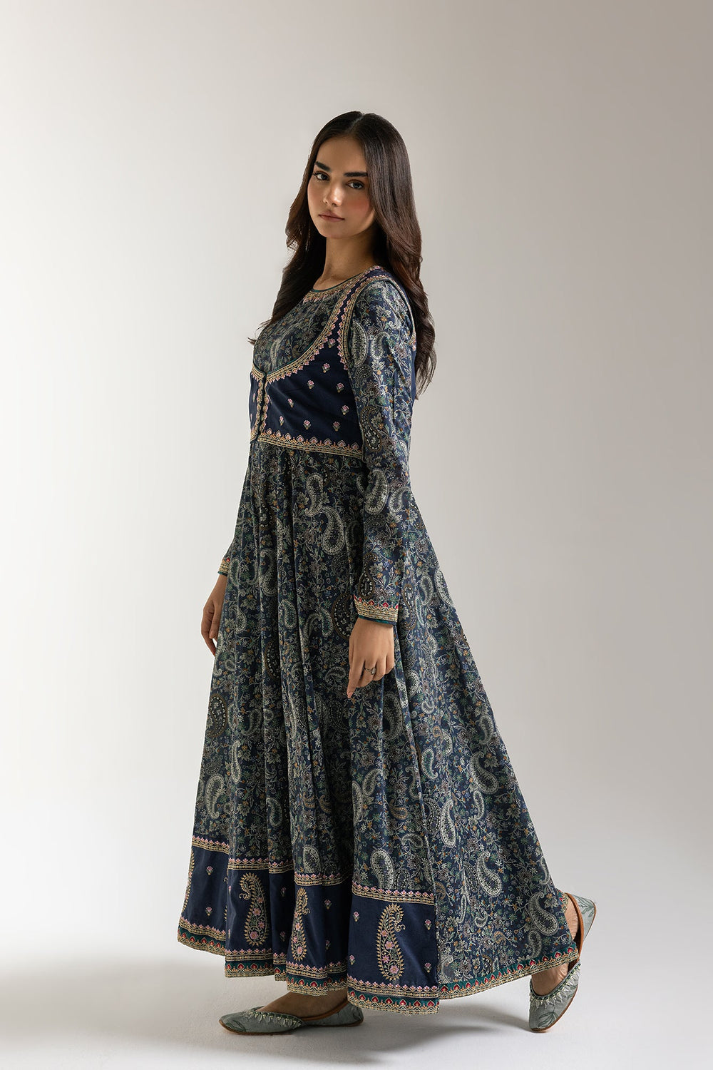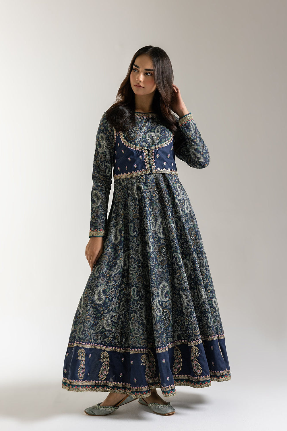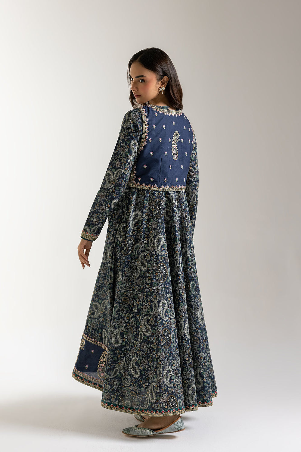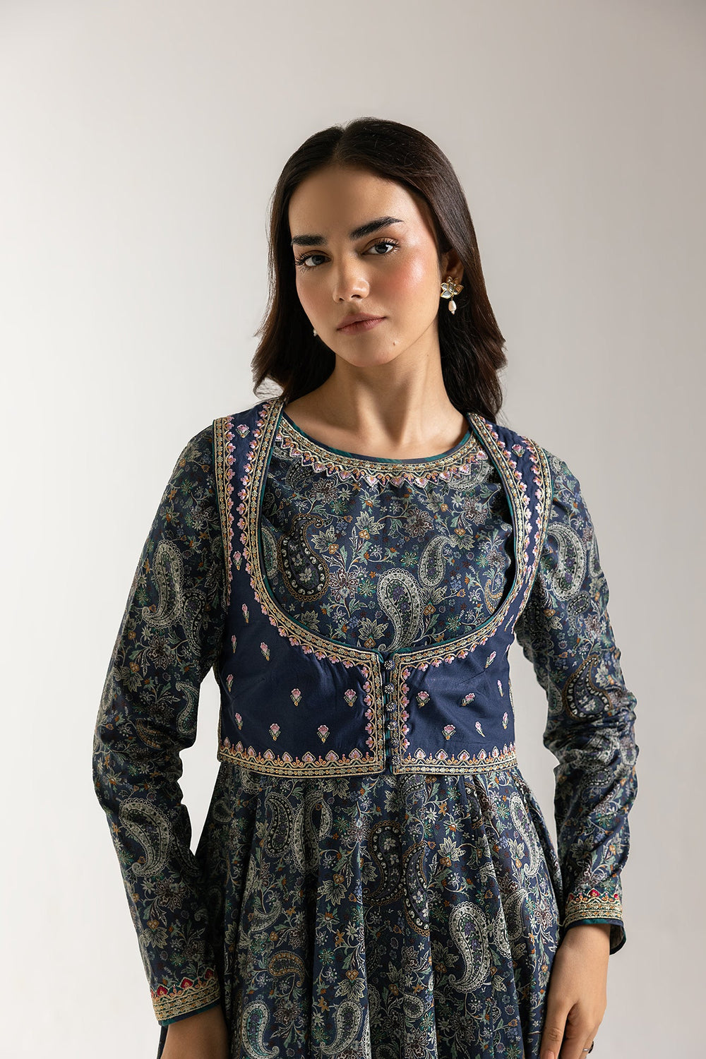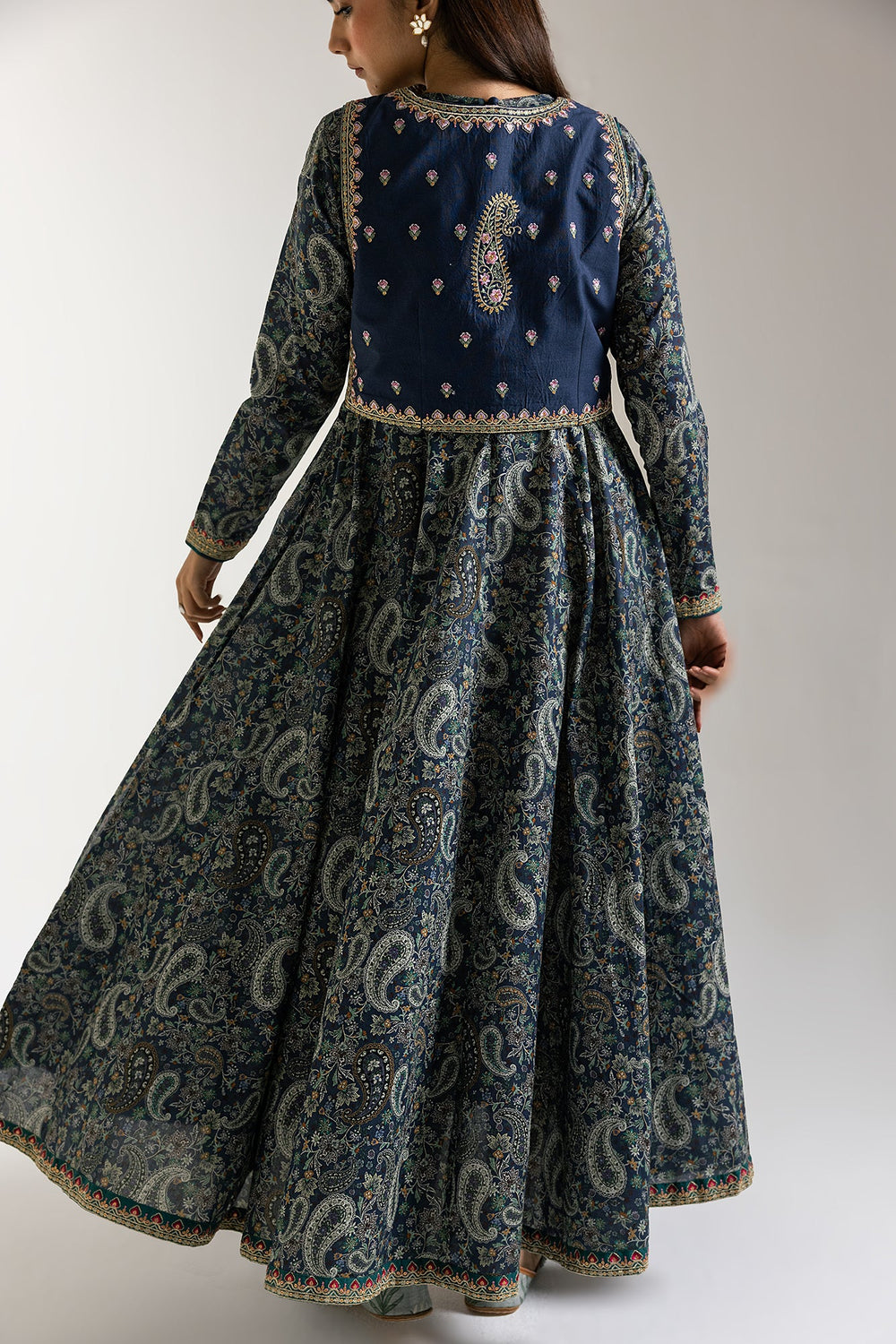 Step into an ethereal realm of style with our captivating mystic maxi dress. This enchanting piece features a rich, deep blue fabric adorned with a beautiful all-over paisley and floral print that evokes a sense of timeless allure. Complementing the dress is a waistcoat, richly embellished with delicate embroidery and subtle sparkle, designed to layer gracefully over the dress and enhance its silhouette. This harmonious pairing offers both exceptional comfort and a stunning visual presence. Perfect for festive celebrations, elegant evenings, or making a distinctive statement.