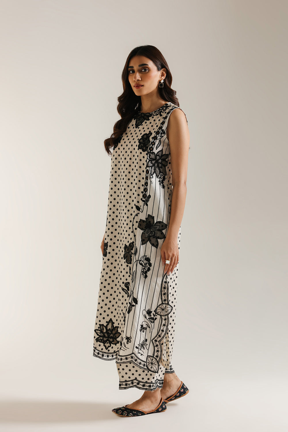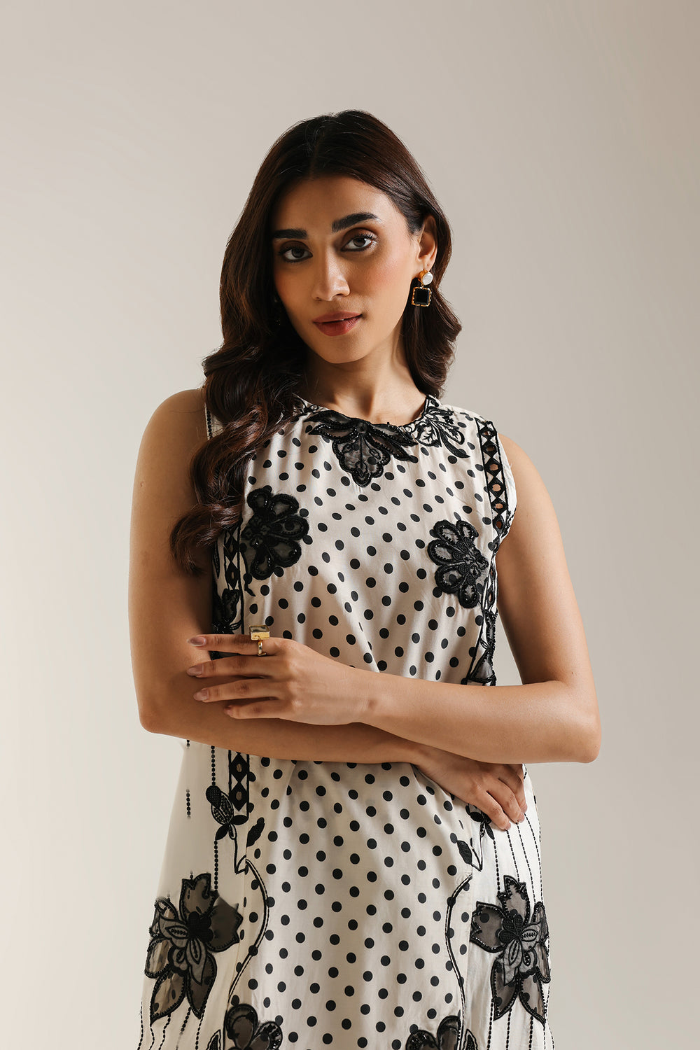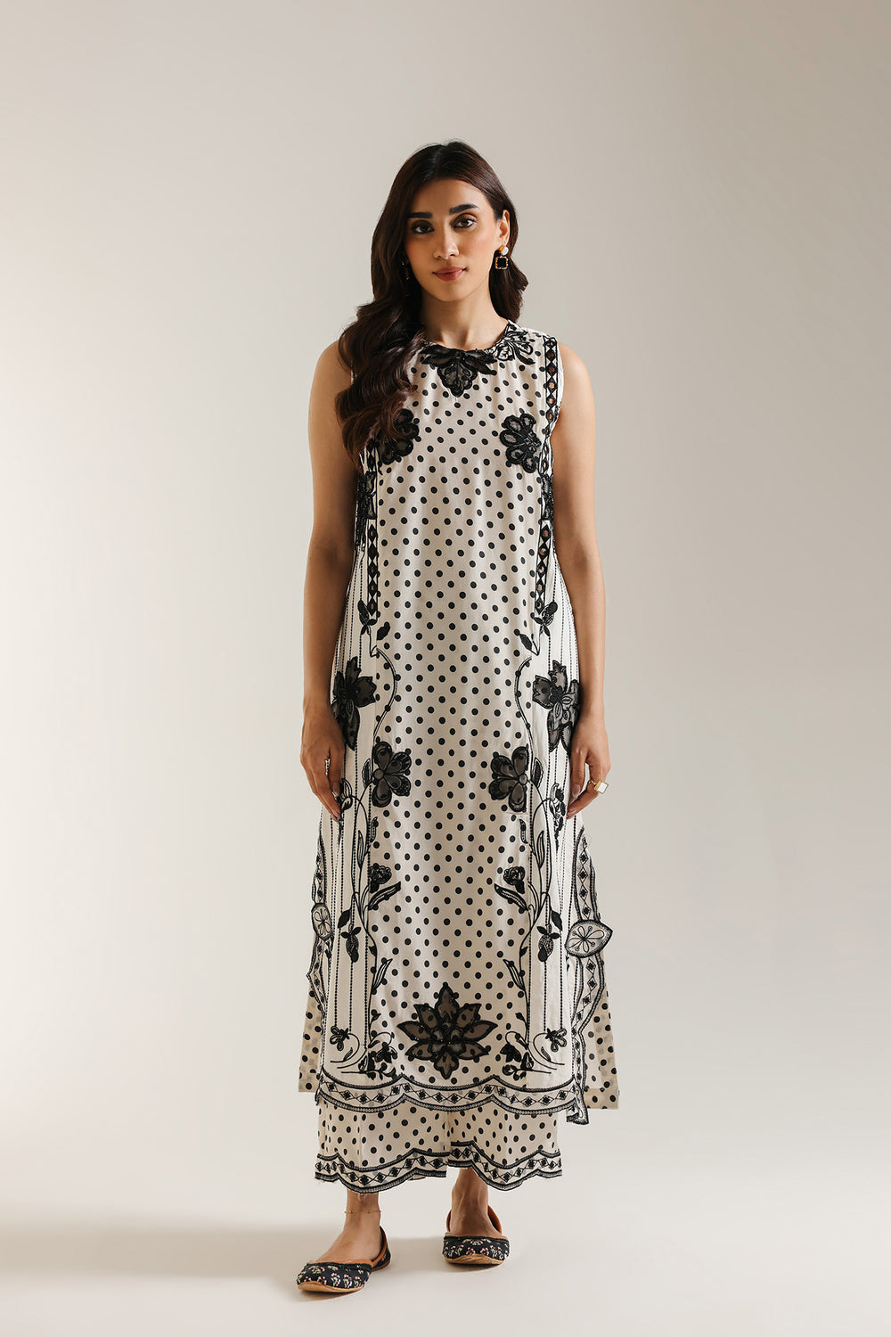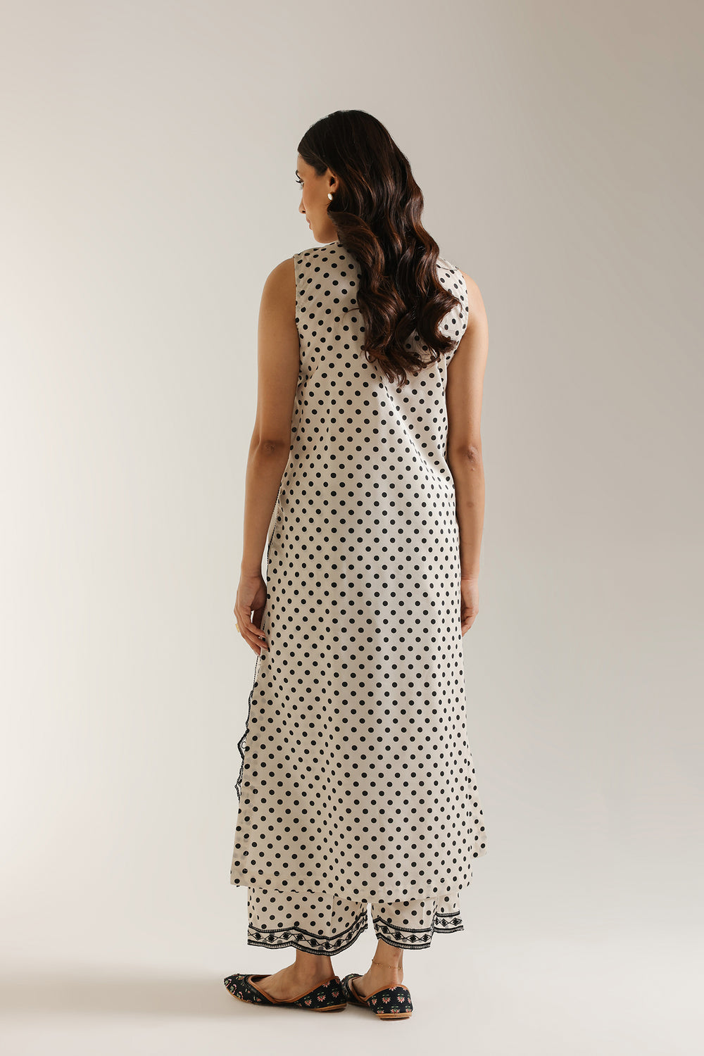 Step into sophisticated artistry with this captivating two-piece ensemble, a perfect fusion of classic black and white. The elegant sleeveless shirt features a charming polka dot pattern, beautifully contrasted with striking black embroidered floral motifs that adds dimension and flair. Paired with matching printed trousers, with embroidery along the hem creating a cohesive and flowy silhouette. This outfit is ideal for adding a distinctive, graceful, and contemporary touch to your festive gatherings, evening events, or cultural celebrations.