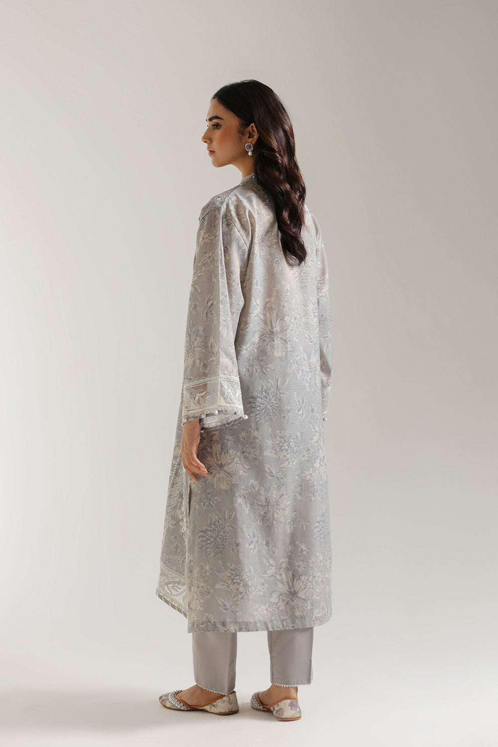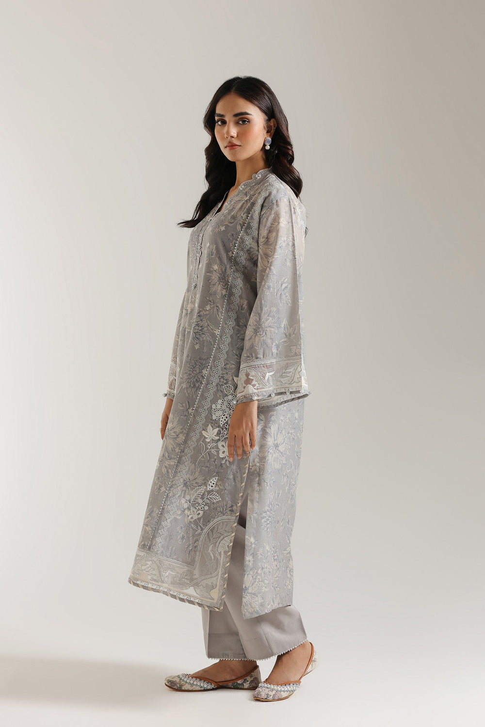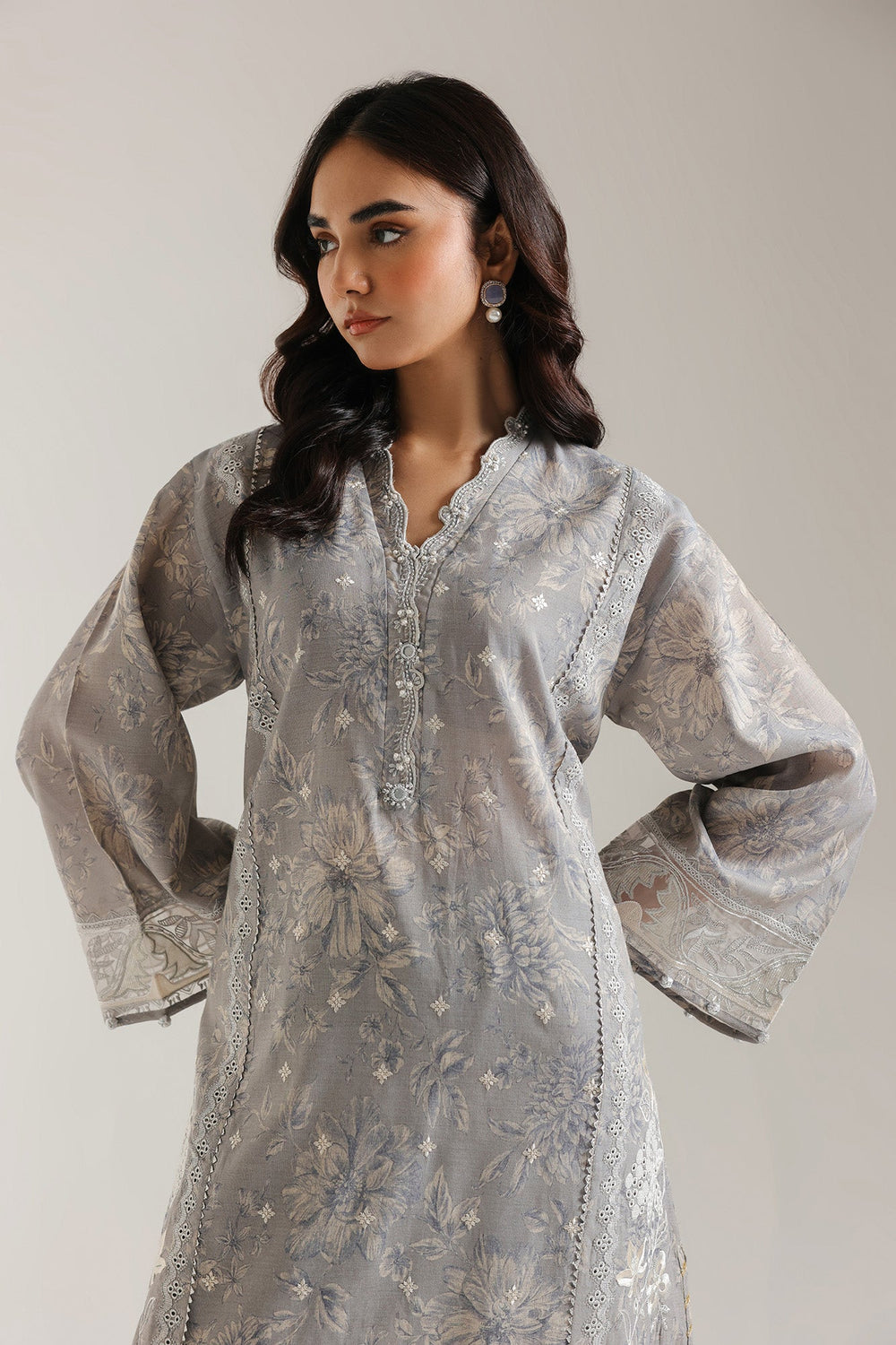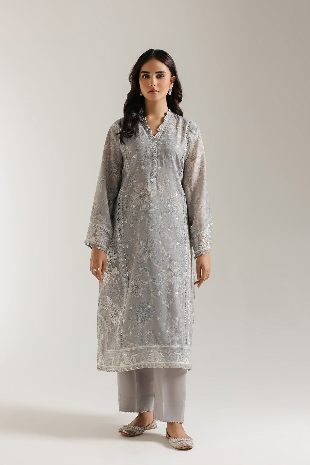 Exude timeless grace in this elegant grey two-piece suit, perfect for understated sophistication. The long kurta is adorned with delicate floral embroidery in soft earthy tones of pale coral, creating a refined and ethereal look. Intricate lace detailing along the neckline, sleeves, and hem adds a subtle feminine touch. Paired with straight trousers in a matching hue, this ensemble is a perfect choice for semi-formal events, festive gatherings, or elegant daywear. Style it with classic accessories and flats for a polished and graceful appearance.