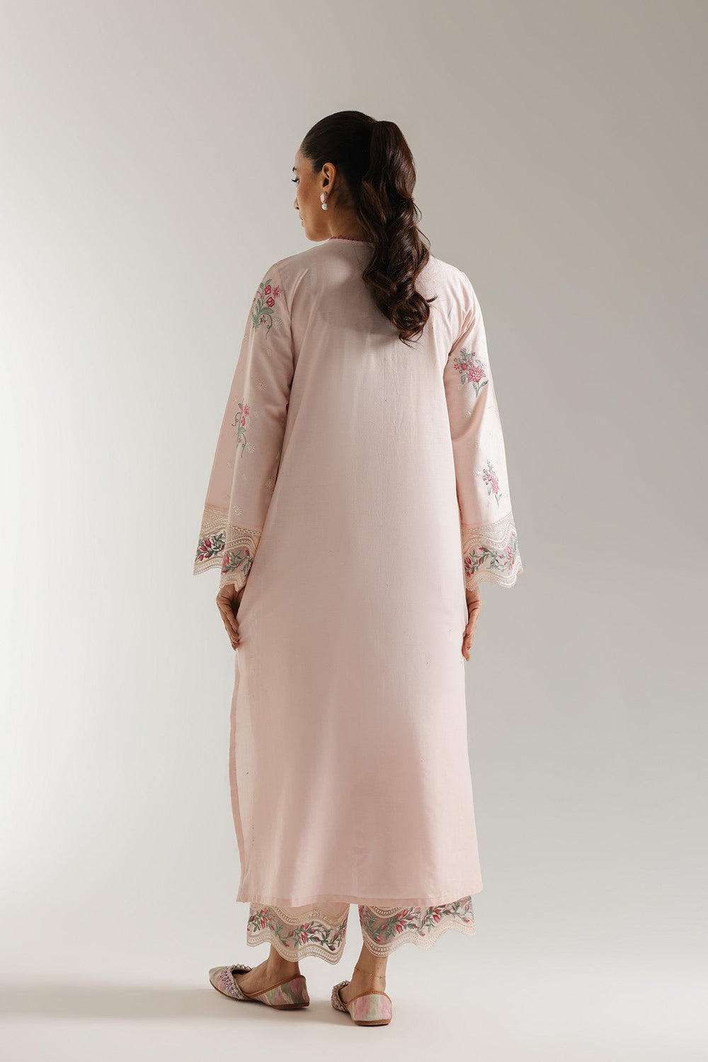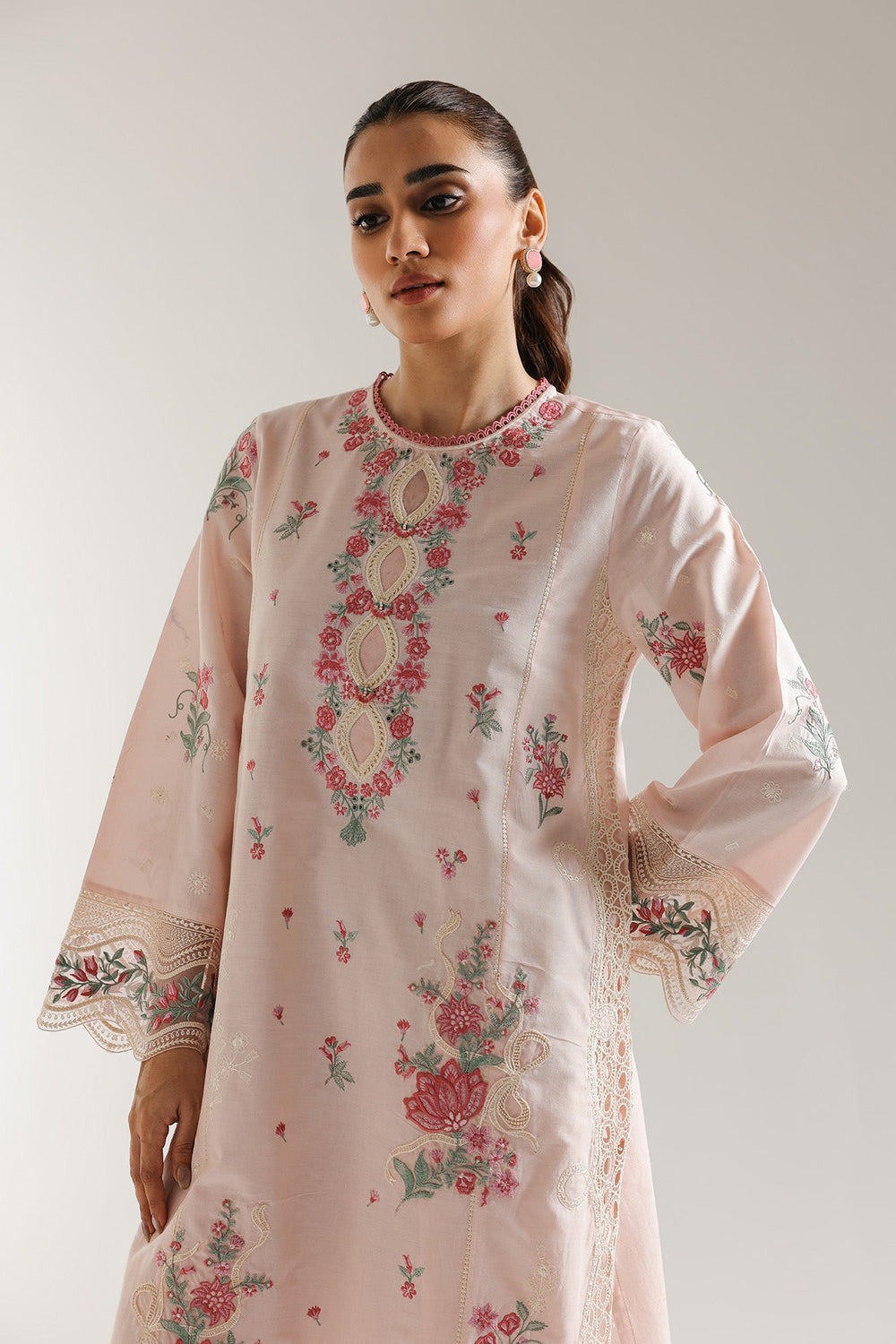 Embrace the gentle allure of this pastel pink embroidered ensemble. The long shirt is adorned with exquisite floral embroidery in subtle shades of white, green, and deeper pink, creating a harmonious and graceful design. The round neckline is intricately embellished with delicate details, adding a touch of refined charm. The full sleeves are a highlight, featuring beautiful cutwork and embroidered borders at the cuffs, enhancing the shirt's ethereal beauty. The coordinating pink trousers continue the theme with matching embroidered and cutwork detailing along the hem, creating a cohesive and elegant look.