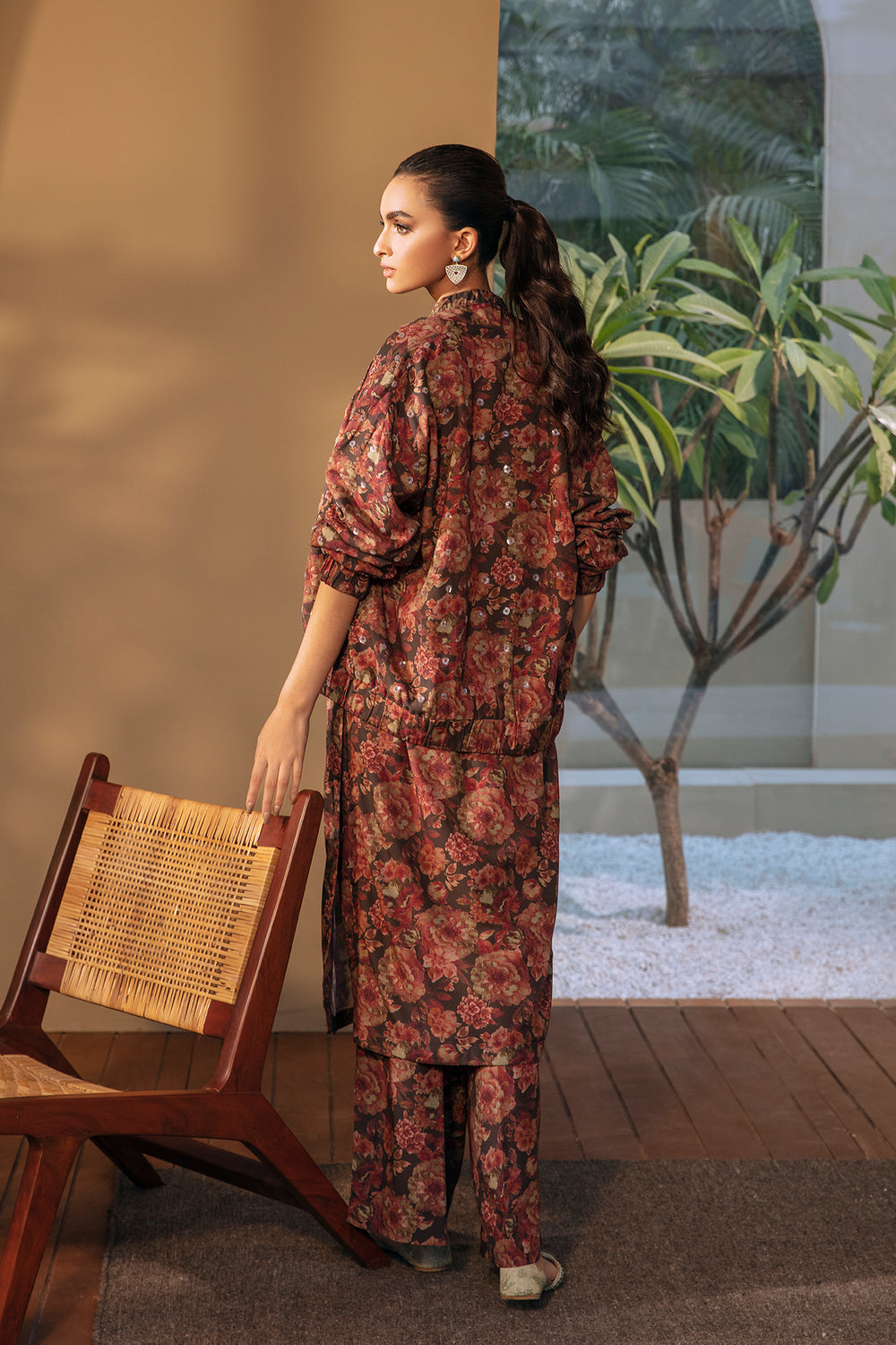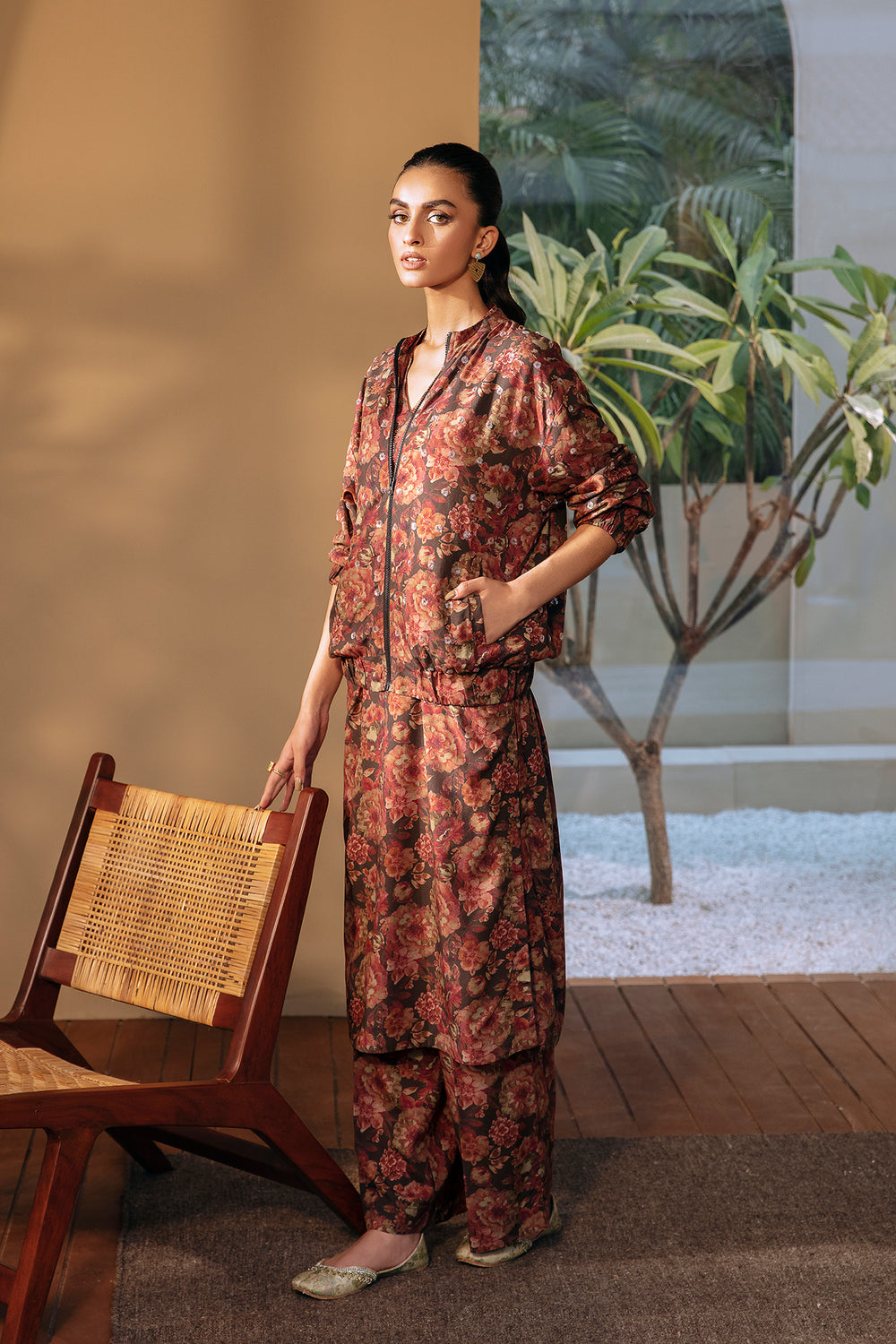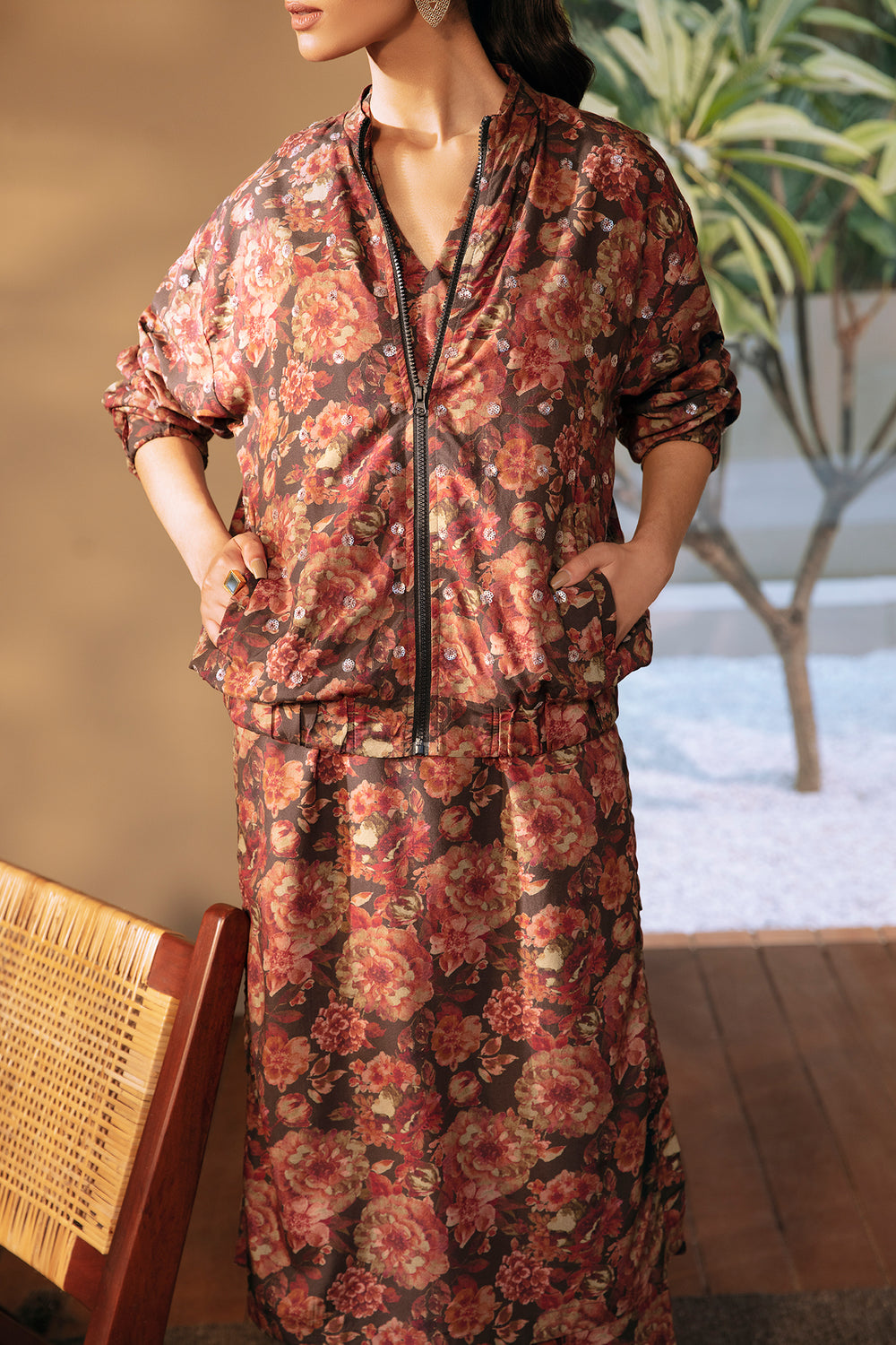 A classy yet elegant composition is layered over this graceful ensemble rendered in an appealing golden brown shade. It features a radiant sleeveless shirt adorned with beautiful floral prints in majestic hues. Paired with a trendy culotte trouser and a contemporary printed jacket with zipper and elasticated waist, this graceful outfit is a must have to style at fun events this happening season.