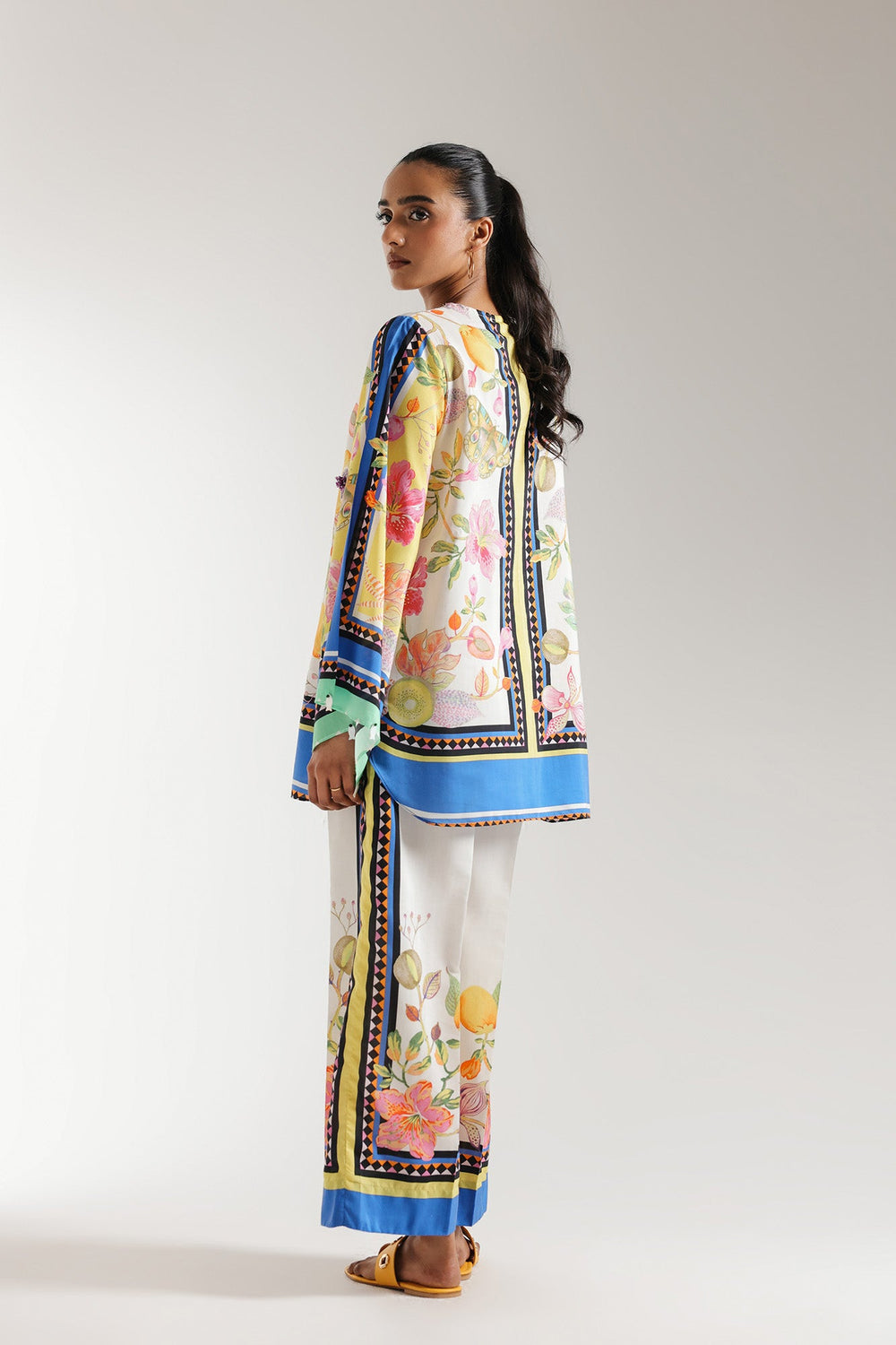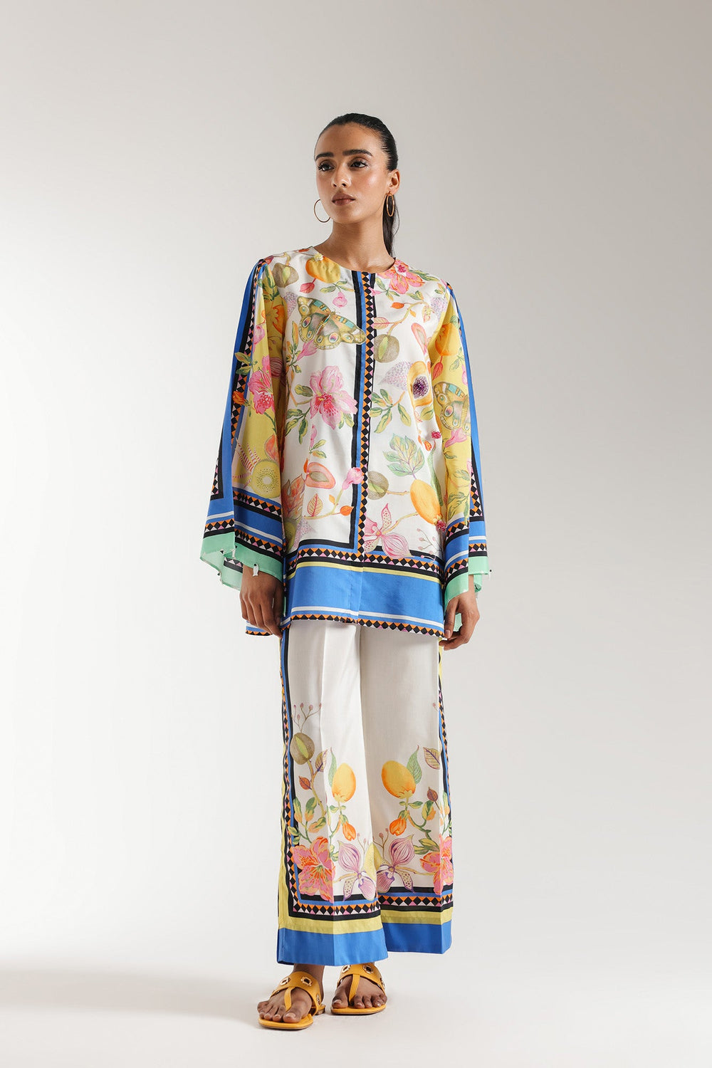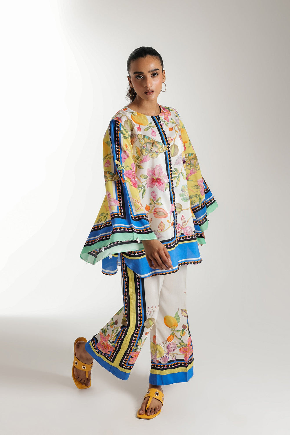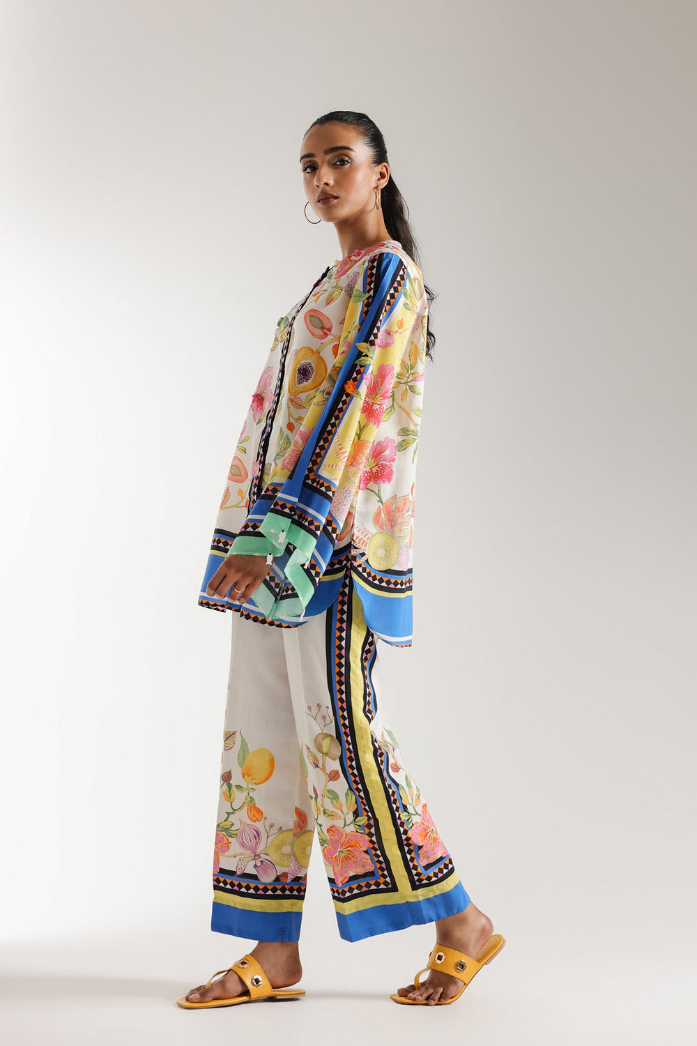 A classically chic composition is portrayed on this style statement outfit. It features a contemporary shirt beautifully adorned with captivating floral designs printed in vibrant colors illustrating a mesmerizing landscape canvas. Paired with a trendy printed culotte trouser adorned with attractive prints. This trendy outfit is enhanced with trendy embellishments and is a great addition to your summer season wardrobe.