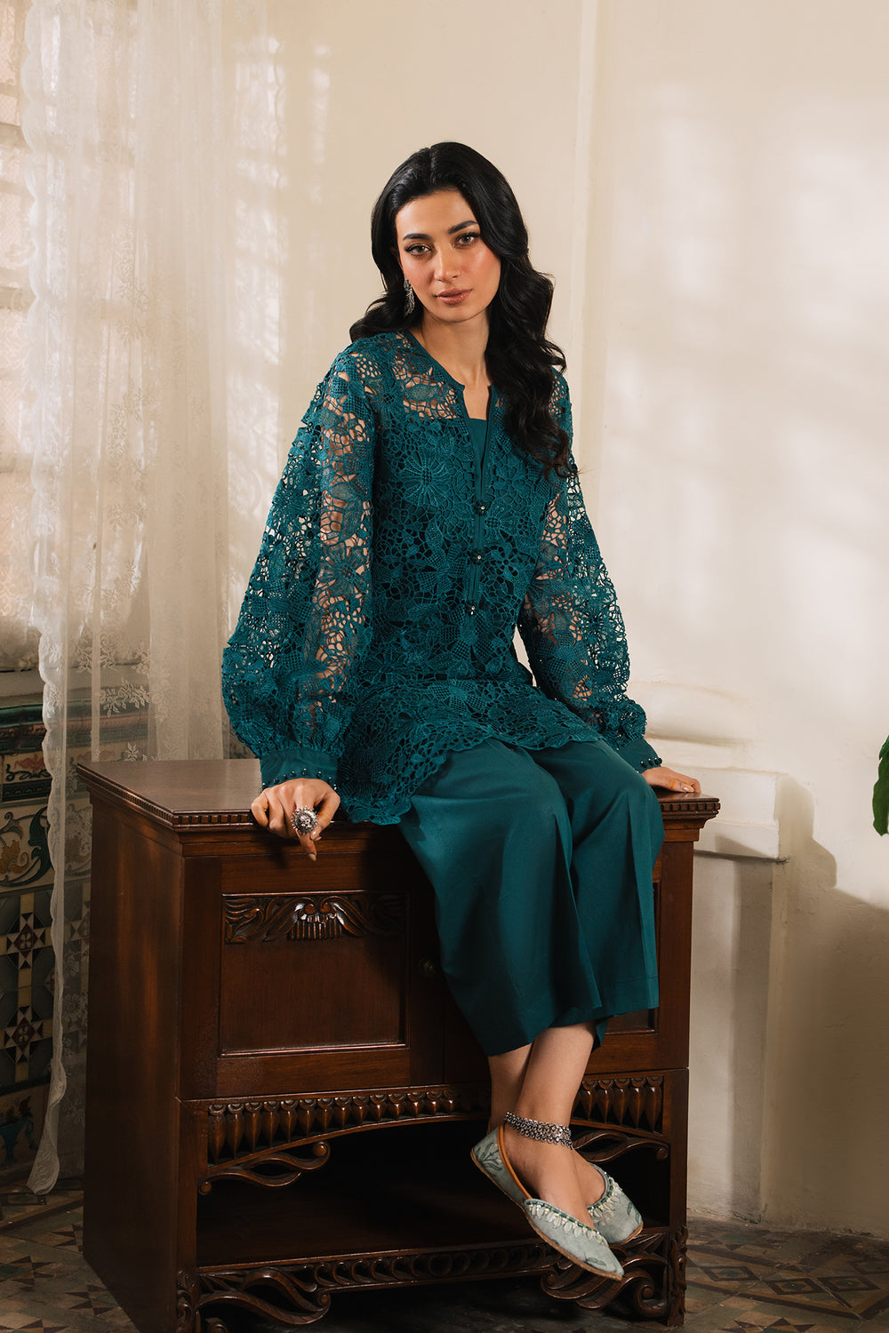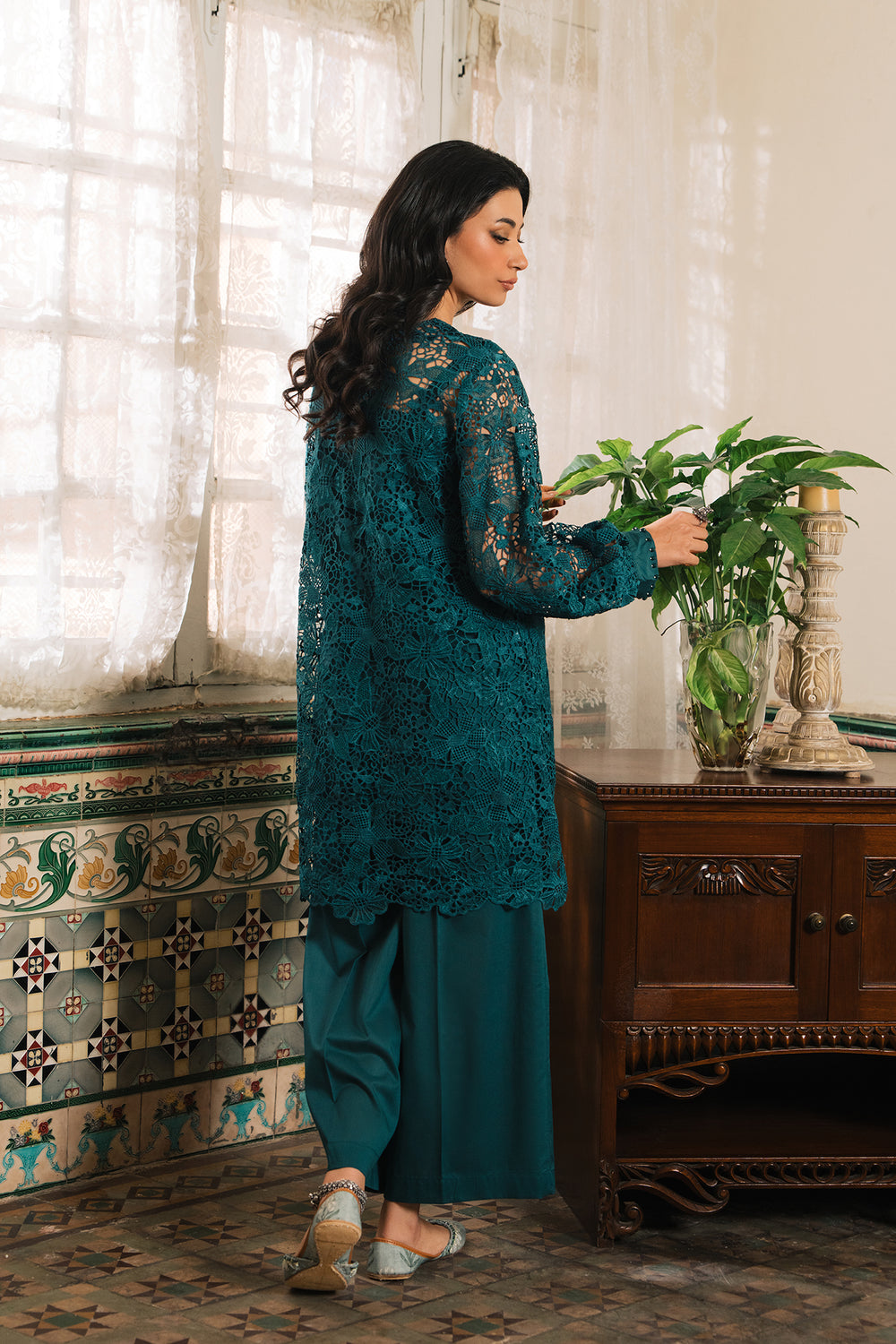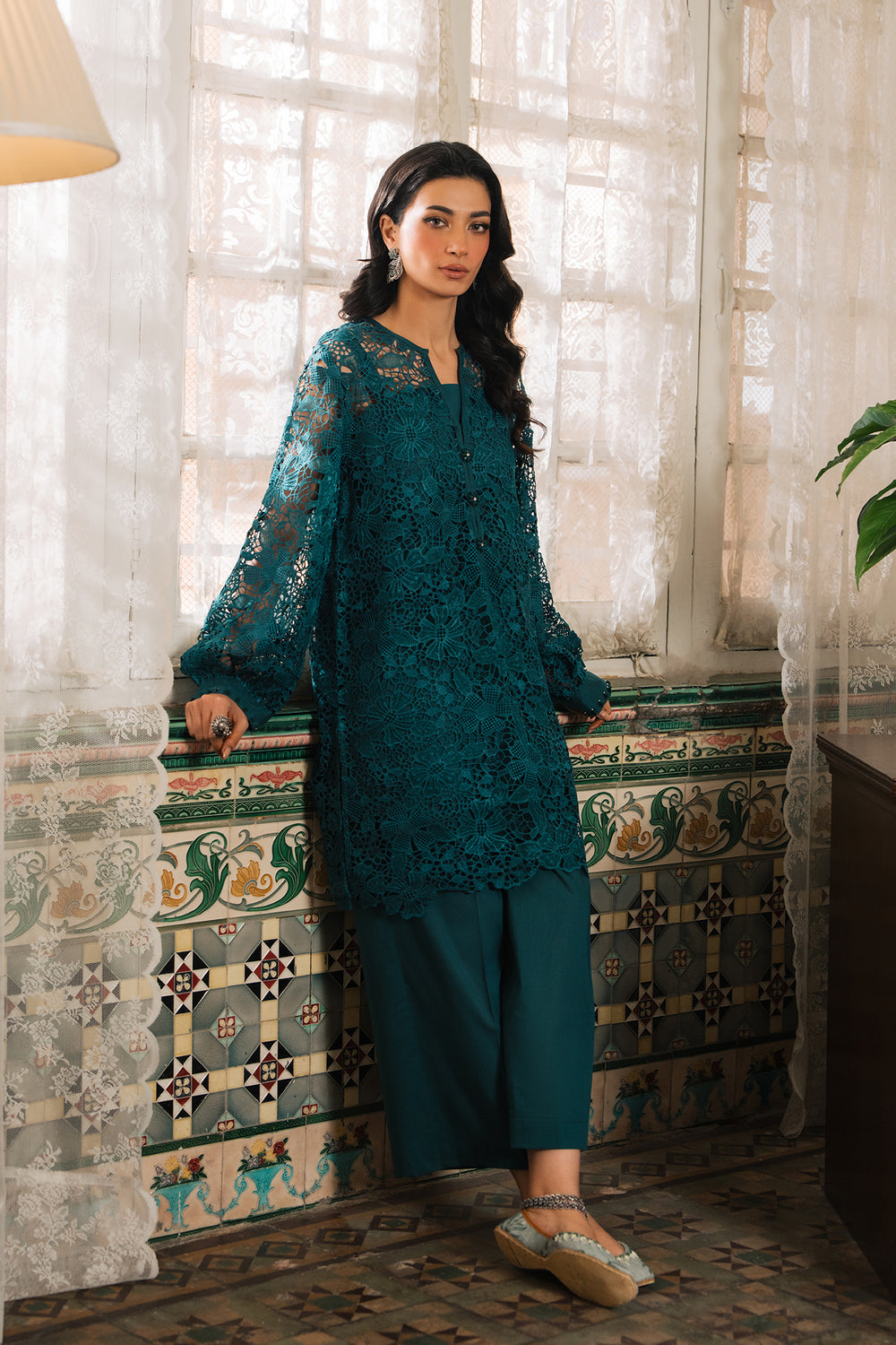 A classically chic composition is portrayed on this style statement outfit rendered in an attractive teal shade. It features a contemporary shirt beautifully adorned with aesthetically rich floral designs on crochet fabric. Paired with a solid inner slip and a contemporary culotte trouser. This enchanting outfit is the epitome of grace and perfection to style this happening season.