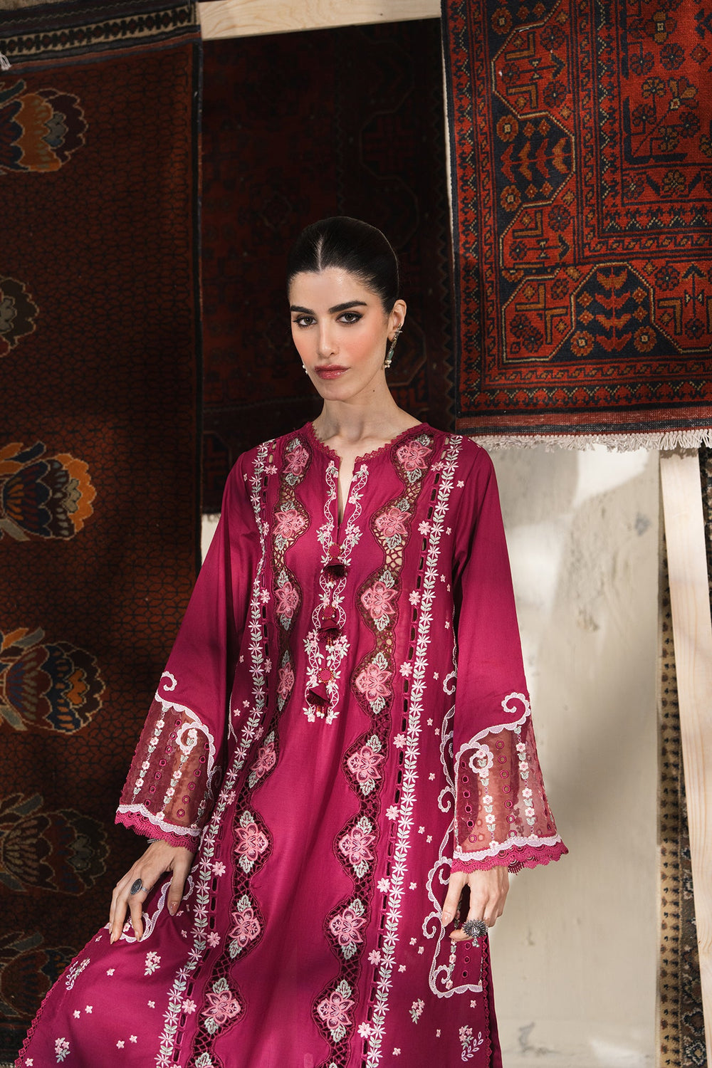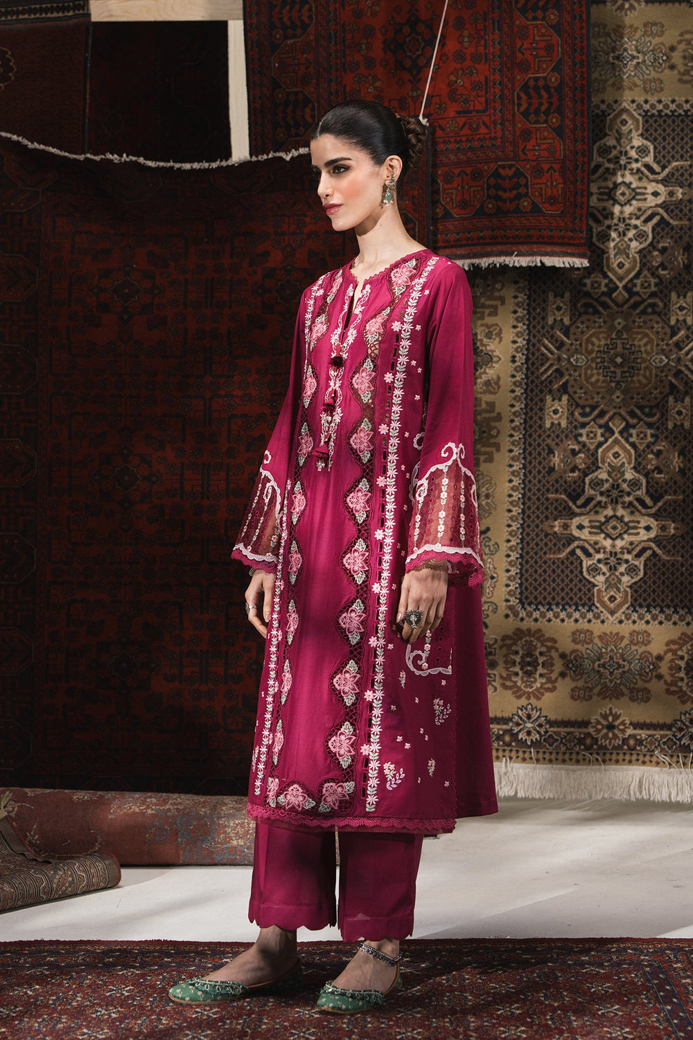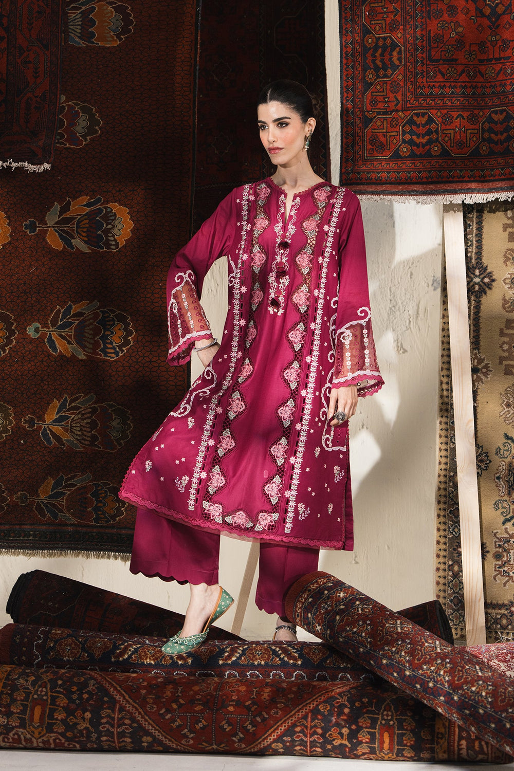Upgrade your summer wardrobe with this charming vivid violet shade outfit. The contemporary shirt boasts captivating floral designs, intricately embroidered with the schiffli technique in delicate shades of white, green and pink. Paired with a solid trouser with scalloped bottom opening, this outfit exudes class and elegance. Elevate your style with this chic and stylish ensemble.