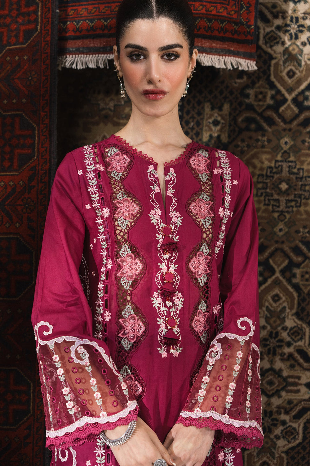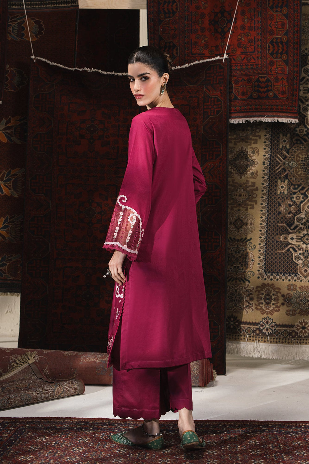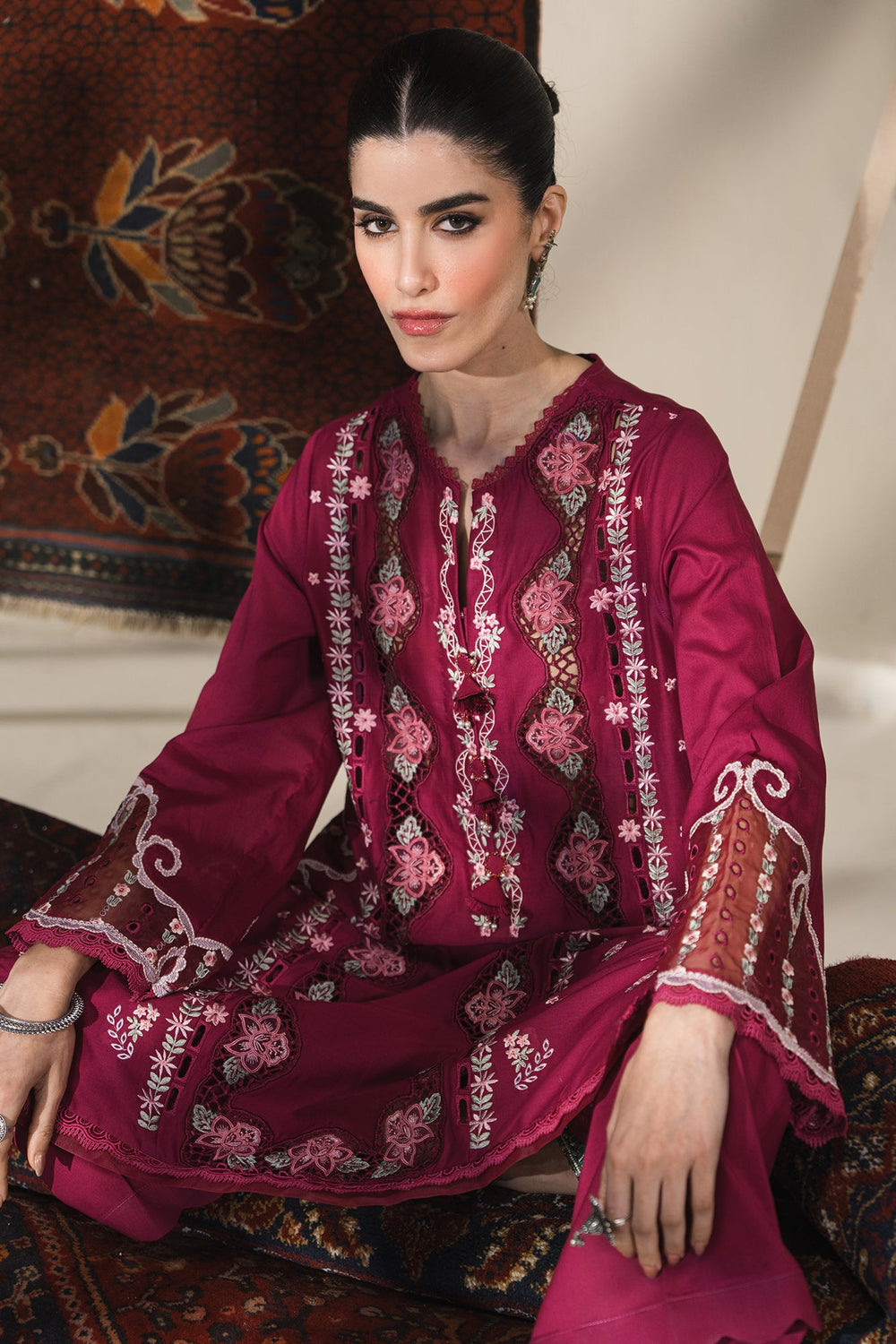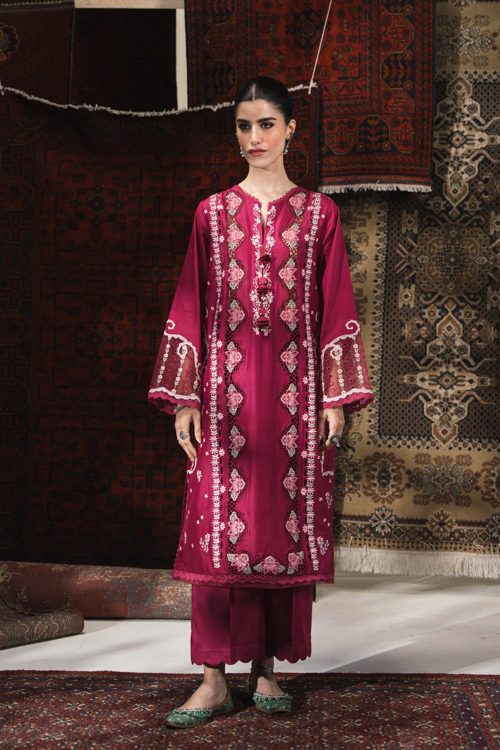 Upgrade your summer wardrobe with this charming vivid violet shade outfit. The contemporary shirt boasts captivating floral designs, intricately embroidered with the schiffli technique in delicate shades of white, green and pink. Paired with a solid trouser with scalloped bottom opening, this outfit exudes class and elegance. Elevate your style with this chic and stylish ensemble.