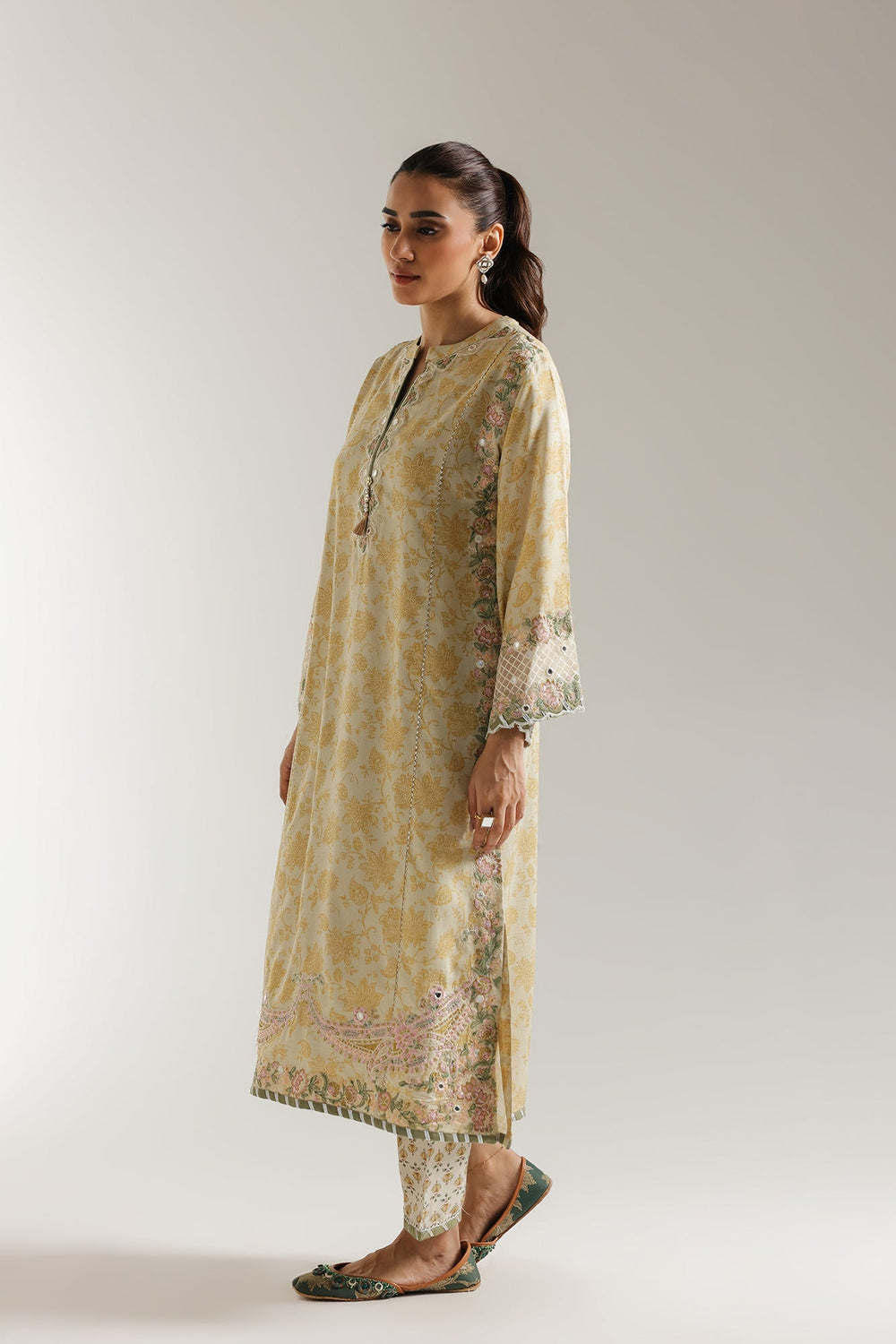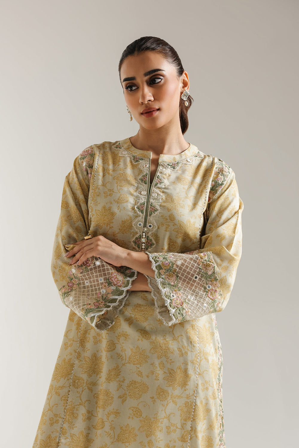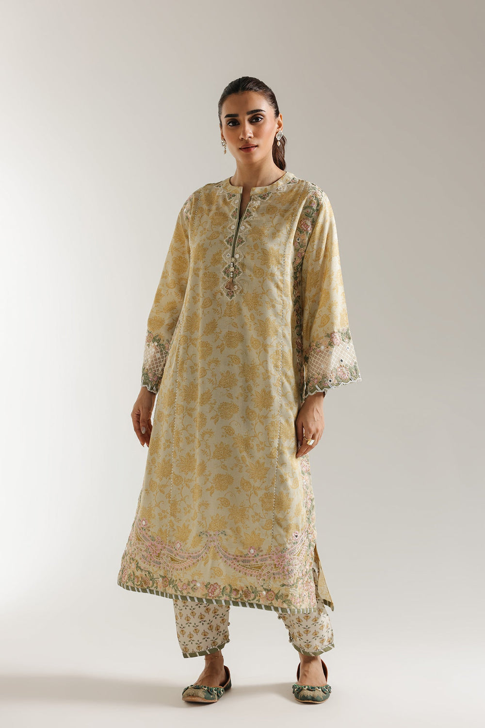 Imagine the softest sunlight draping you in elegance. Our Whispering Blooms Kurta Set captures that very feeling. This two-piece ensemble, in a delicate yellow-beige, whispers sophistication with its exquisitely embroidered kurta. Feel the subtle texture of the premium fabric as delicate floral motifs seem to bloom across it, each detail meticulously crafted around the neckline, sleeves, and hem. Paired with perfectly coordinating trousers that subtly echo the floral whispers, this set creates a harmonious statement of refined style. Whether gracing a special occasion or elevating your everyday, this ensemble promises to turn heads with its understated luxury and timeless charm.