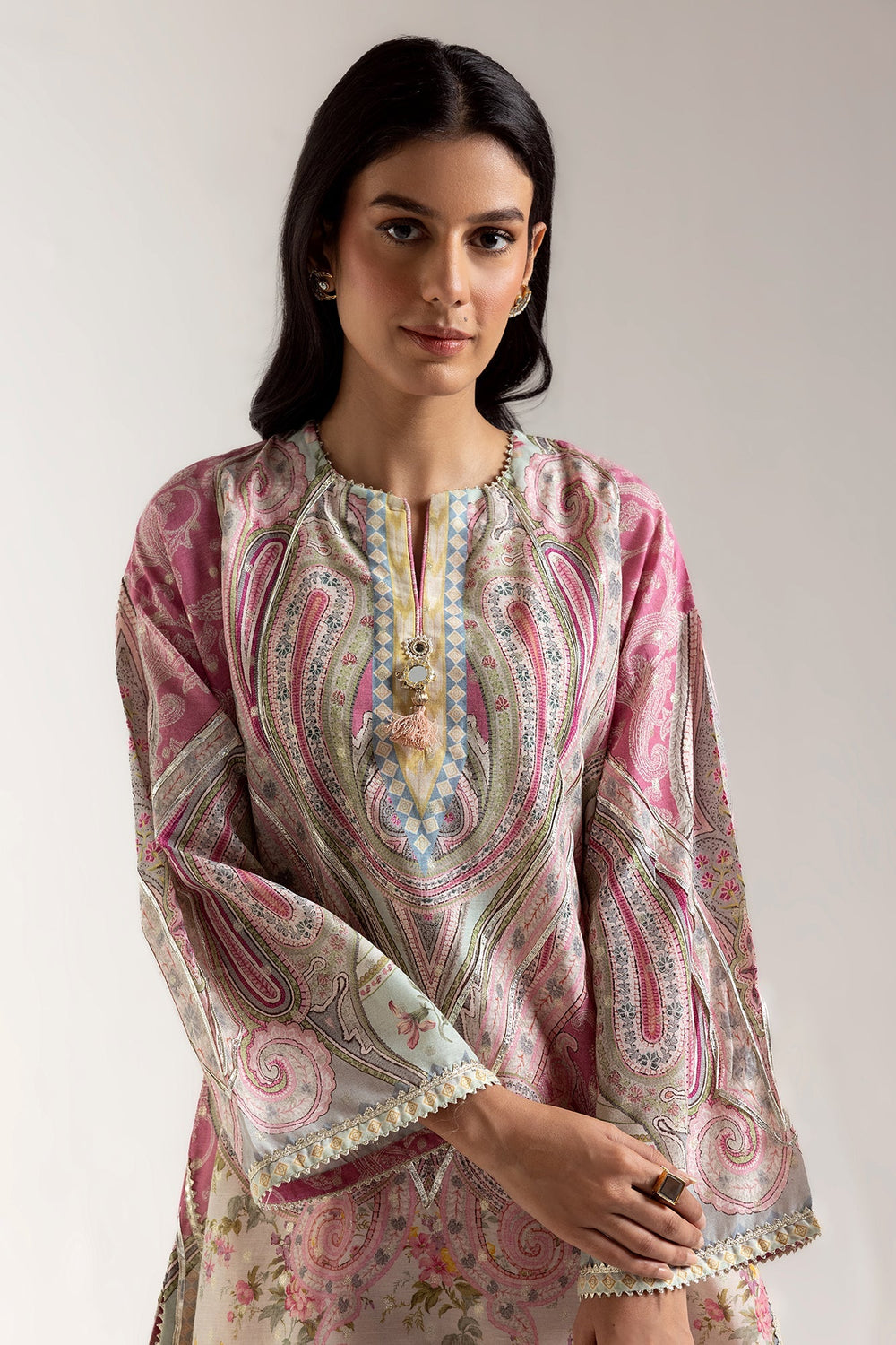 This stylish outfit showcases a captivating composition with a contemporary shirt adorned in vibrant floral designs that create a beautiful canvas. The shirt is enriched with dazzling gota embellishments and paired with a trendy pink solid shalwar that features dazzling embellishments at the bottom opening. Perfect for the festive season, this ensemble is enhanced with scintillating embellishments and is a great addition to your wardrobe.