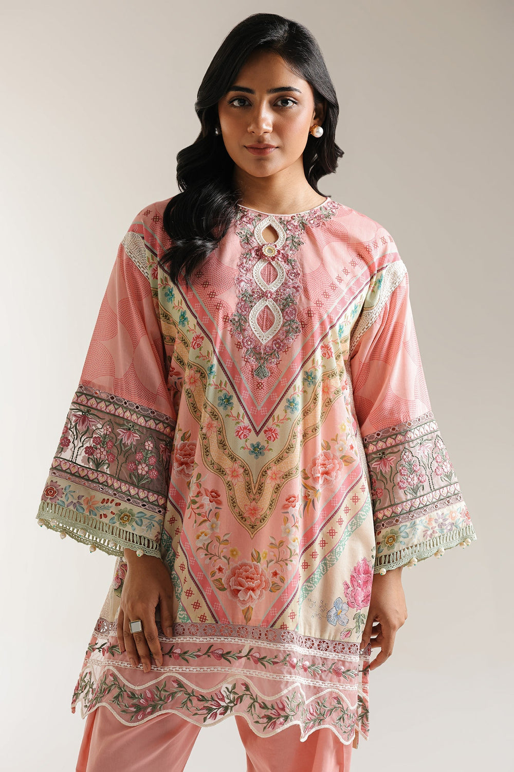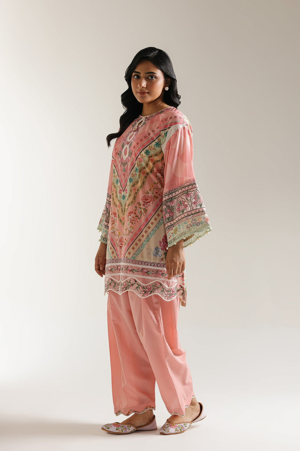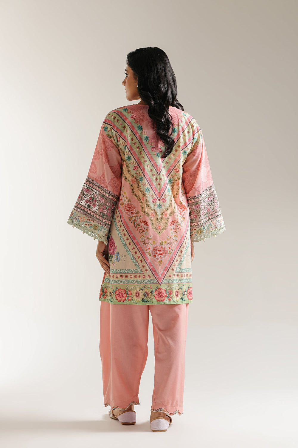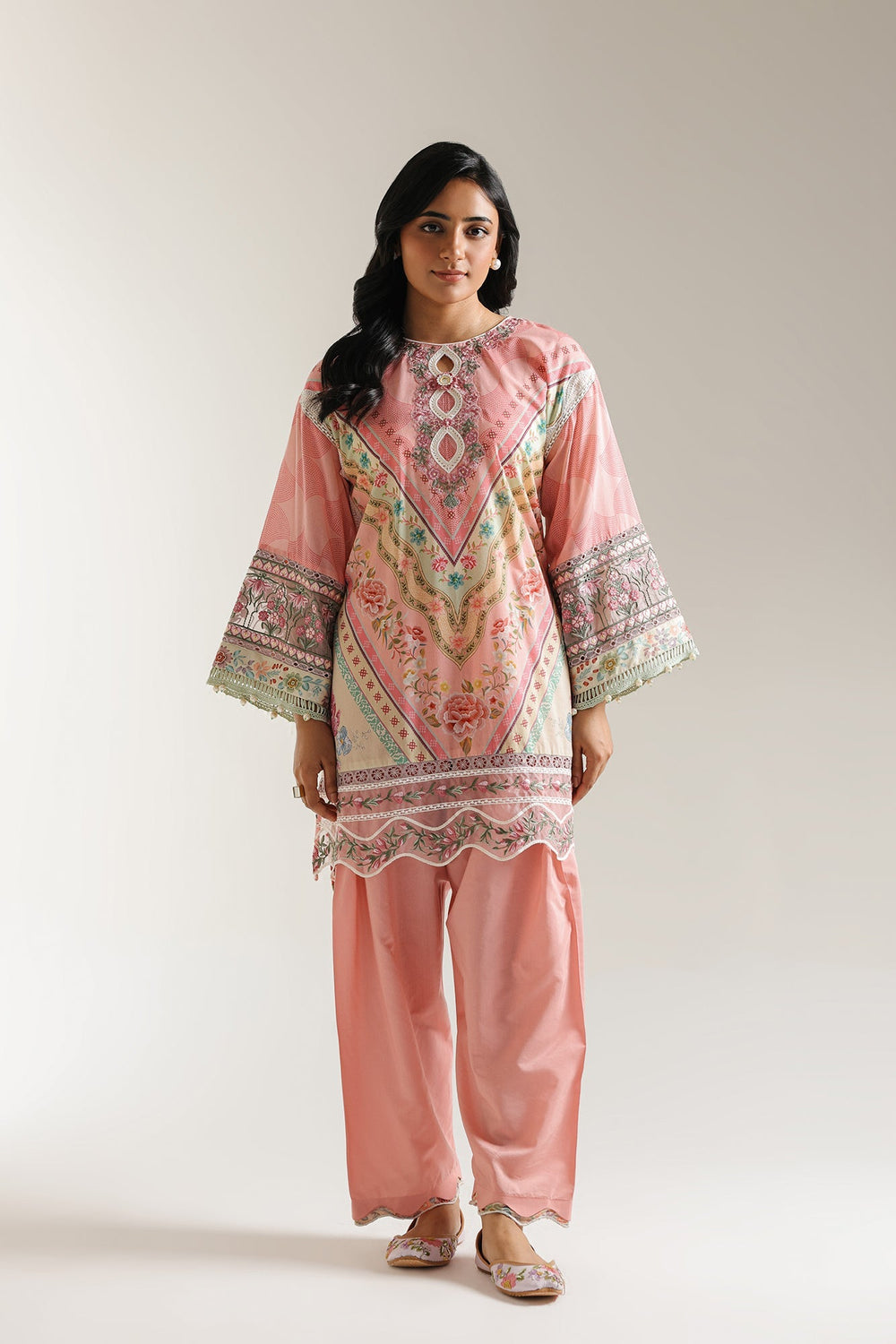 Step into a world of enchanting pastels and intricate designs with this delightful two-piece ensemble. The graceful pink kurta features soft floral and abstract motifs in shades of green, blue, and cream. The intricate neckline is adorned with delicate embellishments and tassels, while the wide bell sleeves and hem are beautifully finished with detailed white and metallic accents. It is perfectly complemented by coordinating light pink shalwar, creating a harmonious and flowy silhouette. This outfit is ideal for festive gatherings, daytime events, or adding a distinctive and artistic flair to your style.