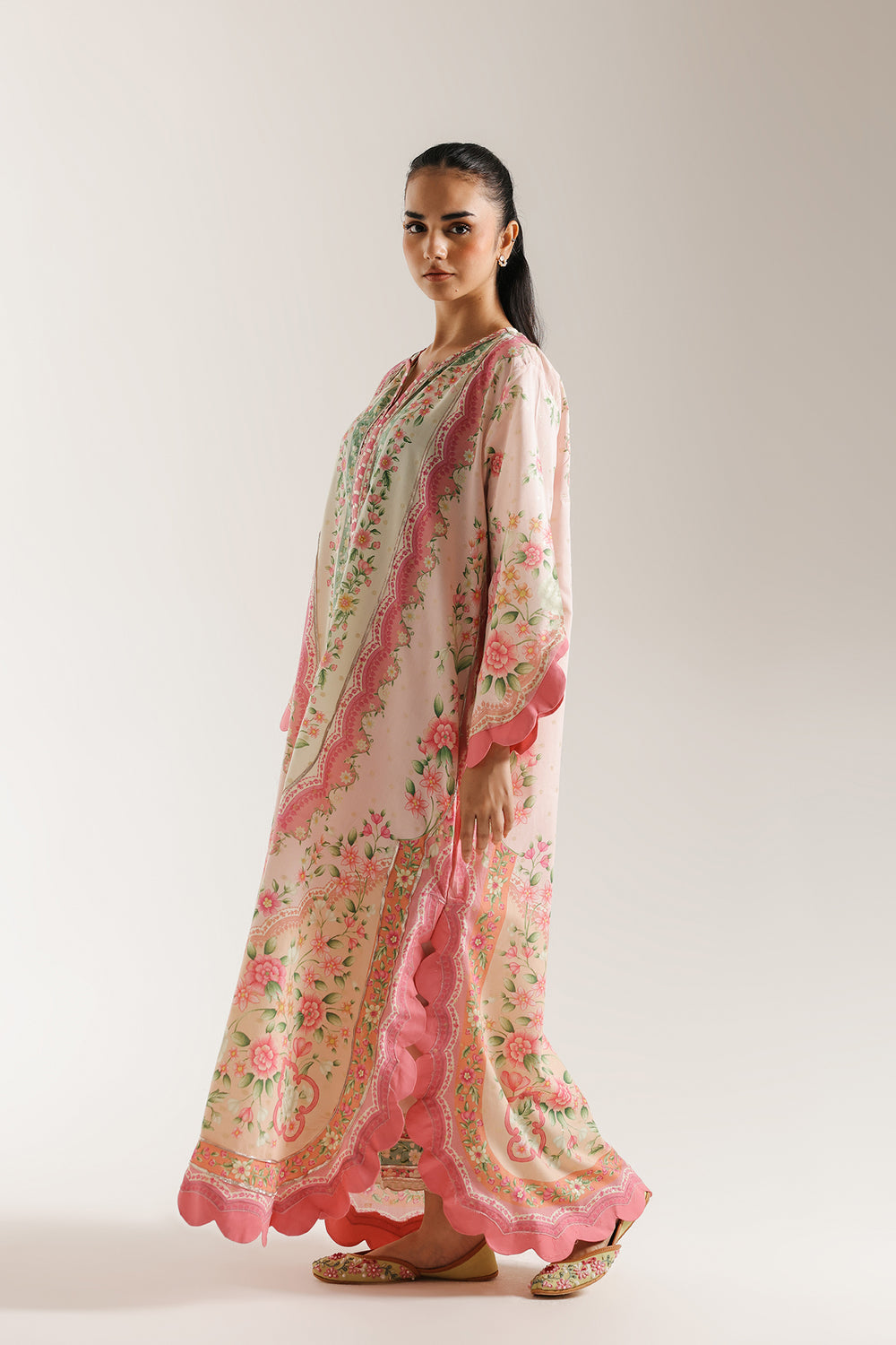 This breathtaking suit is a true work of art, featuring a stunning jacquard fabric with zari work that shimmers with a touch of gold. The shirt showcases a magnificent blend of intricate patterns and a rich color palette. The bodice and sleeves are adorned with a bold, geometric design in pink, and green, while the lower half of the dress bursts with a beautiful floral print in shades of pink, and beige. The cuffs and hem are finished with a delicate scalloped pink trim, adding an elegant detail. This piece effortlessly combines traditional craftsmanship with a majestic design, making it a perfect choice for a grand celebration. Paired with a matching culotte trouser.