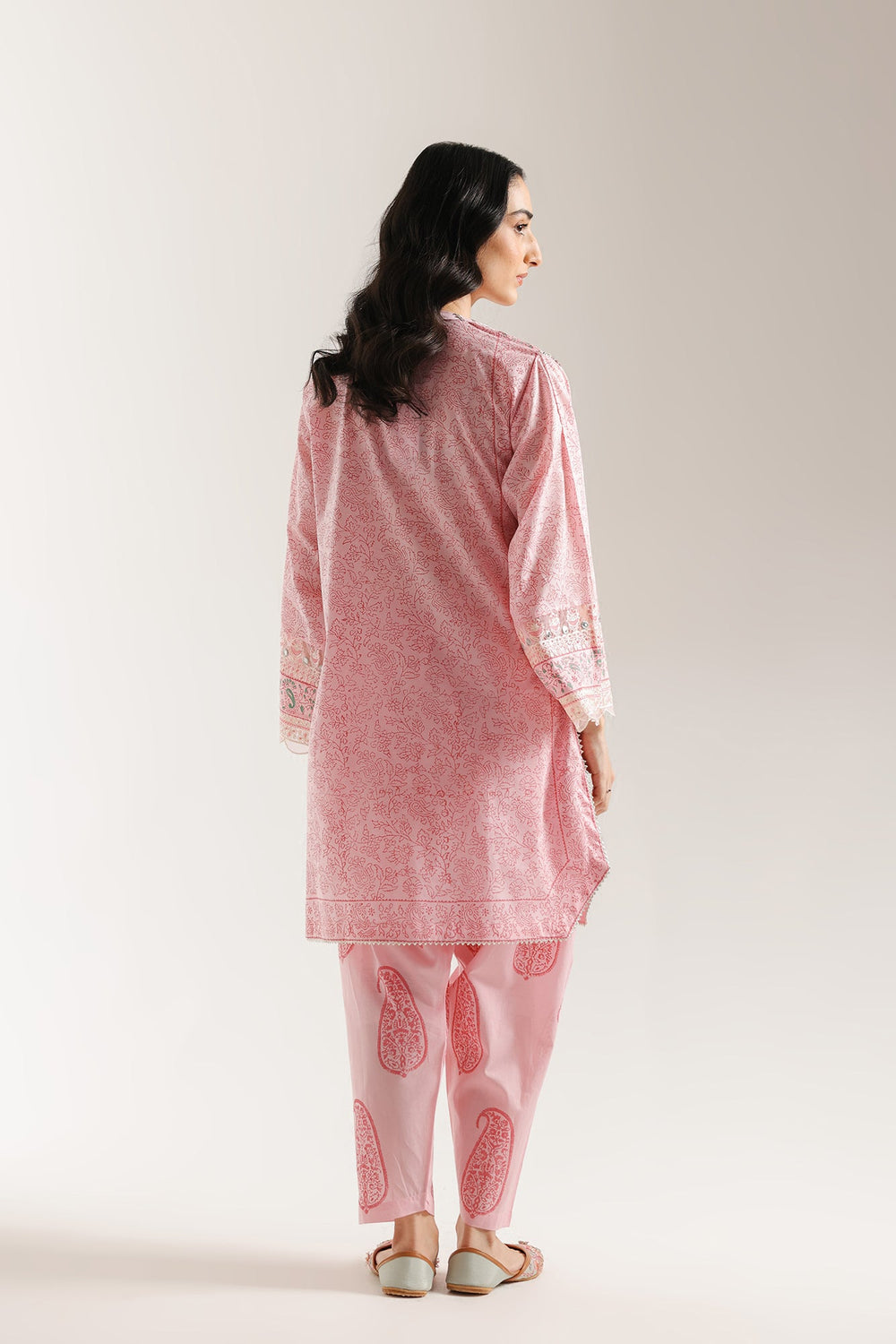 Embrace a soft, feminine charm with this delightful pink embroidered suit. The straight-cut kurta is adorned with a subtle all-over print and features exquisite white and green embroidery in stylized floral patterns that beautifully frame the neckline and chest. The sleeves are finished with a delicate lace trim. The ensemble is perfectly completed by tailored shalwar in a matching pink, which feature large, elegant paisley print, creating a cohesive and graceful traditional look.