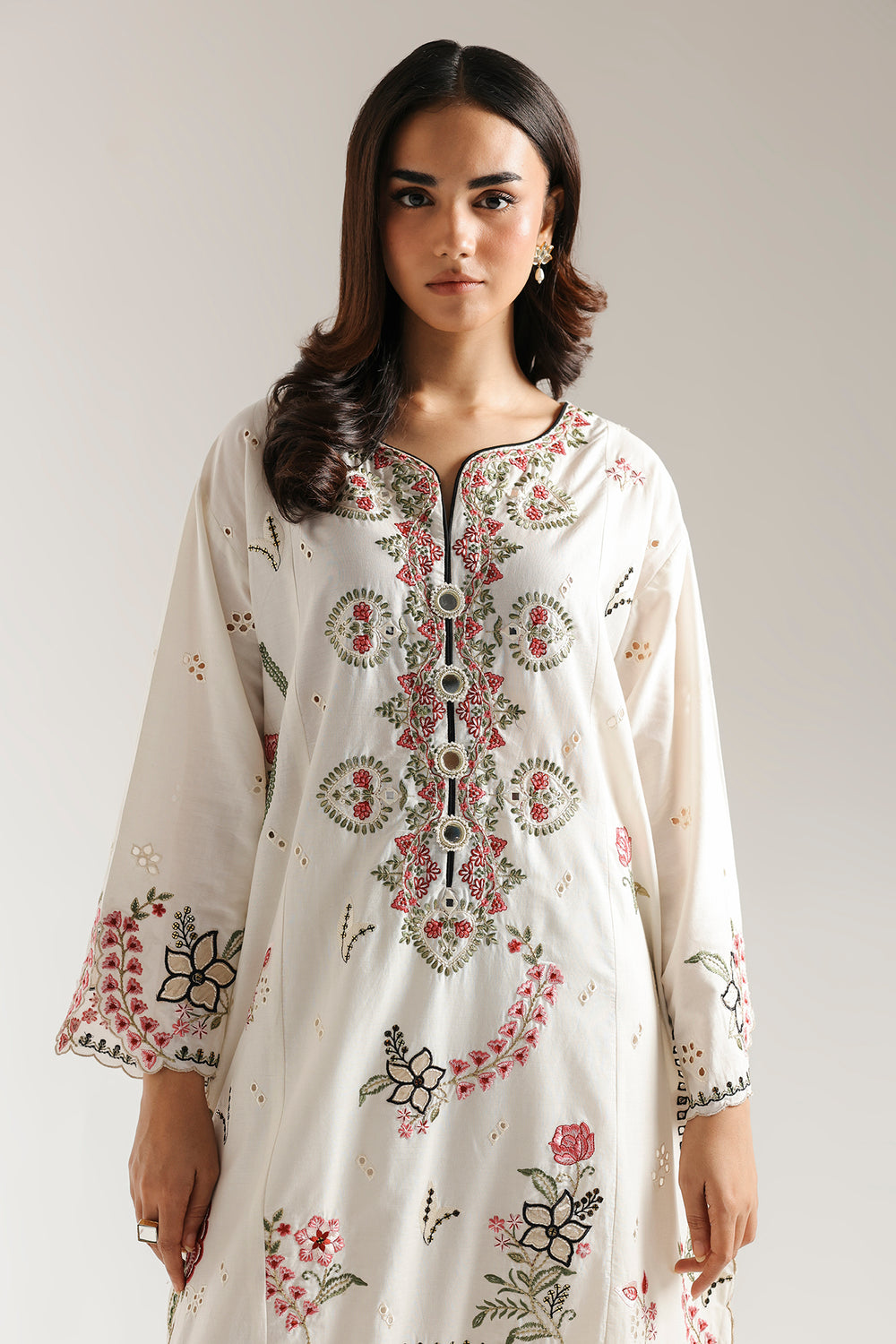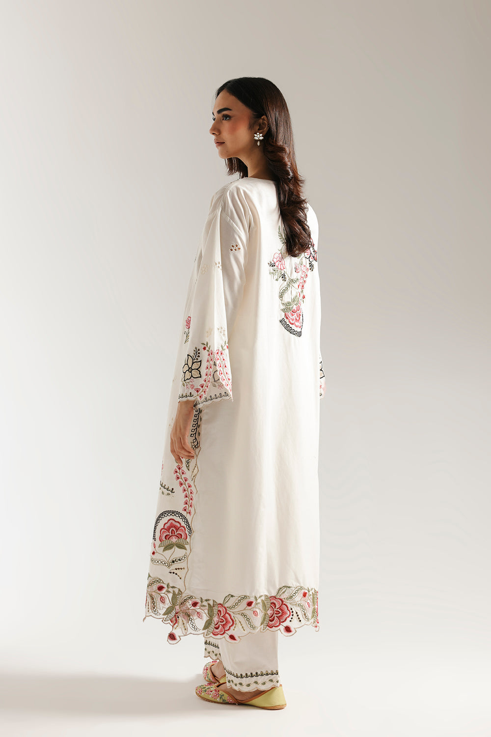 This sophisticated embroidered suit is a beautiful display of artistry and elegance. The soft, off-white kurta is a canvas for intricate floral embroidery in vibrant shades of pink, red, and green. With its detailed patterns, beautifully scalloped hem, and a perfectly coordinated trouser, this ensemble is a stunning and timeless choice.