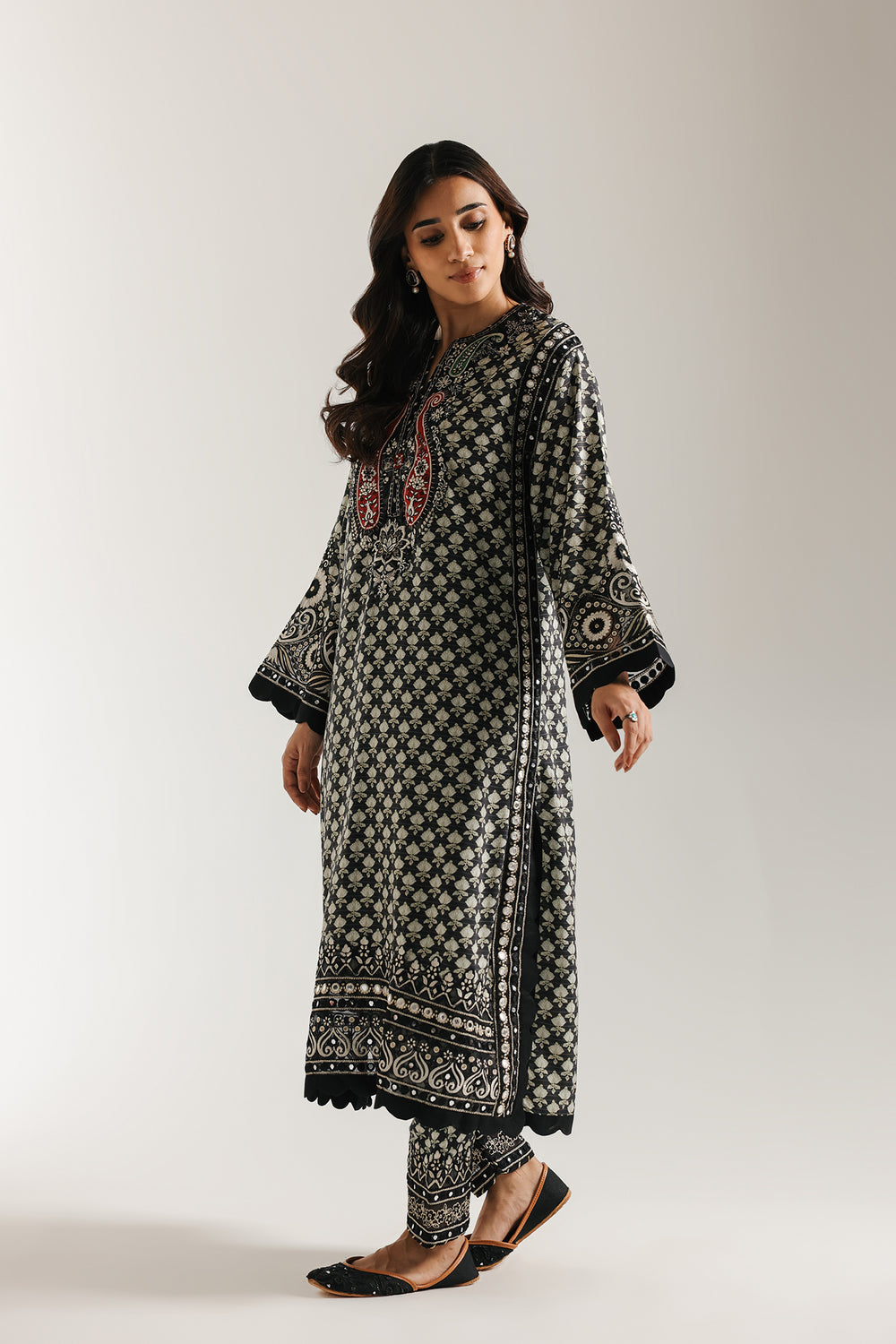 Step into dramatic elegance with this captivating black embroidered suit. The long, straight-cut kurta features an intricate all-over white geometric print that creates a dense, mesmerizing texture. The neckline is the centerpiece, adorned with rich embroidery in contrasting shades of red, green, and cream that form striking traditional motifs. The wide sleeves are finished with a beautifully scalloped cuff, mirroring the detailed hemline. The ensemble is perfectly completed by tailored shalwar that carry a coordinating, intricate print and is finished with matching embroidered hem, creating a stunning and cohesive look.