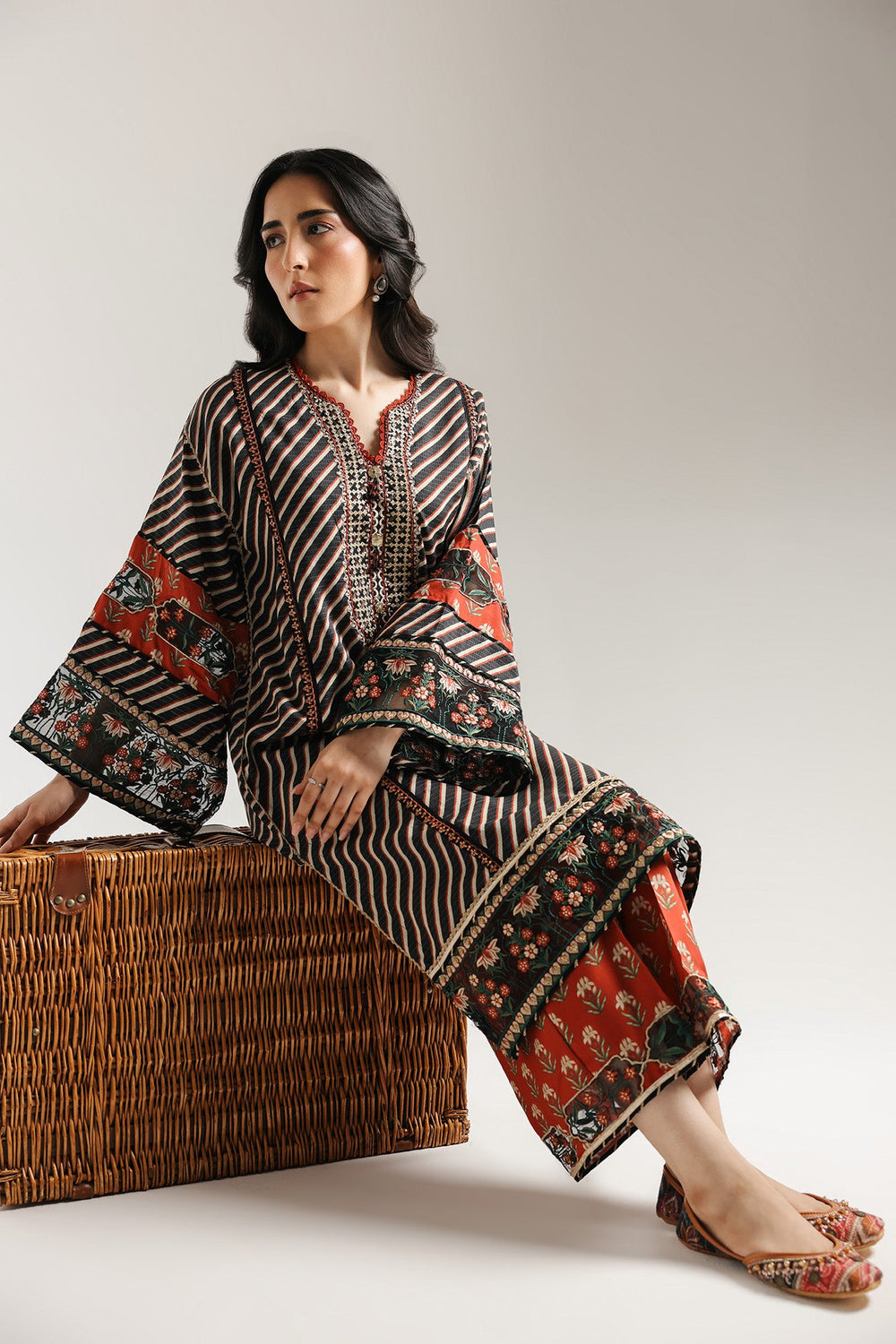 Embrace the rich tapestry of tradition. This striking embroidered suit features a captivating blend of patterns, with bold red stripes forming the base of the shirt. Intricate floral embroidery in vibrant reds, greens, and blacks adorns the borders, adding a touch of timeless elegance. This ensemble is a celebration of detailed craftsmanship and vibrant design, perfect for making a sophisticated statement.