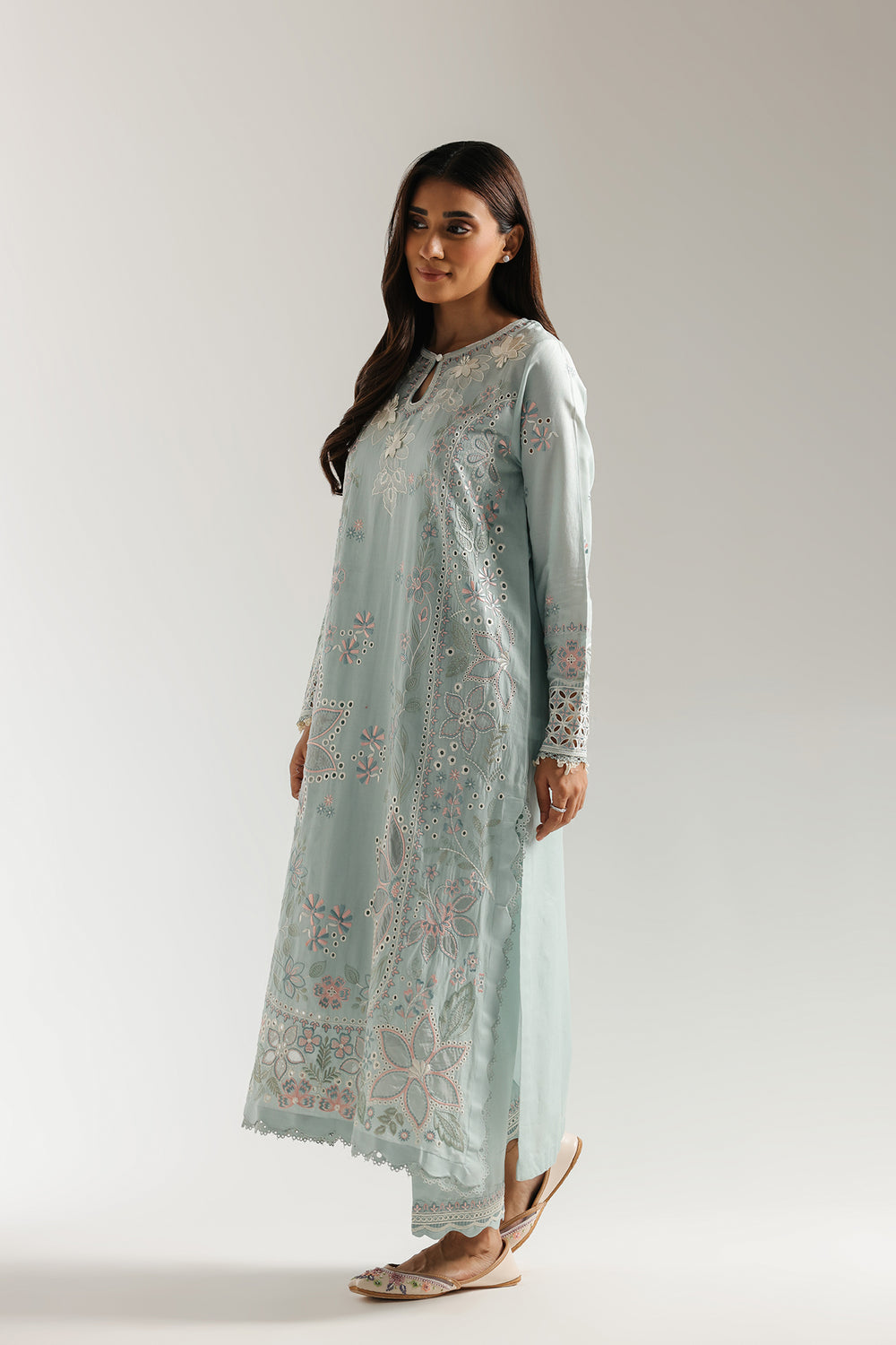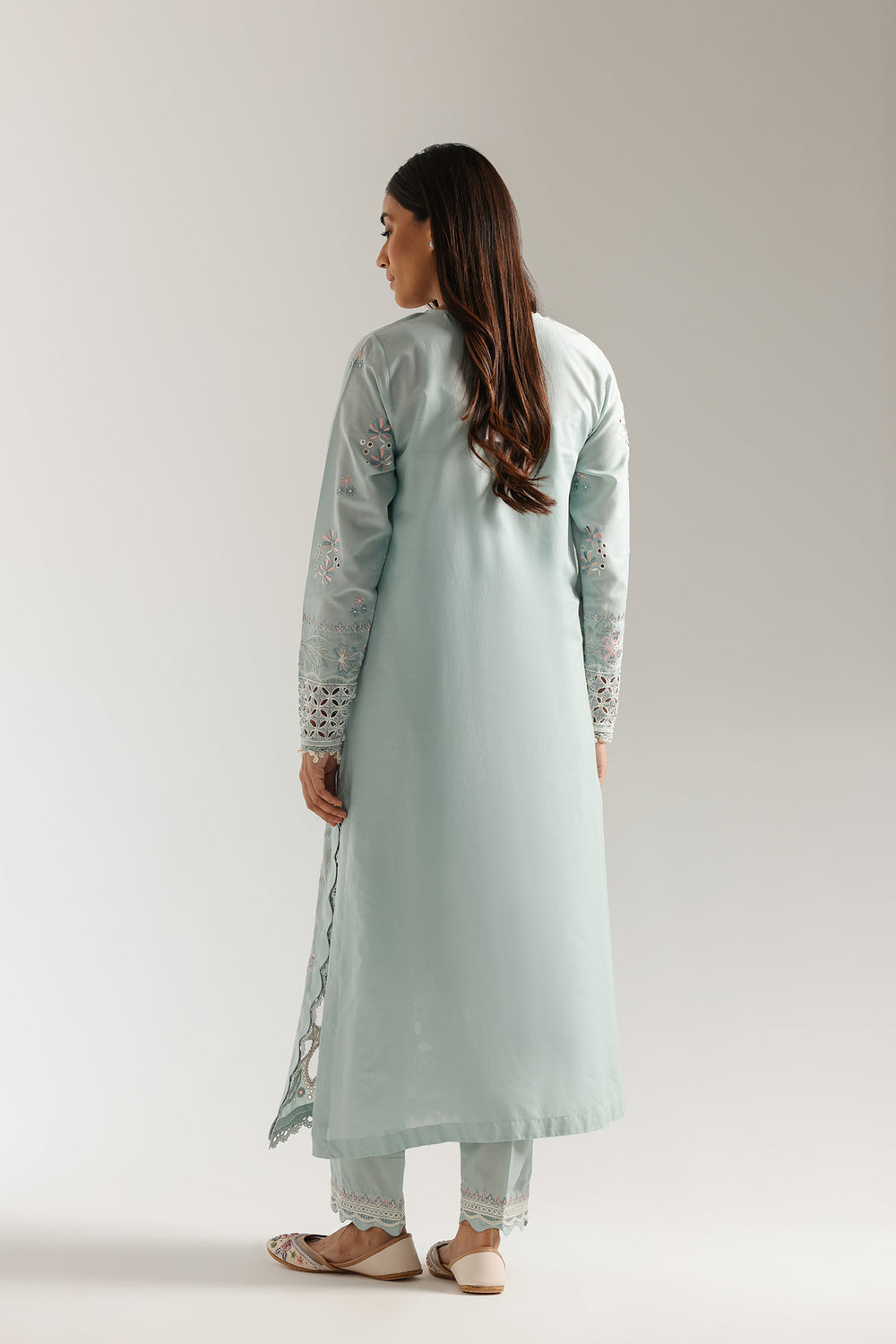 An ode to elegance, this exquisitely crafted embroidered suit in a delicate pastel green hue is a vision of ethereal beauty. The intricate floral patterns, meticulously embroidered, create a captivating design across the fabric. A beautifully scalloped hemline on the shirt and trousers adds a touch of whimsical charm to this sophisticated ensemble. This suit is perfect for a special occasion, offering a blend of traditional artistry and contemporary grace.