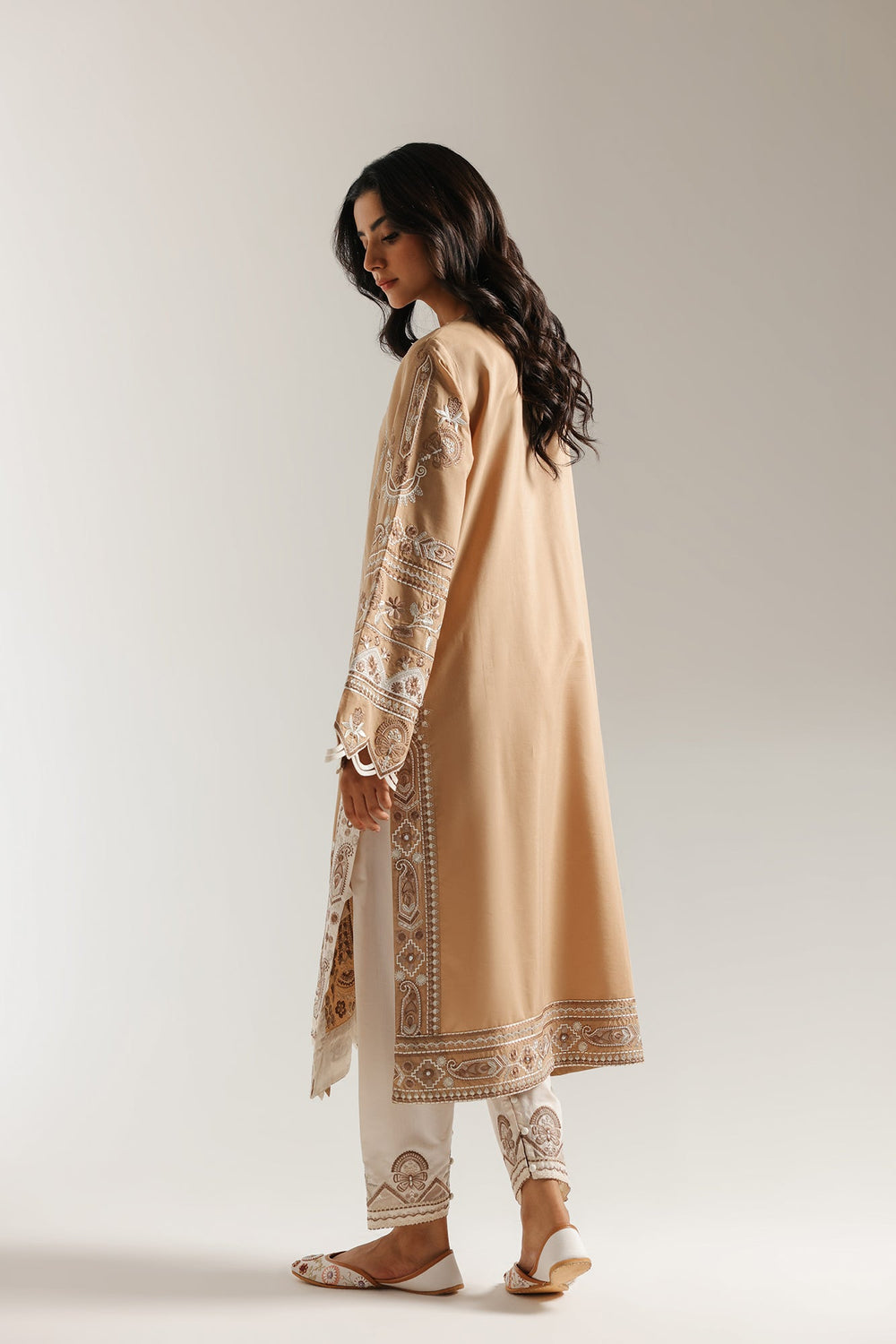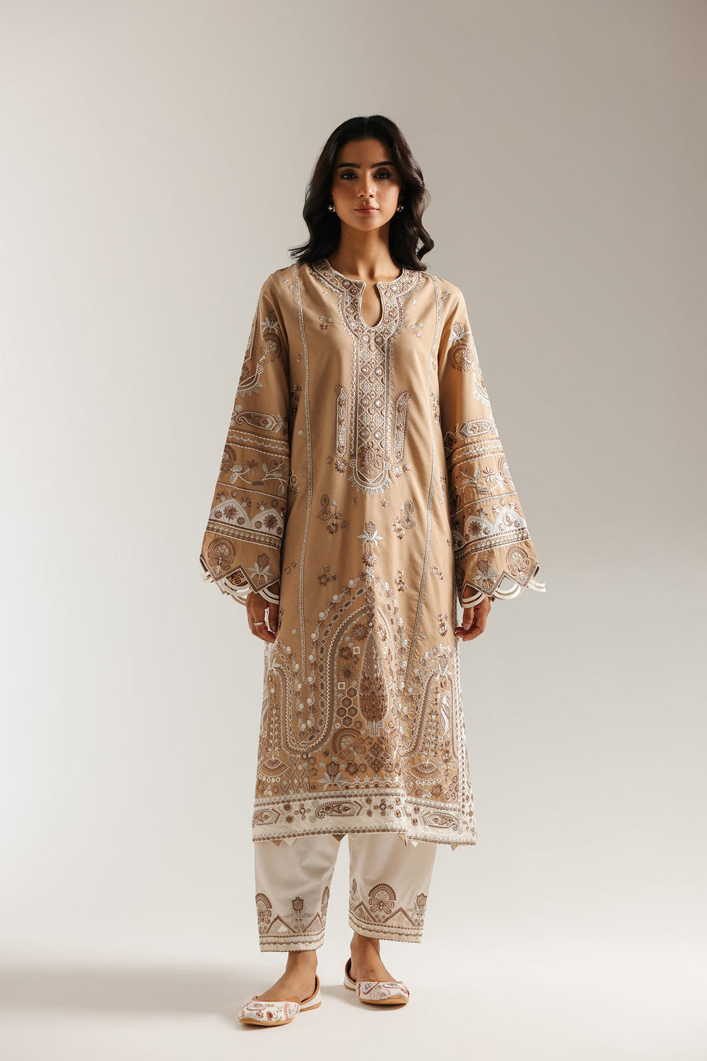 Embrace the serene beauty of this embroidered suit. This two-piece ensemble is a true masterpiece of intricate design. The soft, neutral base of the long shirt serves as a graceful canvas for the elaborate floral and geometric embroidery in a beautiful palette of white and off-white. The detailed threadwork and intricate patterns on the neckline, front, and sleeves create a truly mesmerizing look. The suit is completed with matching shalwar, making it an ideal choice for any formal gathering.