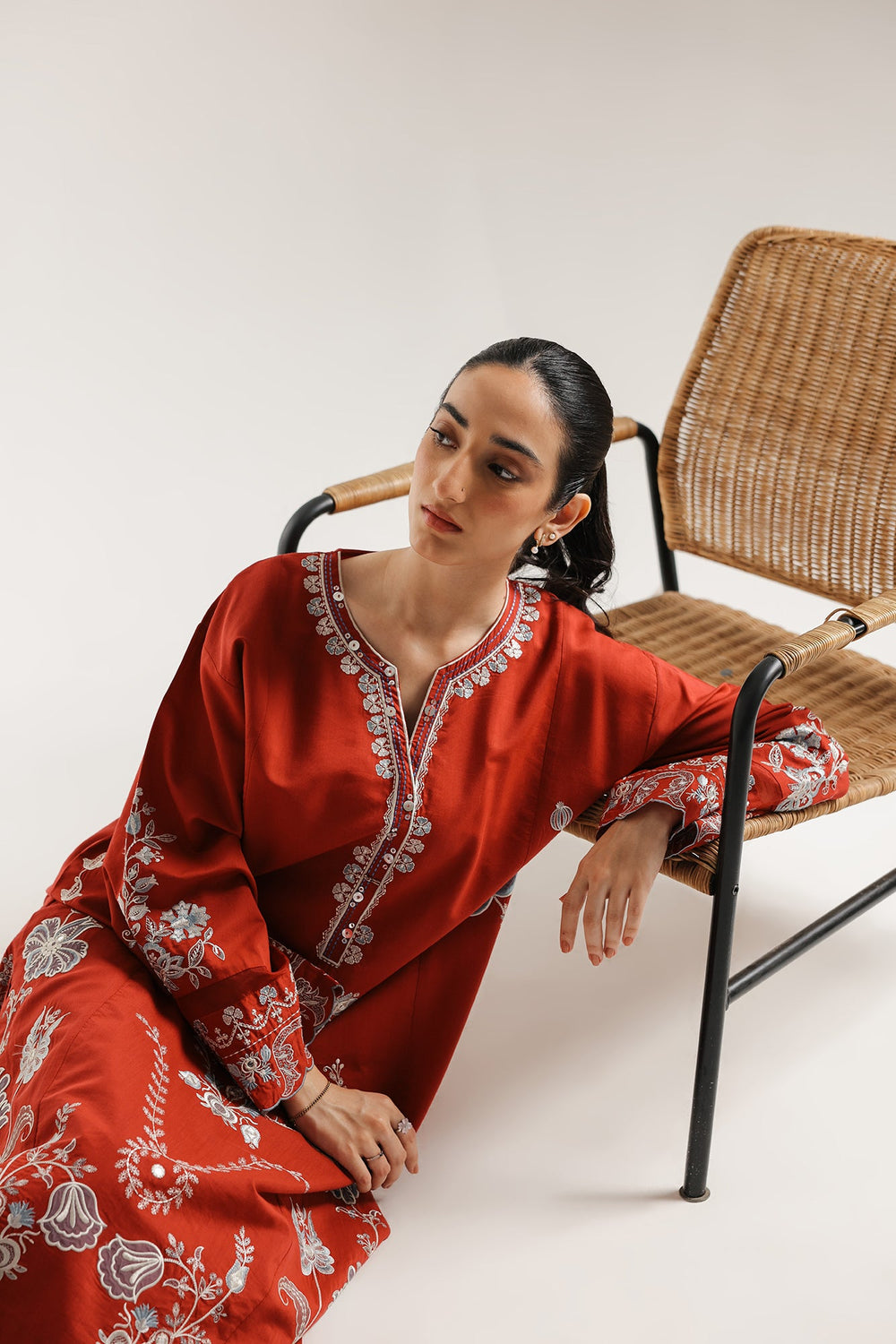 Command attention in this breathtaking rust-colored embroidered Suit. The long, straight-cut kurta is a magnificent display of artistry, adorned with intricate embroidery in detailed floral and stylized geometric patterns that cover the entire front, neckline, and cuffs of the wide, flowing sleeves. The ensemble is perfectly matched with tailored trousers in the same rich hue, which feature subtle embroidery detailing at the hem, creating a powerfully cohesive and traditional look that is ideal for any grand occasion.