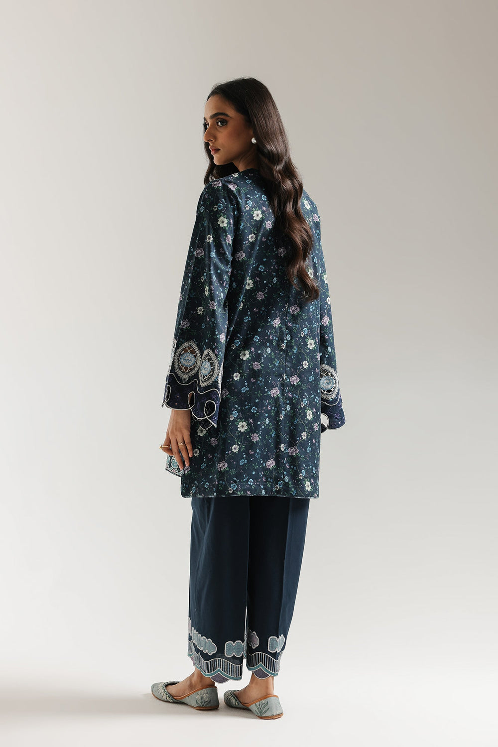 Step out in rich, artistic style with this sophisticated black embroidered suit. The straight-cut kurti is crafted from a dark, midnight blue fabric and features a detailed all-over floral print in shades of lilac and light blue. The front is elegantly accented with detailed multi-colored embroidery along the neckline. The long, wide sleeves are finished with contrasting borders and embroidery, adding to the visual depth. The suit is completed by tailored trouser in a matching dark blue. The hem of the trouser is adorned with an artistic scalloped embroidered border featuring cloud-like motifs, perfectly complementing the detailed top. This coordinated ensemble is ideal for an elevated, contemporary look.