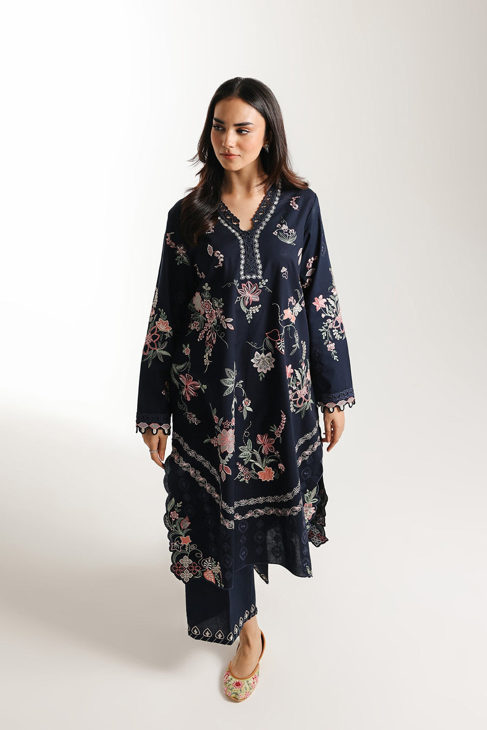 Capture deep, feminine elegance with this stunning navy blue embroidered suit. The straight-cut kurta is lavishly detailed with traditional floral and vine embroidery in soft shades of pink, dusty rose, and green that cascade down the front and sleeves. The elaborate neckline is highlighted with fine stitching, and the hem is beautifully finished with delicate embroidered pattern that features circular motifs. The ensemble is perfectly completed by tailored trousers that feature subtle embroidered accents at the cuff, creating a graceful, luxurious, and cohesive look.