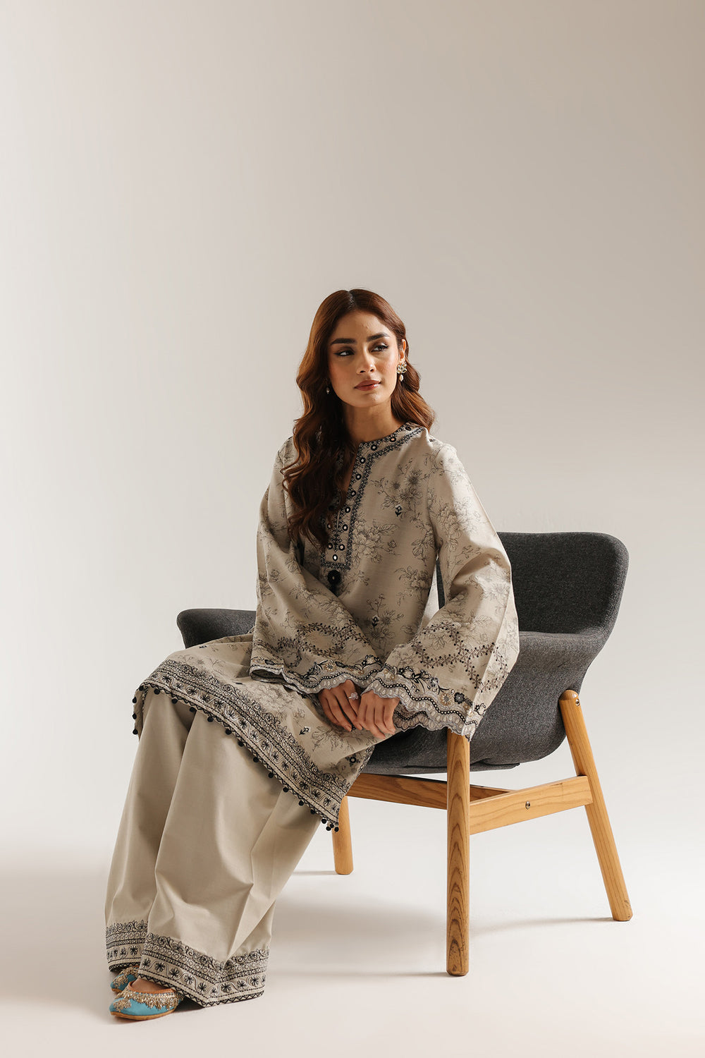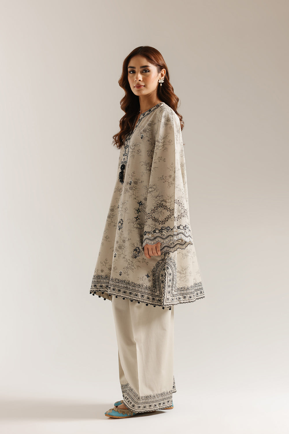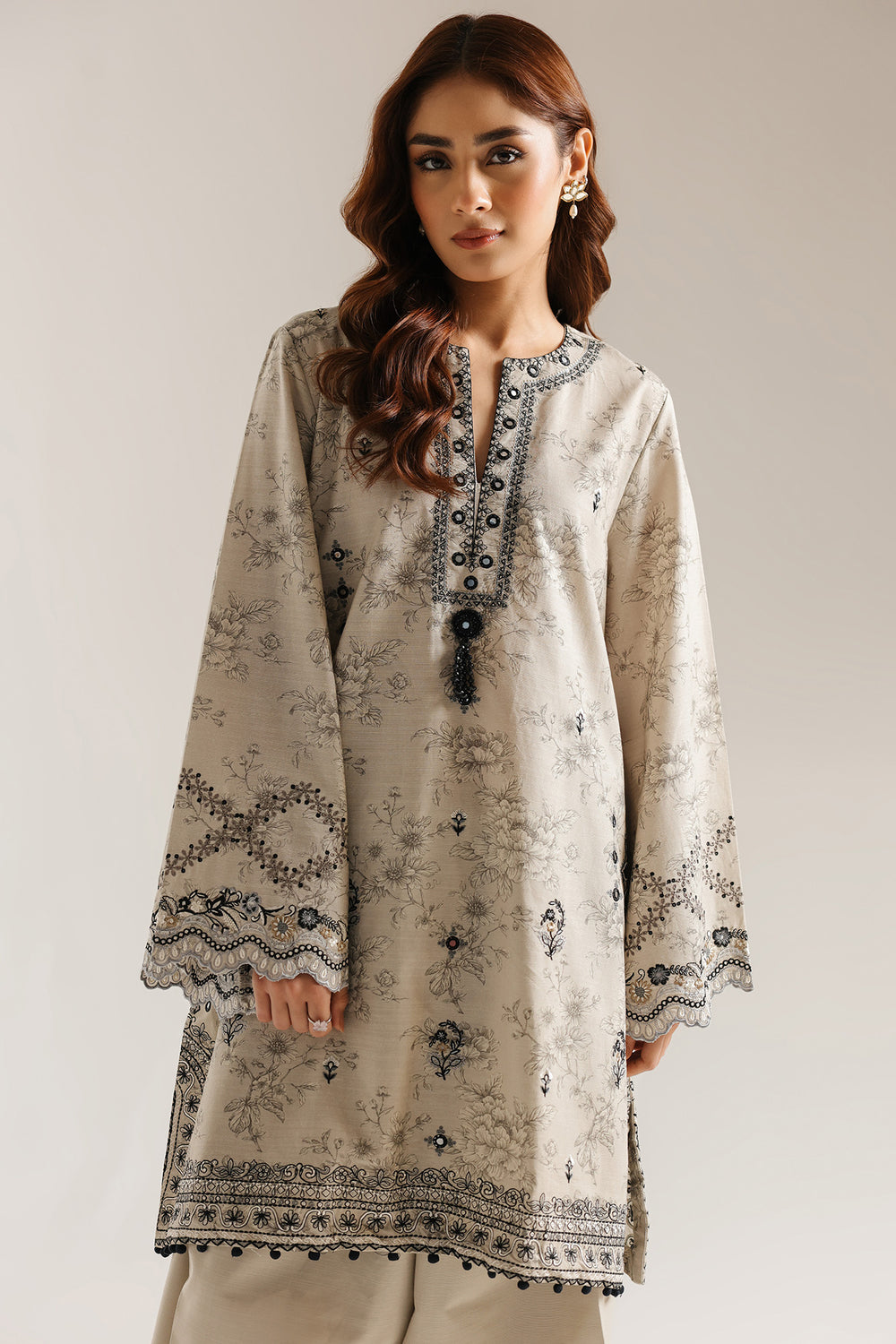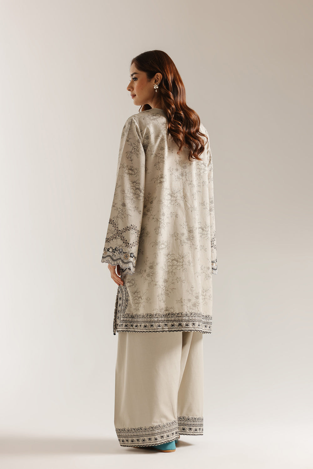 Elevate your wardrobe with this sophisticated embroidered suit crafted from luxurious coconut milk fabric. The ensemble features intricate black embroidery detailing that adds refined elegance to the classic silhouette. Long, flared sleeves provide graceful movement and a contemporary edge, while the regular-length cut ensures versatile styling for various occasions. The wide-leg shalwar completes the look with comfort and poise, making this piece an essential addition to your traditional wear collection. Perfect for celebrations, gatherings, or everyday sophistication.