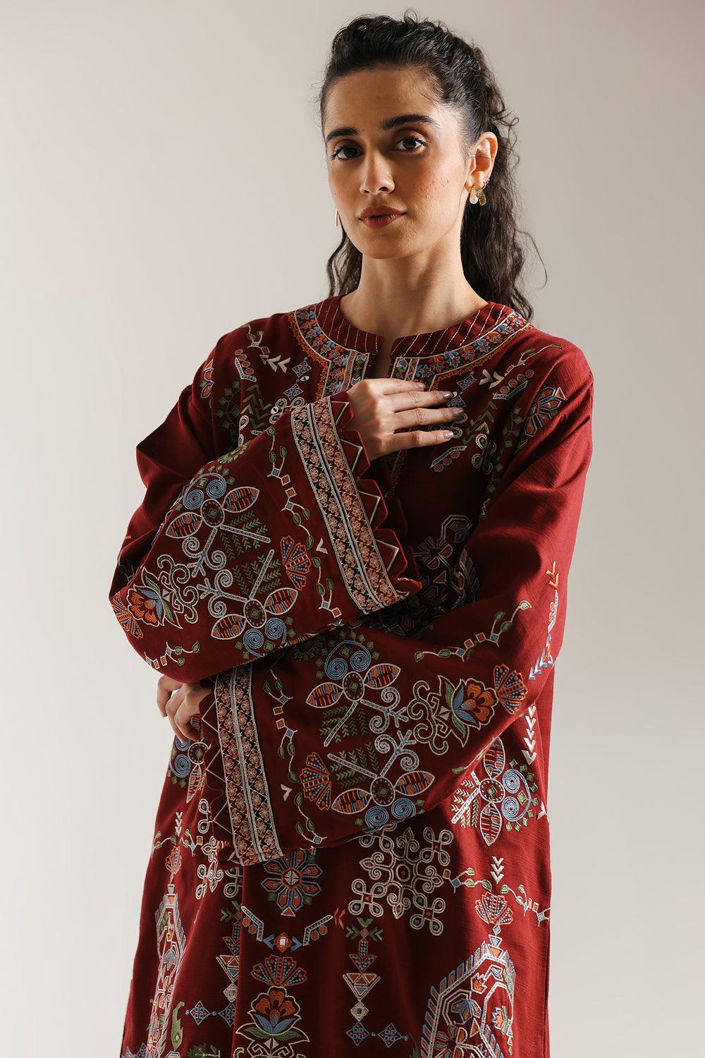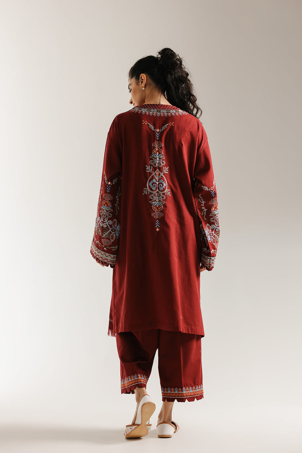 Ignite your look with the bold, earthy elegance of this deep mulberry embroidered suit. The long, straight-cut kurta is rendered in a vibrant reddish-maroon fabric that serves as a rich backdrop for the intricate multi-colored thread embroidery. The elaborate work, featuring traditional geometric and floral motifs in shades of blue, green, and white, completely covers the neckline and yoke and extends down the sleeves and hem. The hemline features a charming raw, frayed finish, adding a contemporary, textural touch. The ensemble is completed by matching maroon trouser that carry coordinating embroidered borders and a matching raw edge at the hem, creating a comfortable, luxurious, and cohesive traditional look.