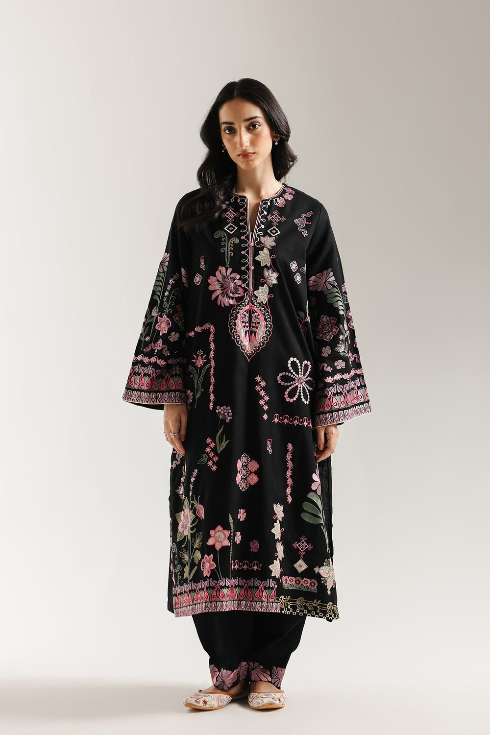 Adorn yourself in the exquisite craftsmanship of this striking black embroidered suit. The long, A line-cut kurta is a masterpiece of artistry, featuring a rich tapestry of floral and geometric embroidery in vibrant pink, green, and white threads that cover the entire front, hem, and wide, flowing sleeves. The intricate patterns create a captivating, eye-catching texture. The ensemble is elegantly completed with matching shalwar that showcase a complementary embroidered motif at the hem, resulting in a cohesive and richly detailed traditional statement.