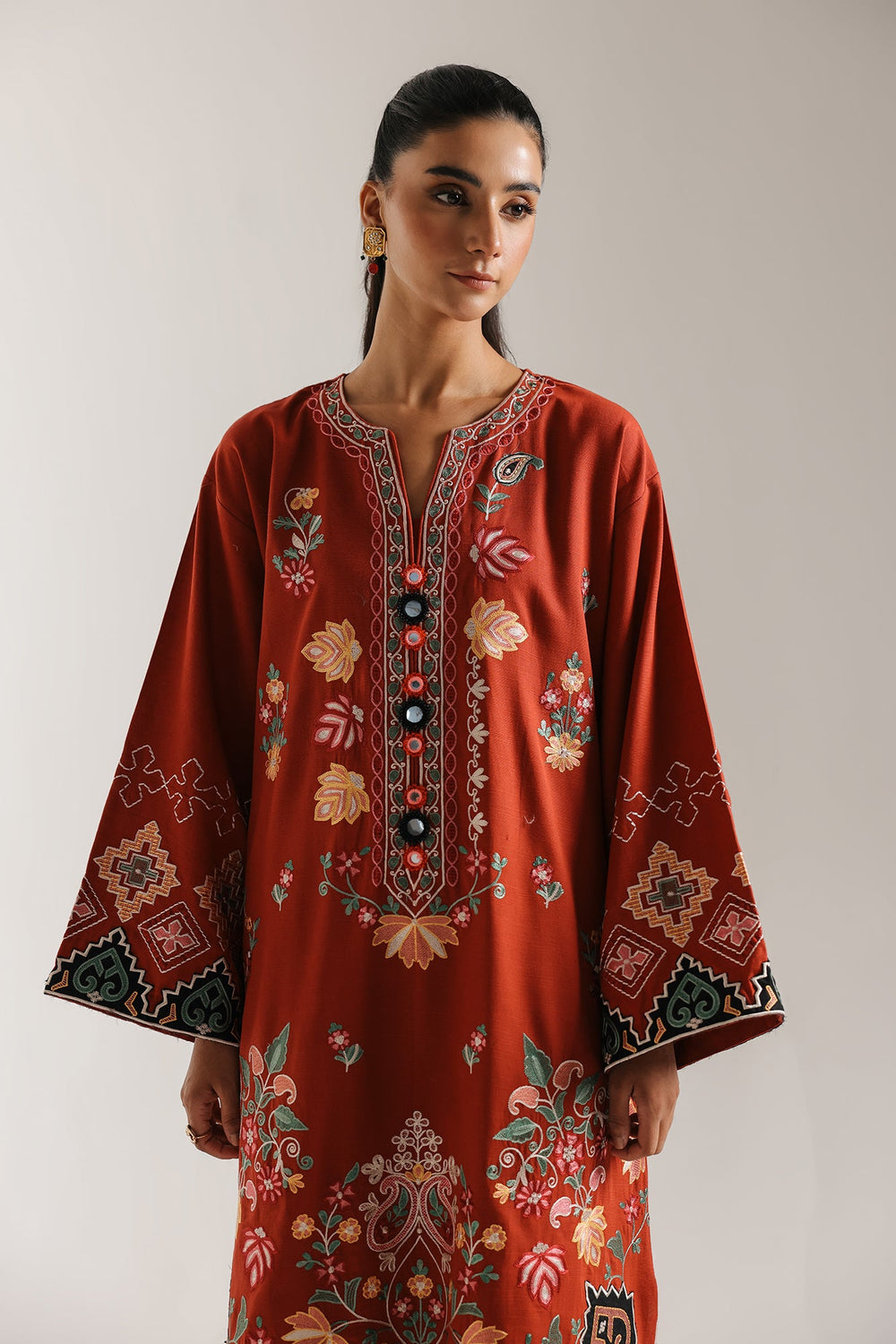 Ignite your festive style with the rich, luxurious tones of this stunning brick red embroidered suit. The long, A line kurta is crafted from a vibrant reddish-maroon fabric that serves as a bold foundation for the elaborate multi-colored thread embroidery. The front panel is completely adorned with rich floral motifs, aesthetic scallop borders at corners, and patch work. The front placket is adorned with croshia mirrors. The ensemble is completed by coordinating solid trousers in the same deep maroon, creating a spectacular and cohesive traditional look.