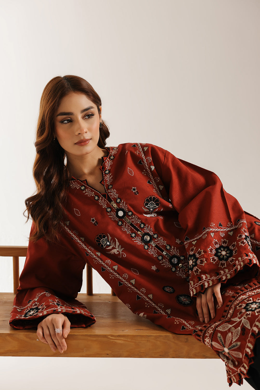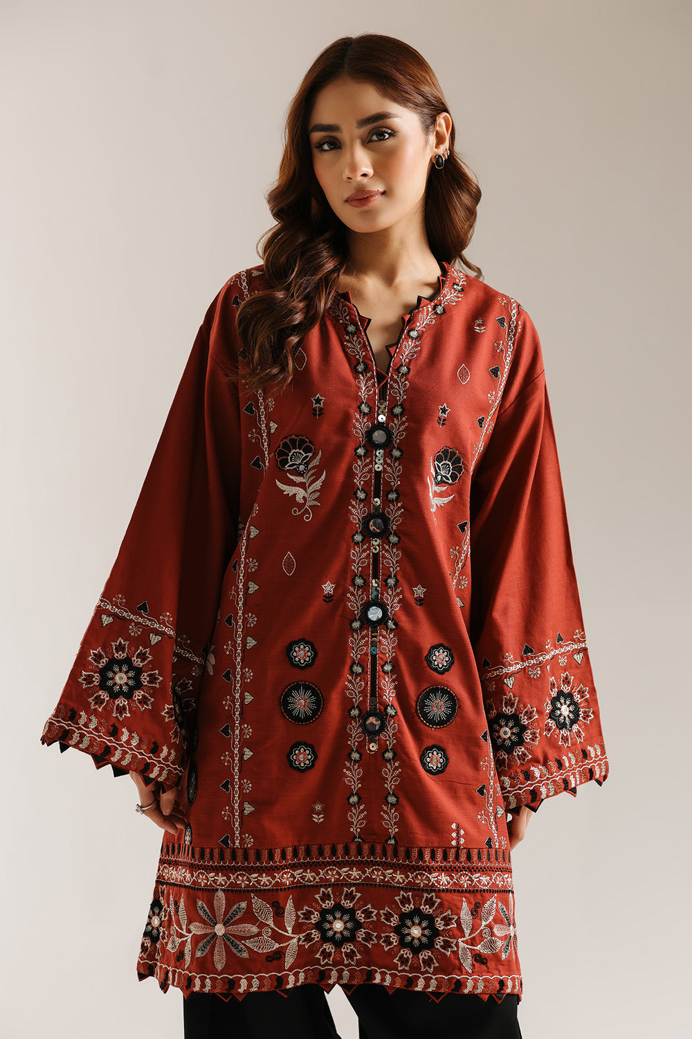 Elevate your wardrobe with this sophisticated V-neck shirt in warm spice tones, refined by intricate black embroidery detailing along the neckline, hem, and sleeve edges. Paired with wide-leg shalwar, the carefully placed embroidered borders create a polished aesthetic that transitions seamlessly from casual to semi-formal occasions. Crafted with attention to traditional design elements, this piece combines comfort with understated elegance, making it an essential addition to any discerning collection. The contrast embroidery adds visual interest while maintaining a timeless appeal.