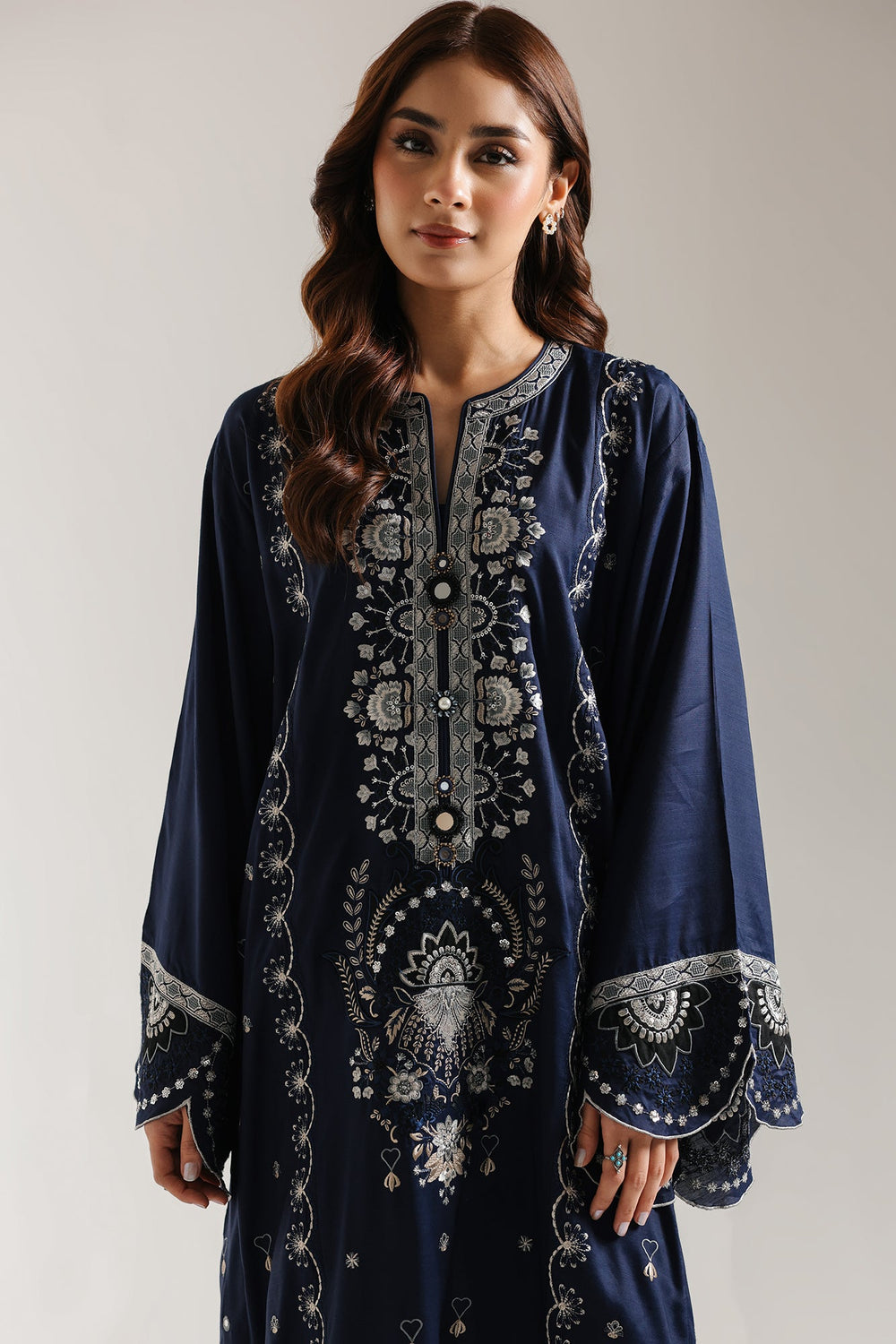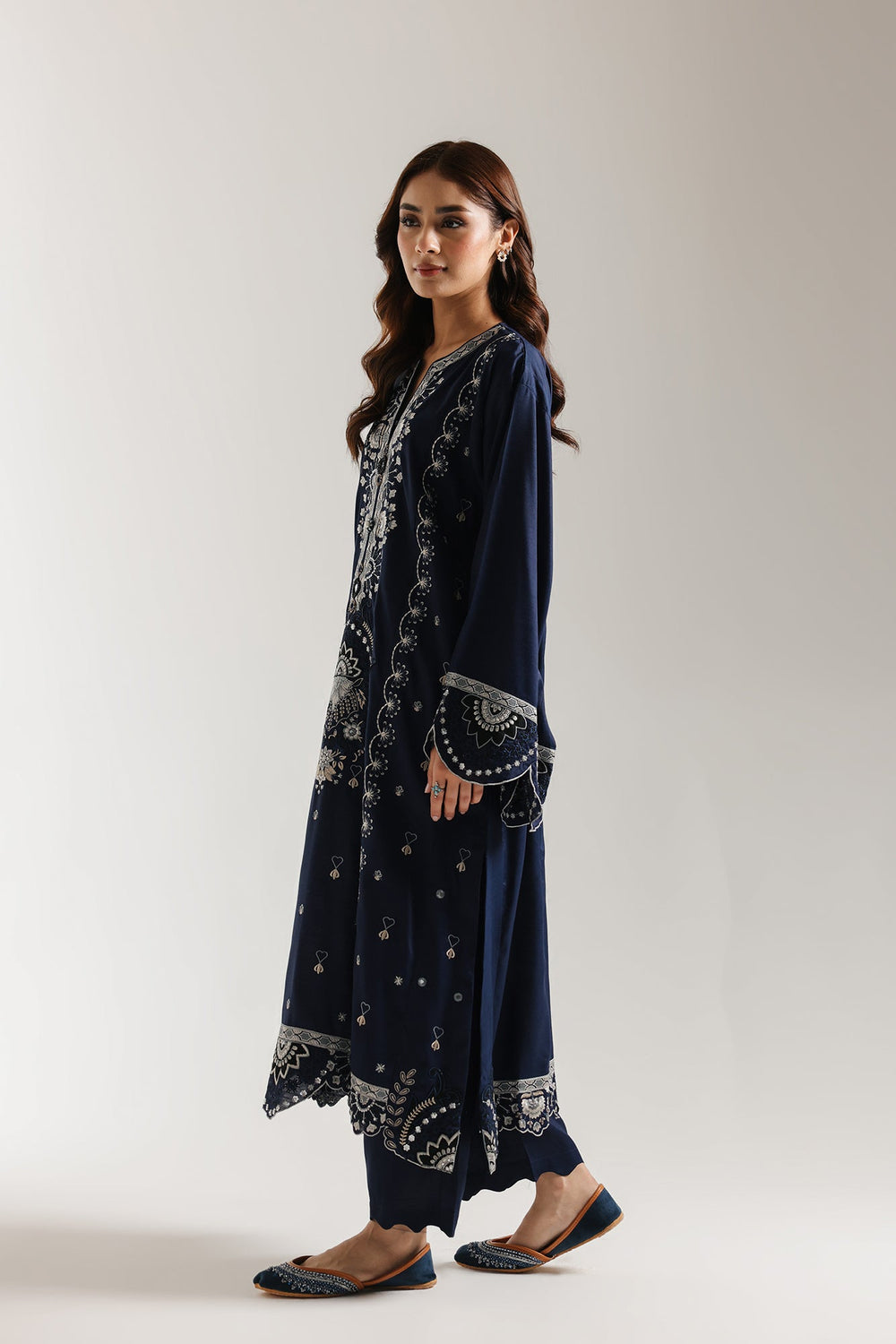 Experience the refined elegance of this meticulously crafted embroidered suit. The flowing A-line shirt presents a symphony of symmetrical design, adorned with exquisite thread and cutwork embroidery in contrasting white and light blue tones. Intricate floral and traditional motifs form striking vertical columns across the front, while the neckline, expansive sleeves with wide scallops, and hemline are finished with graceful scalloped cutwork detailing that elevates the overall aesthetic. The accompanying solid trouser creates a harmonious, polished ensemble that exemplifies traditional sophistication and exceptional artisanal execution.
