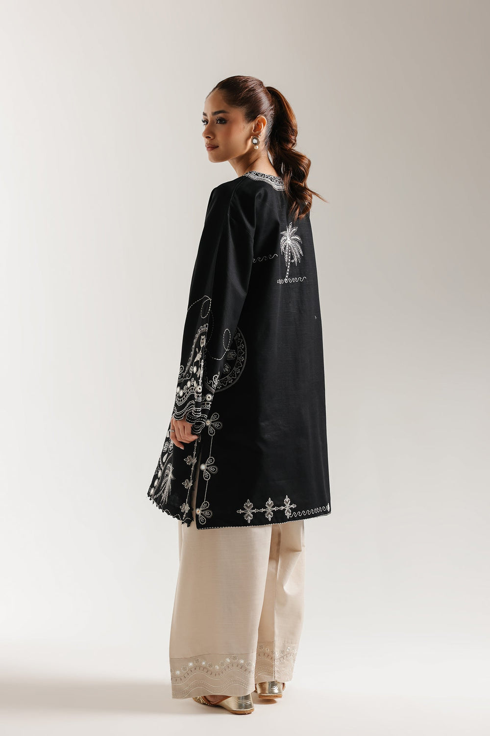 Discover the allure of vintage elegance with our stunning embroidered suit. This ensemble showcases a jet black shirt adorned with intricate floral embroidery and crochet mirror work at the neckline, reflecting classic craftsmanship. The sleeves and hem are elegantly detailed with embroidered borders. Complementing this striking piece is a pair of contrasting loose-fit shalwar, featuring a beautifully embroidered border along the hem.