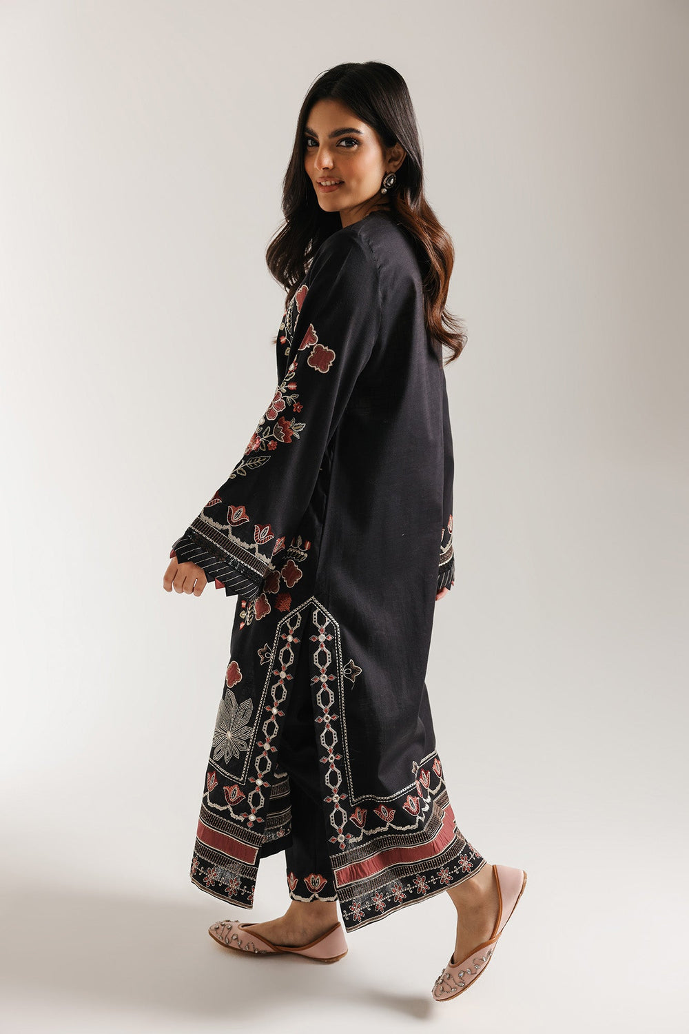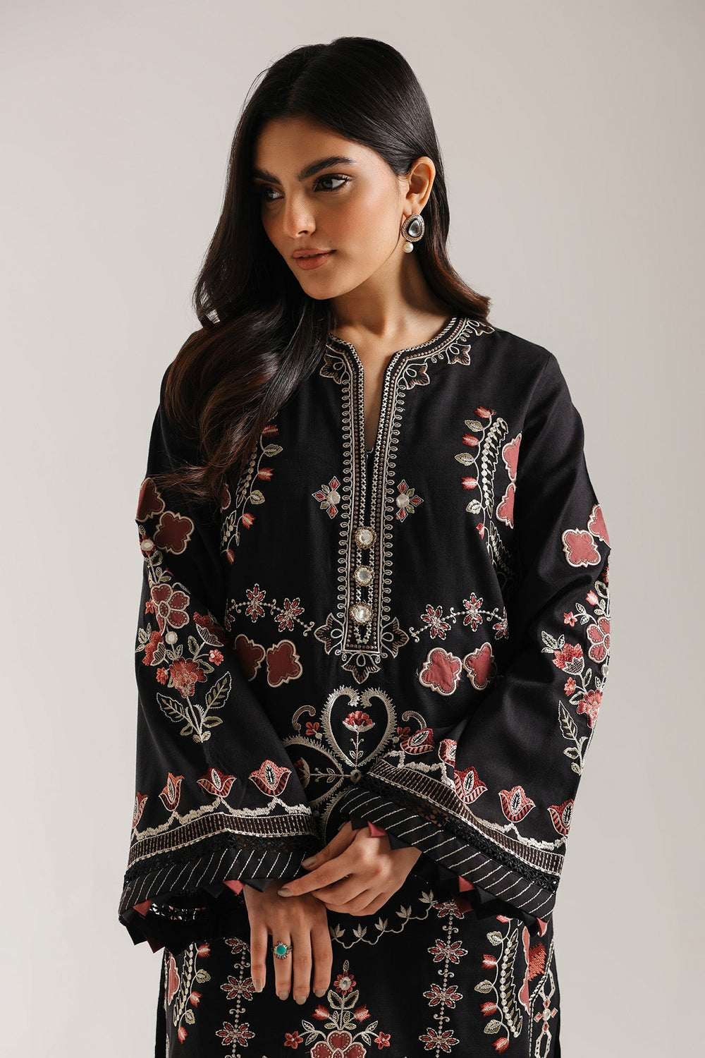 Elevate your wardrobe with this sophisticated embroidered suit featuring a black long shirt adorned with intricate embroidery throughout. The design showcases full sleeves with elegant flair and a classic round neckline enhanced by a refined slit detail. Paired with matching culottes that feature beautifully embroidered edges, this ensemble delivers timeless elegance with contemporary flair. Perfect for formal occasions and celebrations, the expert craftsmanship ensures a polished, refined appearance that captures traditional artistry with modern sensibility.
