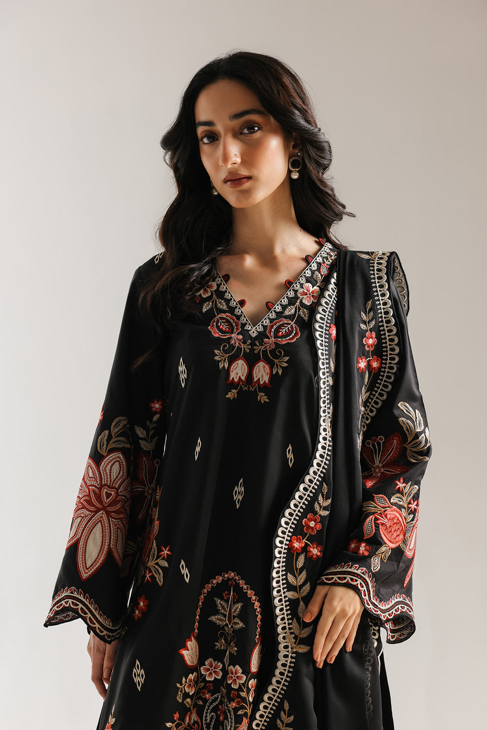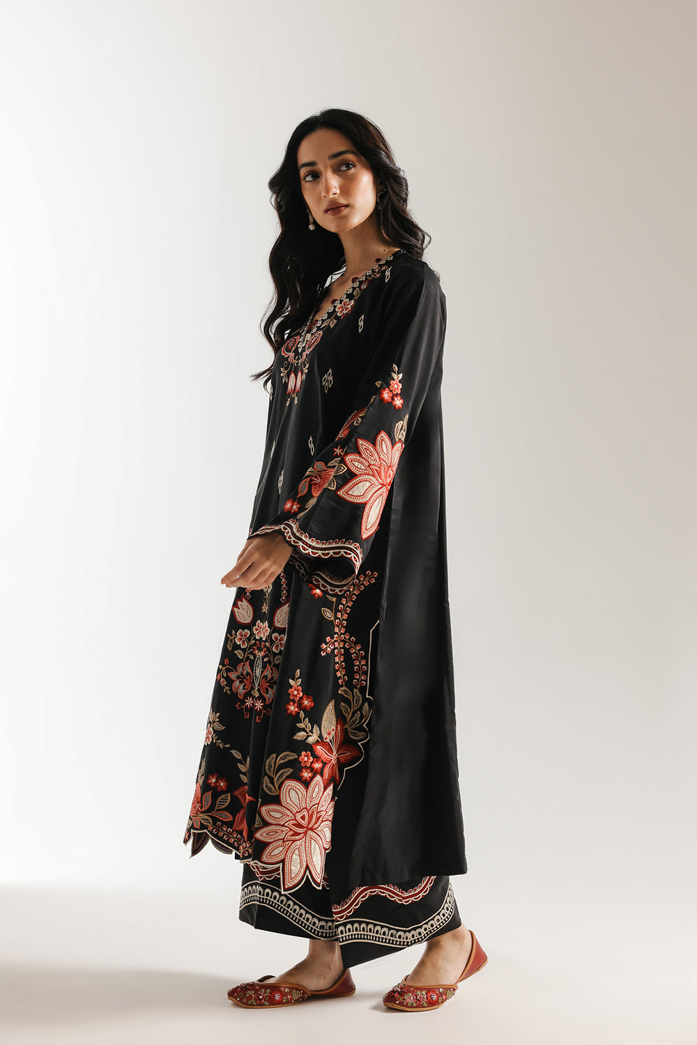 Command the room in this breathtaking three-piece ensemble, where the timeless allure of deep black meets a vibrant symphony of crimson and rust artistry. The long shirt features a sophisticated V-neckline, intricately framed with delicate floral embroidery and traditional scalloped edges. A dramatic central panel showcases a lush garden of blooming lilies and architectural motifs, while large-scale floral accents on the sleeves and hemline create a bold, high-contrast look. The ensemble is elevated by a sheer, lightweight dupatta featuring an elaborate scalloped border that echoes the shirt’s intricate threadwork, draped gracefully for a look of regal sophistication. Coordinated trouser with striking embroidered ankle border ensure a polished finish, making this suit a premier choice for evening festivities and formal celebrations.