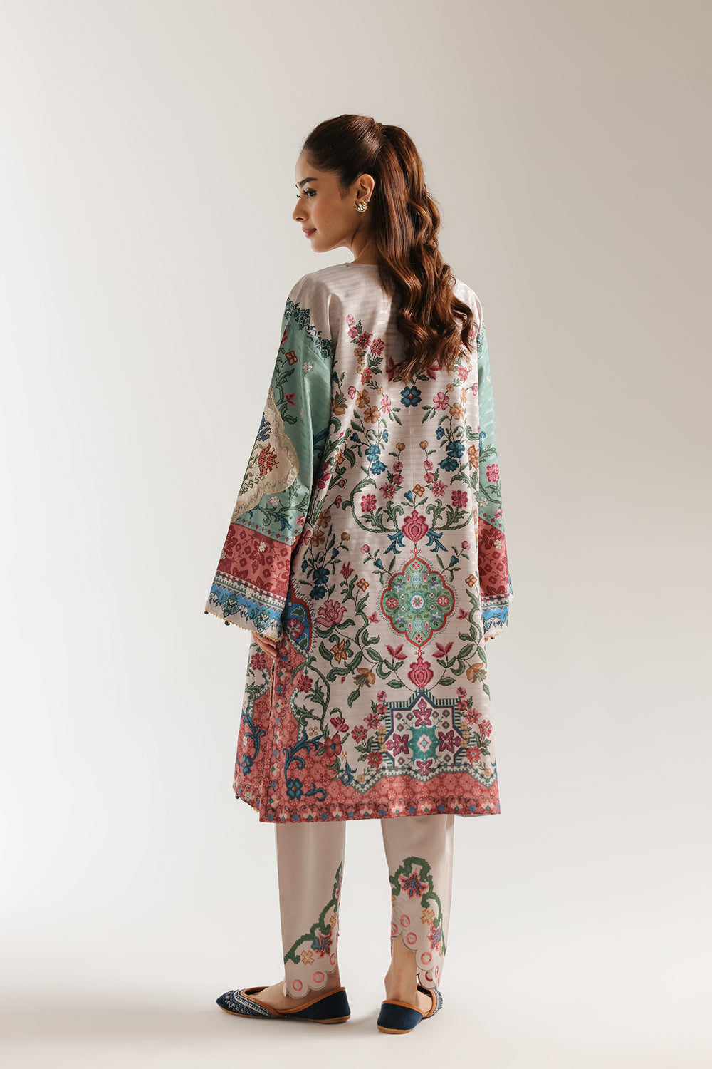 Radiate heritage-inspired charm in this stone-grey embroidered suit, where artisanal texture meets a rich, autumnal palette. The long-line tunic features a sophisticated split neckline and is adorned with overall scattered embroidery. Complemented by tapered fit, scalloped shalwar that mirror the tunic's refined craftsmanship, this ensemble is an exquisite statement of traditional grace and modern luxury.