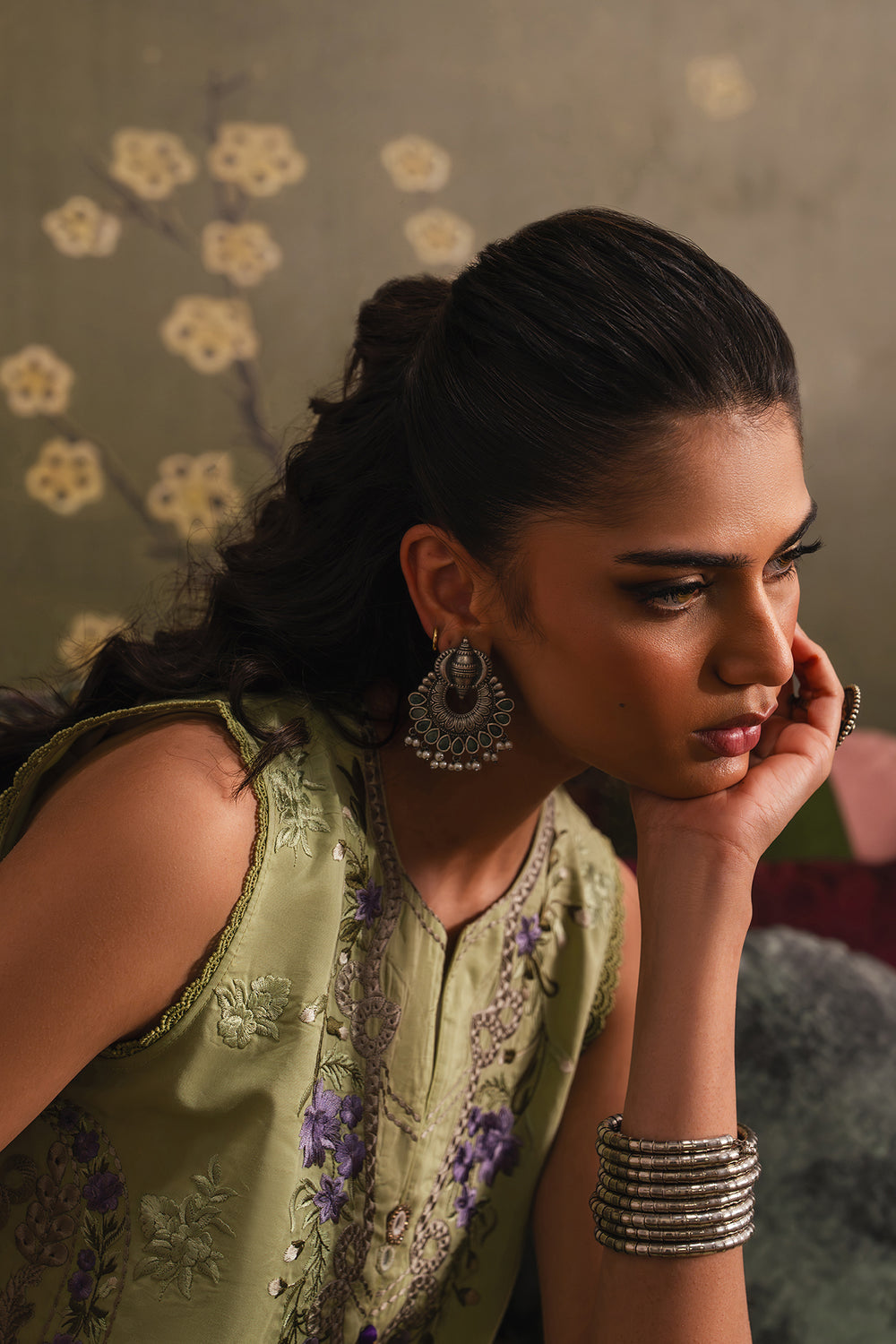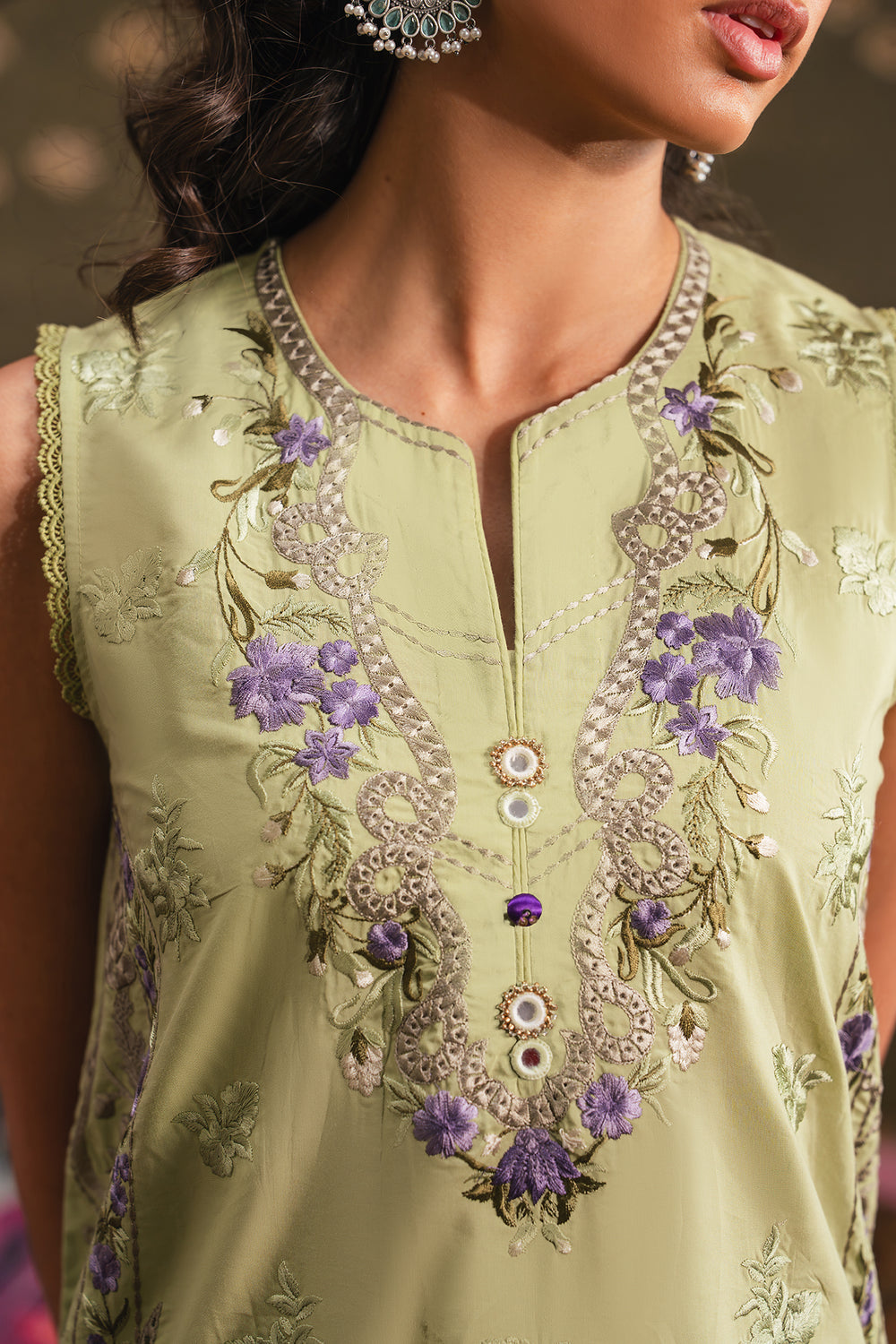 This elegant embroidered suit for women is presented in a refreshing apple green shade, offering a sophisticated and modern look. The sleeveless tunic features a refined V-neckline, beautifully detailed with intricate purple and silver floral embroidery that cascades down the bodice. This delicate artistry continues along the hemline with a dense, ornate border, adding a touch of traditional luxury to the contemporary silhouette. The ensemble is paired with coordinating wide-leg shalwar and a matching dupatta in the same serene green tone. The shalwar is elegantly finished with matching purple and silver embroidery at the hem, creating a cohesive and high-end aesthetic. Crafted for both style and ease, this suit is an ideal choice for festive gatherings or formal daytime events, ensuring a polished and graceful appearance.