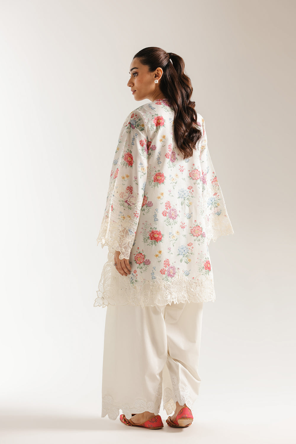 Embrace effortless grace in this ethereal off-white ensemble. Delicate floral print in soft pastels dances across the premium fabric, perfectly complemented by intricate lace detailing on the sleeves and hem. Paired with wide-leg shalwar, this look offers a sophisticated fusion of traditional charm and contemporary elegance for any occasion.