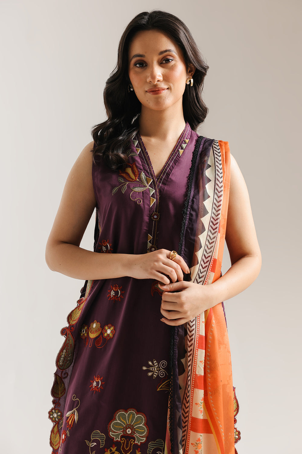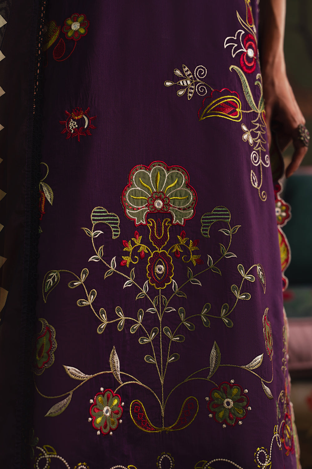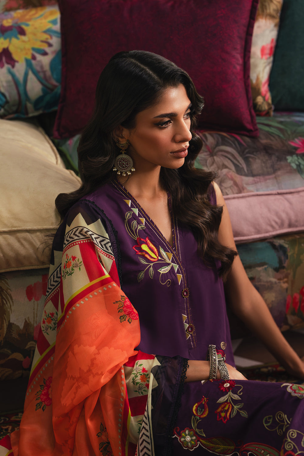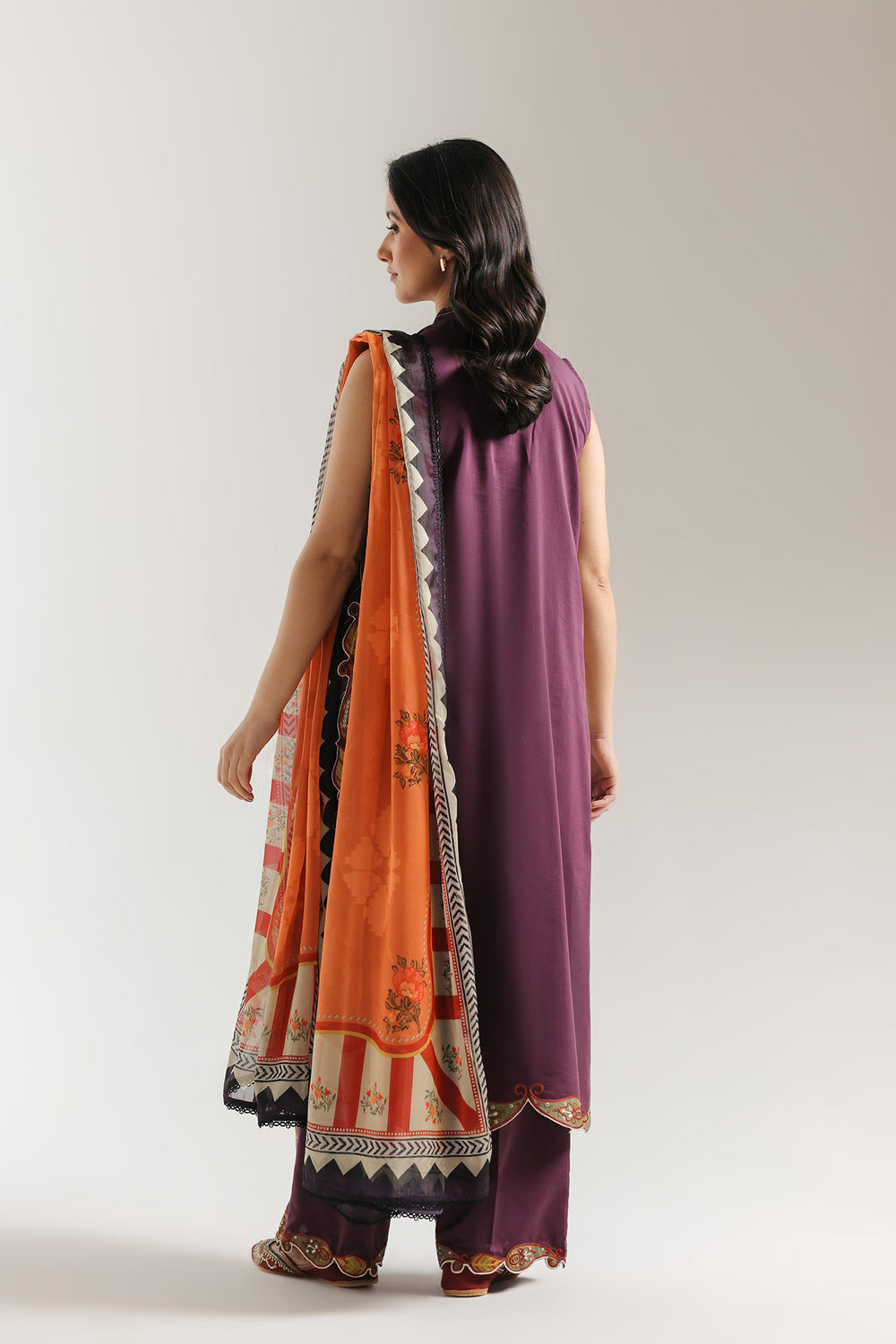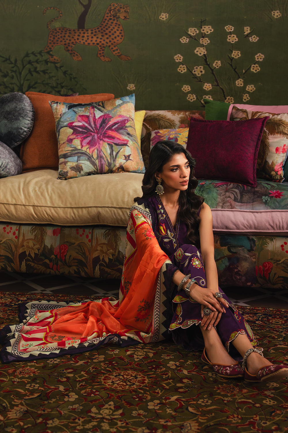 This sophisticated three-piece ensemble features a regal plum sleeveless shirt adorned with intricate multi-colored floral embroidery and a refined V-neckline. The shirt’s hemline showcases elegant laser-cut scalloping, a detail mirrored on the coordinating wide-leg trouser. To balance the deep tones, a vibrant dupatta in orange, black, and white adds a bold geometric contrast. The outfit’s blend of traditional motifs and a modern silhouette makes it an ideal choice for festive daytime events or semi-formal evening gatherings.
