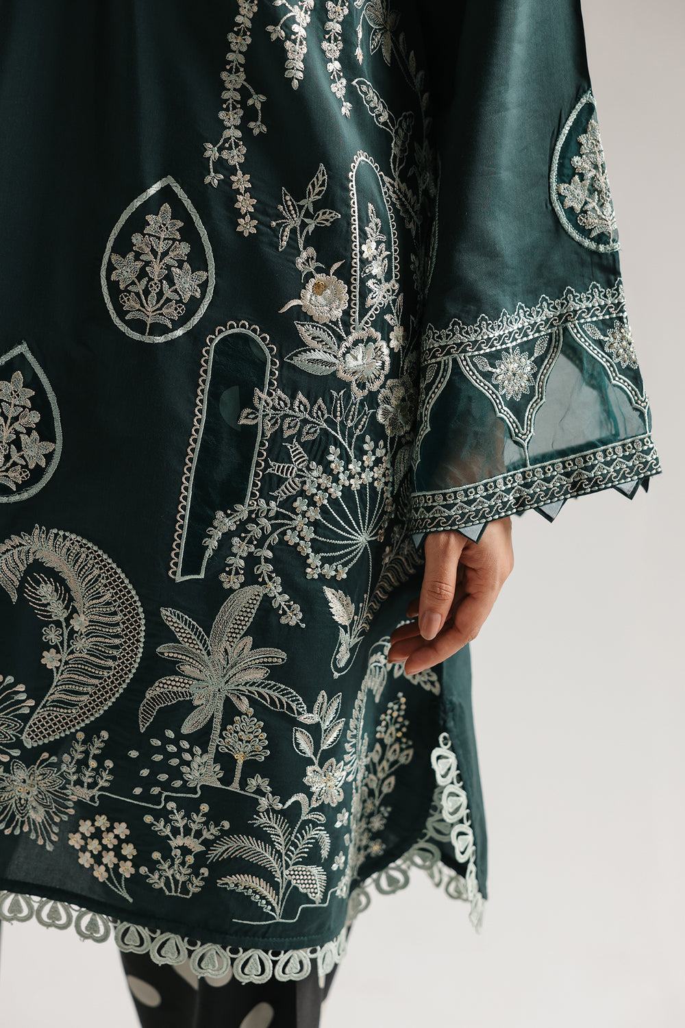 Make a lush and artistic statement with this forest-green suit, featuring a straight-cut shirt paired with playful polka-dot trousers. The shirt is designed with a sophisticated V-neckline and intricate ivory embroidery that showcases teardrop motifs, tropical palm trees, and a dense ornamental border along the hemline. The wide sleeves feature matching needlework and delicate lace inserts at the cuffs, while the ensemble is grounded by black wide-leg trousers adorned with large white polka dots and traditional border prints at the hem. This piece offers a perfect blend of botanical-inspired artistry and modern, eclectic style.