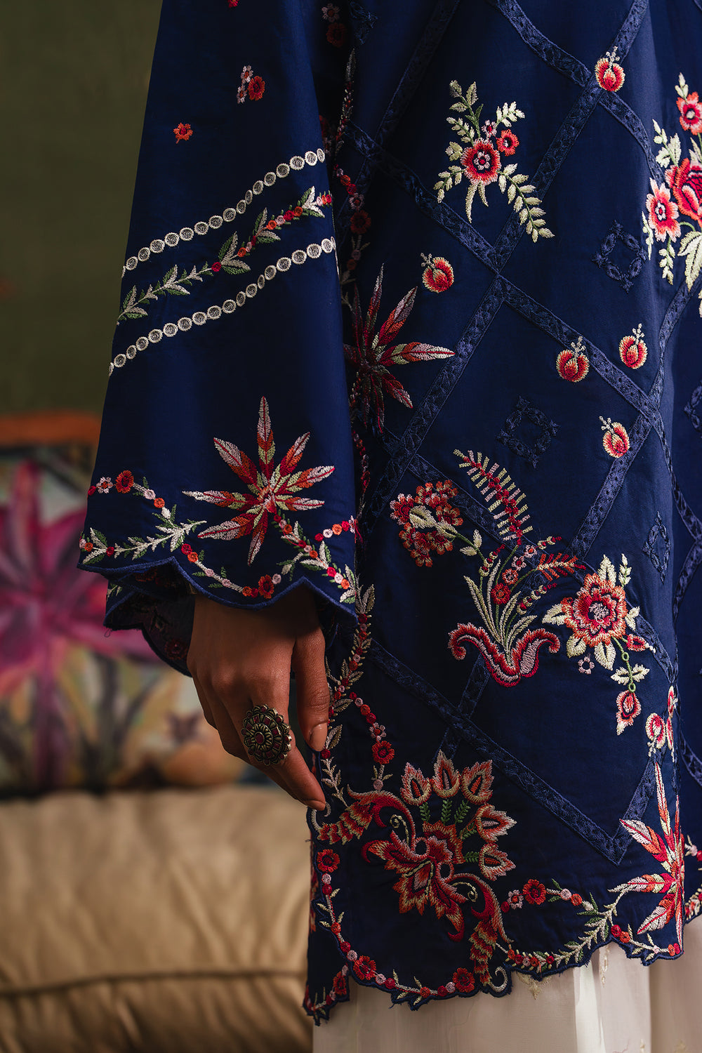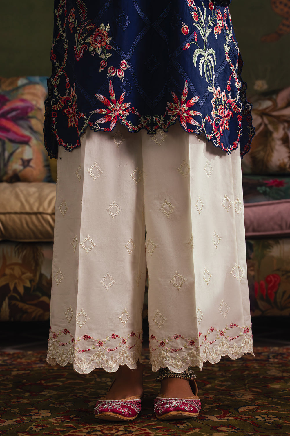 This striking embroidered suit presents a bold contrast of deep navy and pristine white with masterful artisanal detail. The navy kurta features a flattering V-neckline and scalloped hem, embellished with an intricate lattice pattern and vibrant floral embroidery in red, peach, and white tones. Bell-style sleeves showcase horizontal lace inserts with matching scalloped edges, creating a cohesive design narrative. The accompanying white wide-leg trousers are delicately finished with refined Chikankari or laser-cut embroidery at the hem, offering an airy counterpoint to the richly adorned top. This ensemble balances dramatic color contrast with sophisticated embroidery work, making it an exceptional choice for festive occasions and formal celebrations.